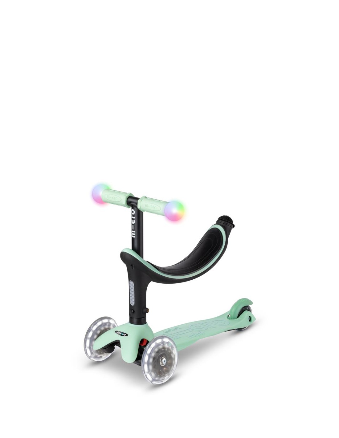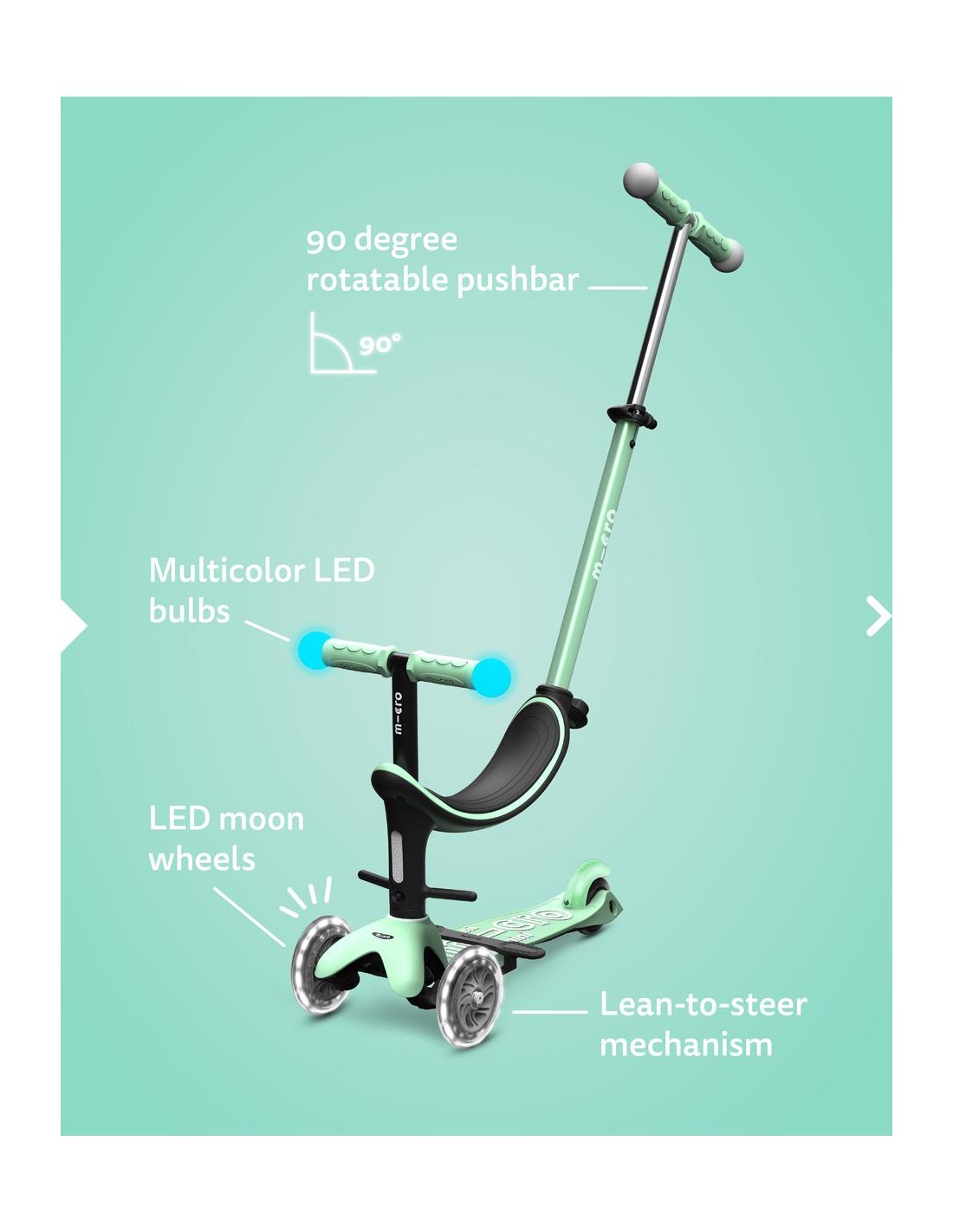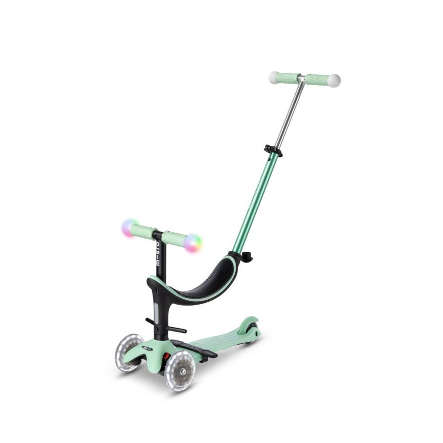 El innovador y ergonómico patinete todo en uno se puede utilizar en diferentes variantes: al principio con asiento, dos opciones de reposapiés y barra de empuje para los padres, posteriormente sin barra de empuje, como una mezcla entre bicicleta de equilibrio y patinete y finalmente como un Mini Micro Deluxe clásico con luces LED mágicas en los extremos del manillar y ruedas lunares LED.