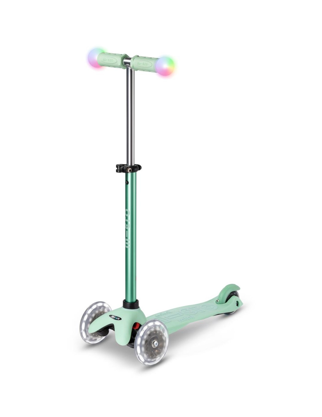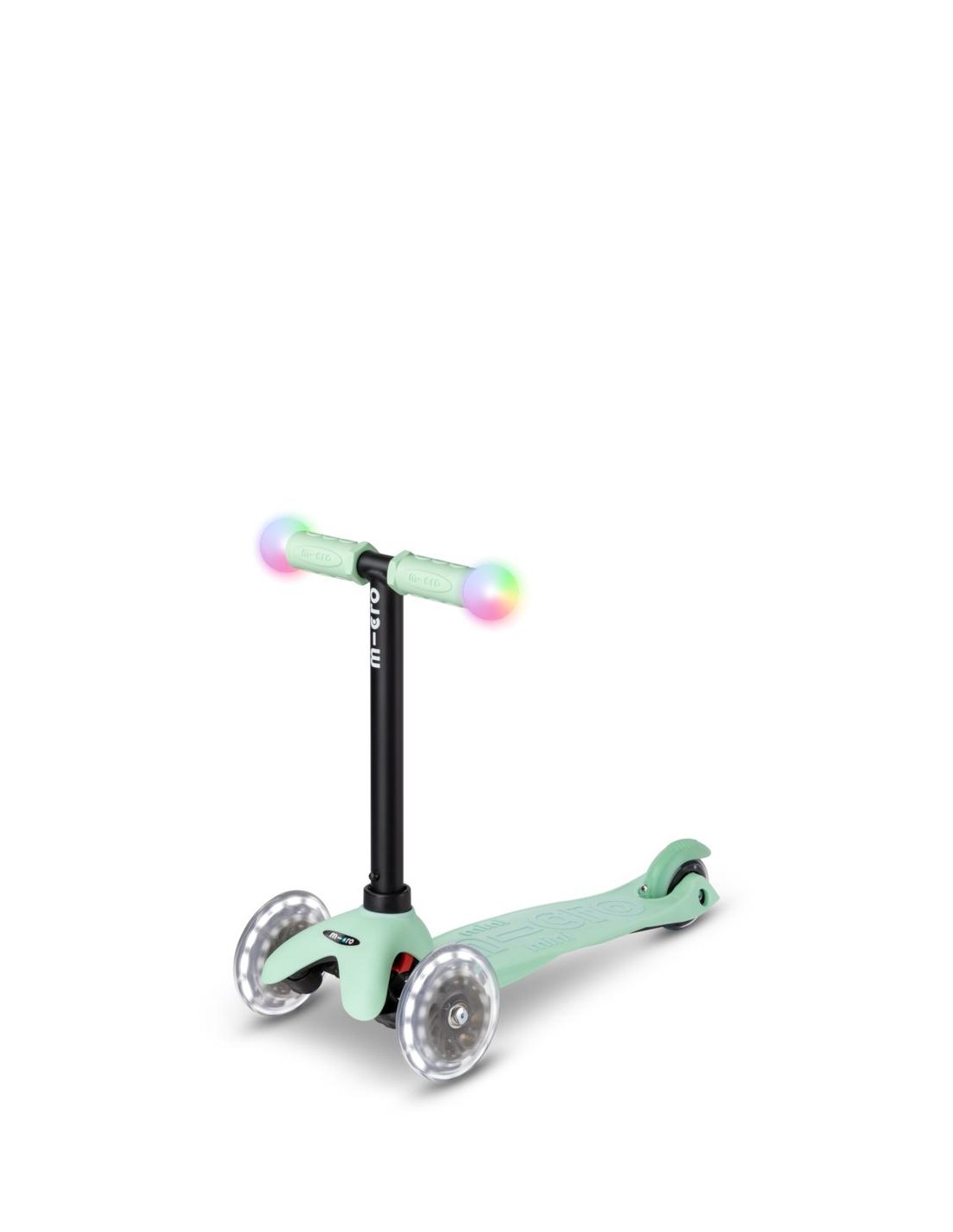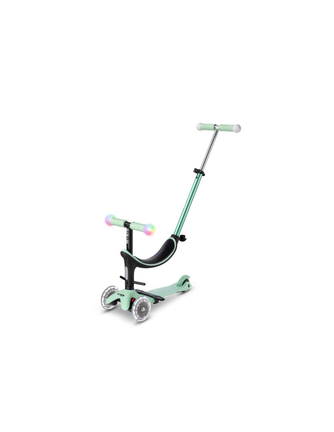 El innovador y ergonómico patinete todo en uno se puede utilizar en diferentes variantes: al principio con asiento, dos opciones de reposapiés y barra de empuje para los padres, posteriormente sin barra de empuje, como una mezcla entre bicicleta de equilibrio y patinete y finalmente como un Mini Micro Deluxe clásico con luces LED mágicas en los extremos del manillar y ruedas lunares LED.