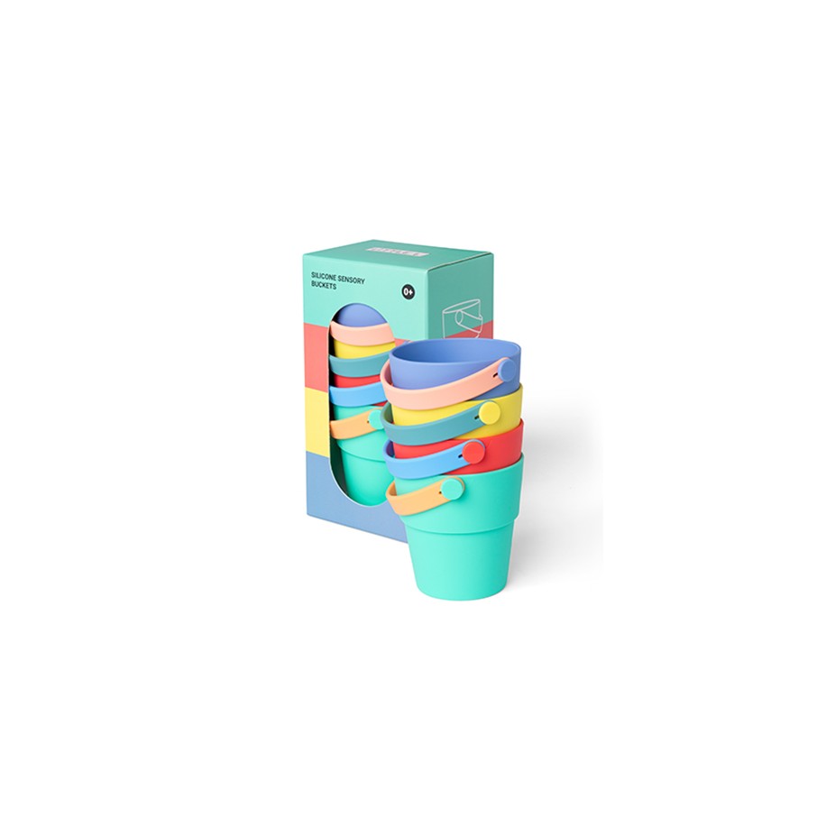 Con estos cuatro cubos con asa cada uno, podemos trasladar agua del uno al otro y jugar a mil juegos dejando ir la imaginación. De vivos colores, blanditos y fácil manipuilación.