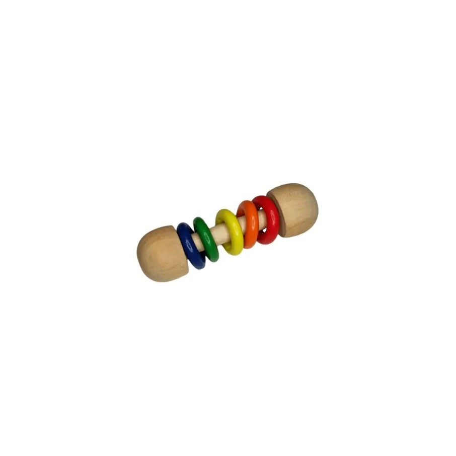 El sonajero de madera con anillas de colores es un material afín a la metodología Montessori. Tiene múltiples funciones que se pueden utilizar des de los primeros meses del bebé. Su forma invita a agarrarlo, moverlo, chuparlo y los anillos de colores nos permiten hacer sonido al moverlos.