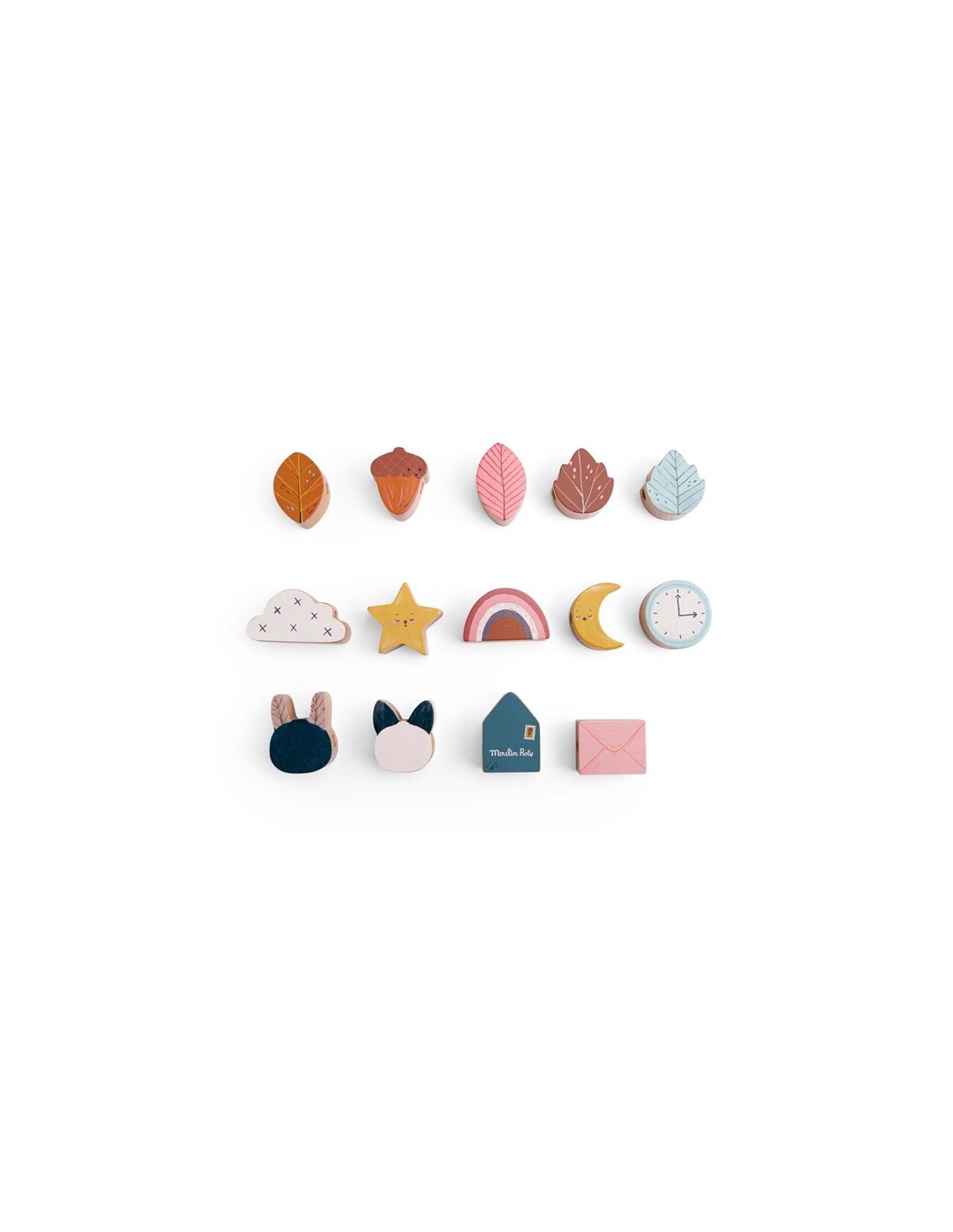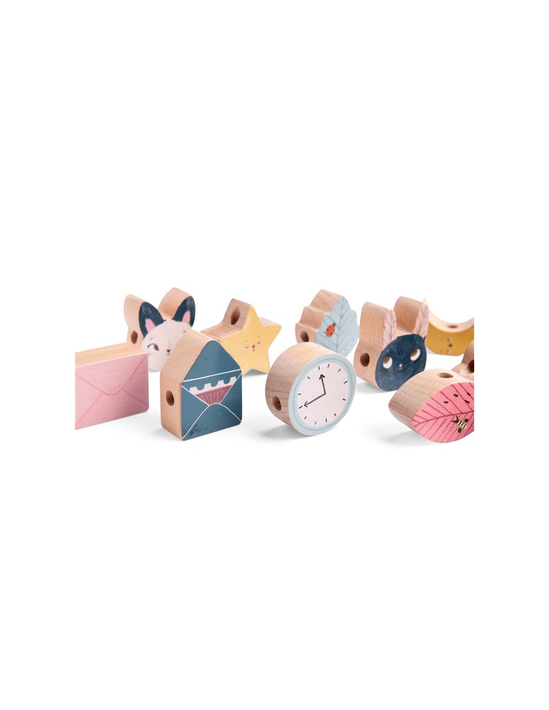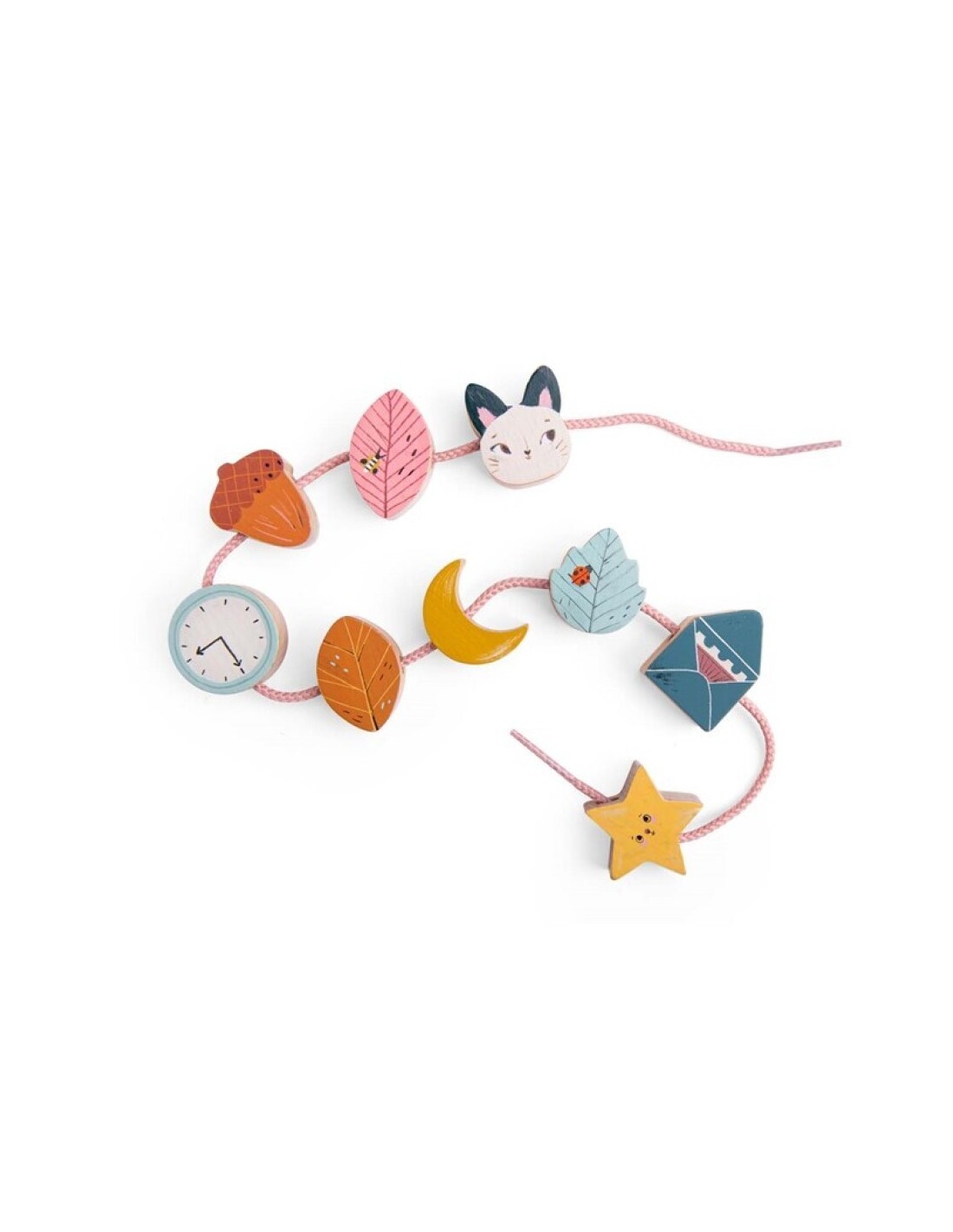 El juego consta de 14 cuentas de madera de diferentes colores y formas como hojas, estrella, nube, arco iris... dos cordones largos y una bolsa para guardar todo.