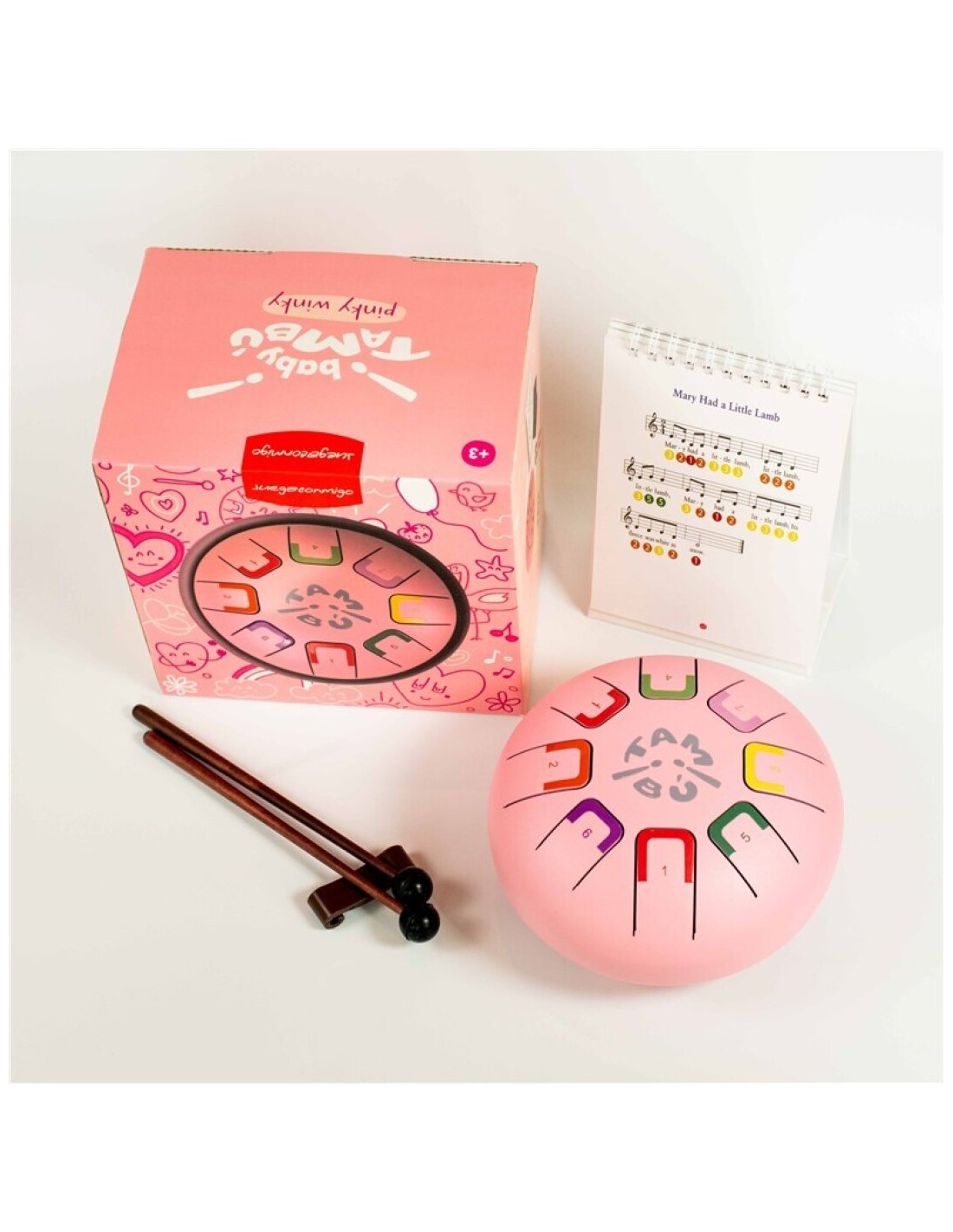 Al igual que el Tambú grande, este Baby Tambú tiene un sonido aterciopelado y suele estar vinculados a talleres de relajación. Con 8 lengüetas y dos baquetas.
