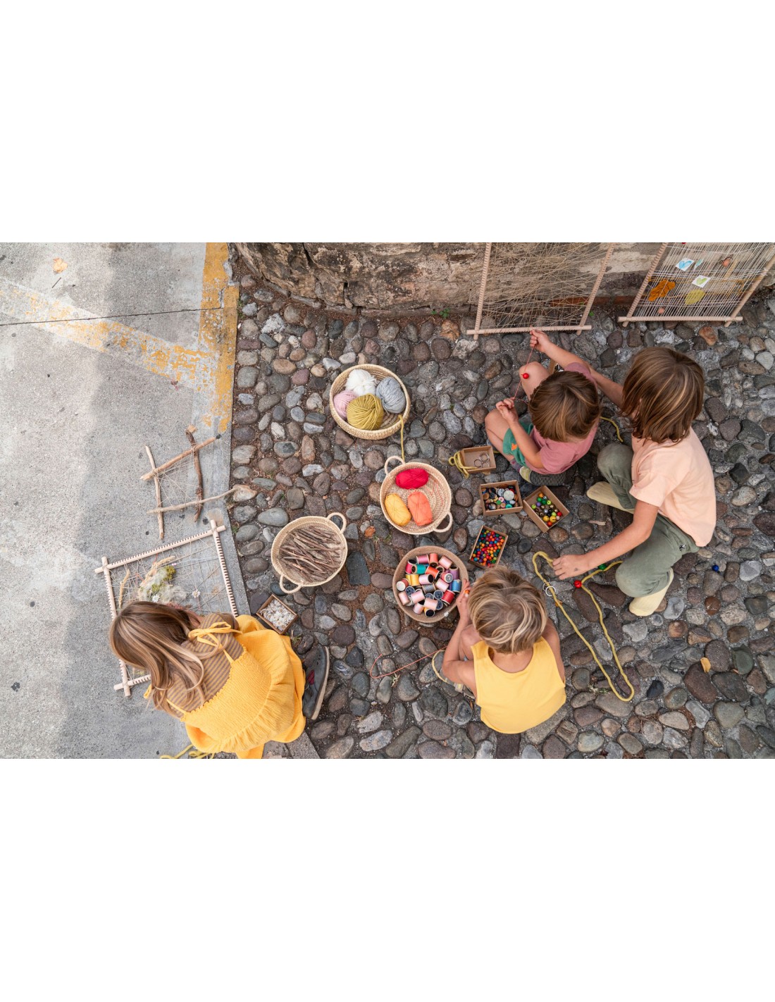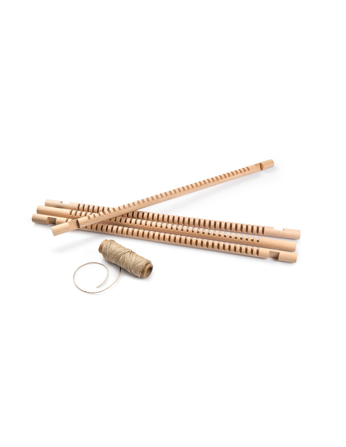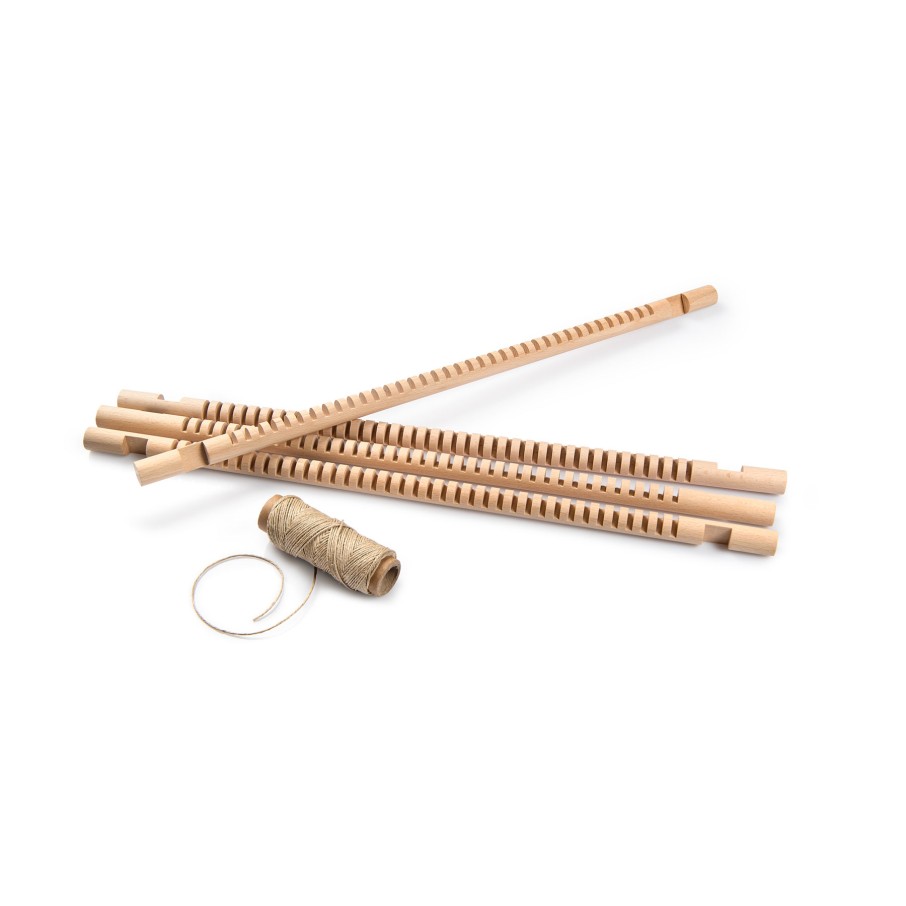 Un conjunto compuesto por 4 palos con pequeñas hendiduras, e hilo de cáñamo, perfecto para montajes de temporada o cualquier otra actividad de exposición creativa.