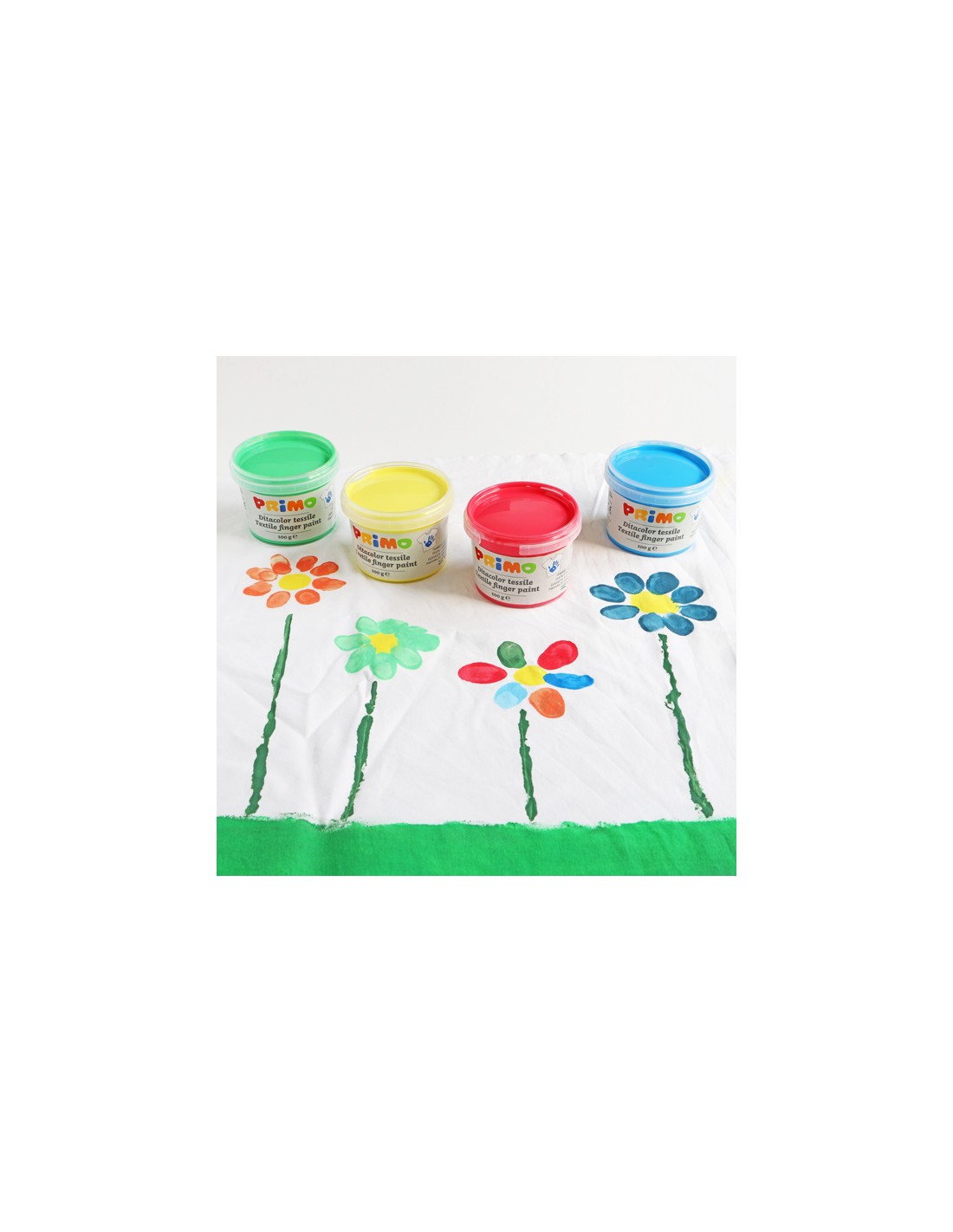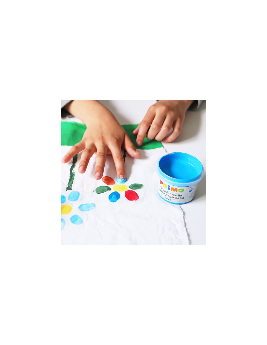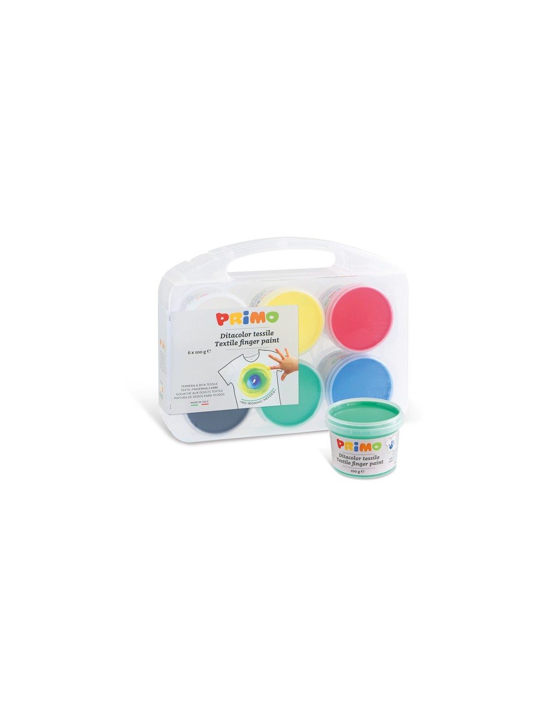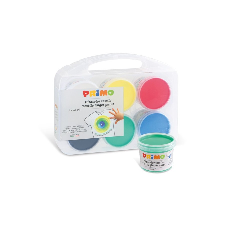Pintura textil para dedos en bote, lista para usar, en práctico estuche reutilizable, 6 colores. Dermatológicamente testado. Apto para el contacto con la piel, está dirigido a la primera infancia y está expresamente diseñado para ser aplicado con los dedos sobre tejidos. Suave y agradable al tacto, es fácil de aplicar. Perfectamente seco mantiene un color intenso, sin agrietarse incluso si se aplica en capas gruesas y se vuelve permanente. Durante su uso se recomienda proteger su ropa y superficie de trabajo. No requiere fijación pero se debe dejar secar perfectamente durante al menos 24 horas a temperaturas entre 18 y 25 °C. Si desea planchar, coloque la parte coloreada sobre papel de horno y planche por el revés, teniendo cuidado de colocar un trapo por el revés para evitar ensuciar la plancha. Una vez seco no se puede lavar de telas. Resistente al lavado a 30°. Elimine inmediatamente cualquier mancha no deseada según las instrucciones.