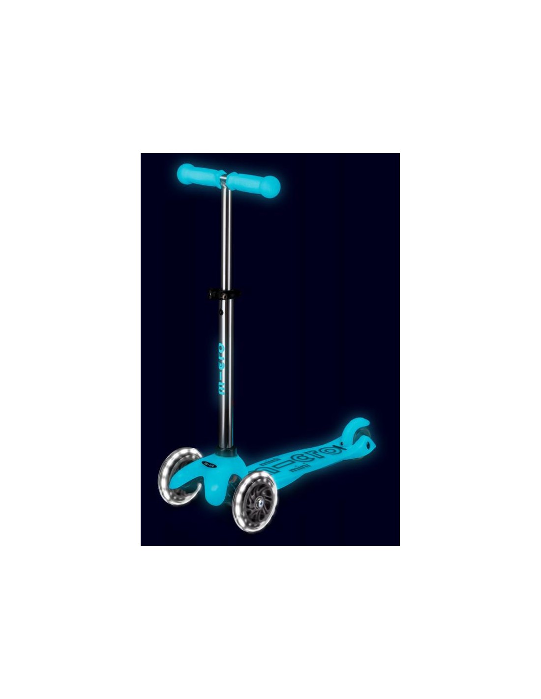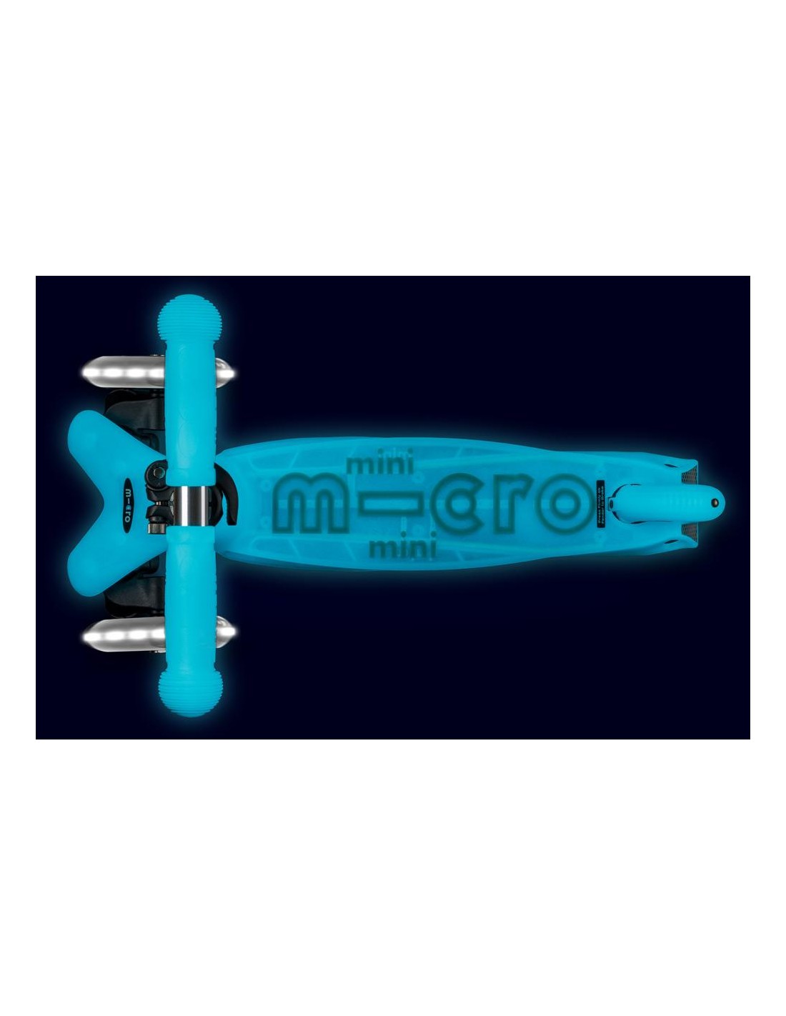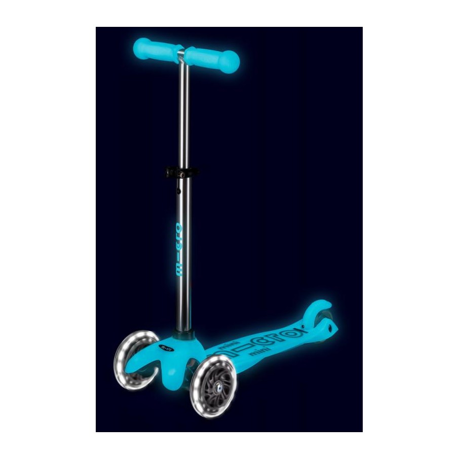 El Mini Micro ha sido elegido numerosas veces juguete del año por padres y madres. Este juguete deportivo no solo fomenta el movimiento y el ejercicio, sino que también ayuda a los niños a mejorar el equilibrio, la coordinación y las habilidades motoras finas. El manillar diseñado en forma de T hace más segura su conducción y dispone de un cierre de seguridad que hace que solo los adultos puedan desmontarlo para guardarlo. Dispone de un sistema de giro por inclinación patentado. La plataforma está fabricada con fibra de vidrio lo cual le otorga resistencia y flexibilidad. Además incluye letras de goma en relieve que son antideslizantes facilitando el manejo del patinete y dando seguridad extra a nuestros pequeños. Incorporan unas ruedas LED que funcionan a través de una dinamo, por lo que no requieren de baterías, sino que funcionan solo cuando nos movemos. Emiten una brillante luz blanca que, además de ser divertida para nuestros pequeños, les da seguridad al ser vistos con mayor facilidad en momentos de oscuridad. Por ultimo y en absoluta primicia, tanto la plataforma como los puños y el logo del manillar brillan en la oscuridad. La luz ultravioleta del ambiente diurno carga esos componentes y al llevarlos a la oscuridad hacen que el patinete que de día tiene un tono pastel adquiera un tono neon brillante
