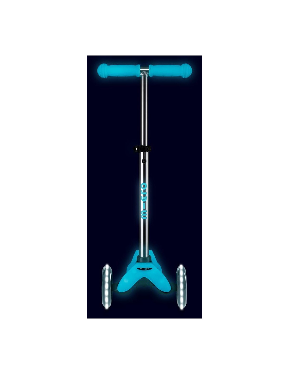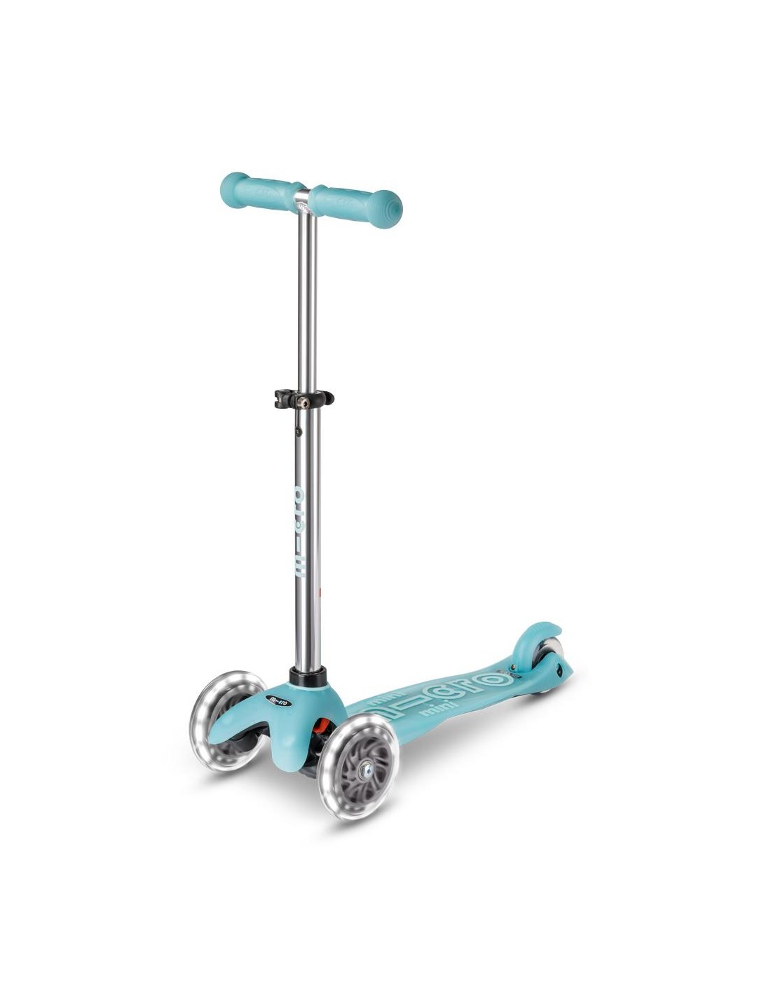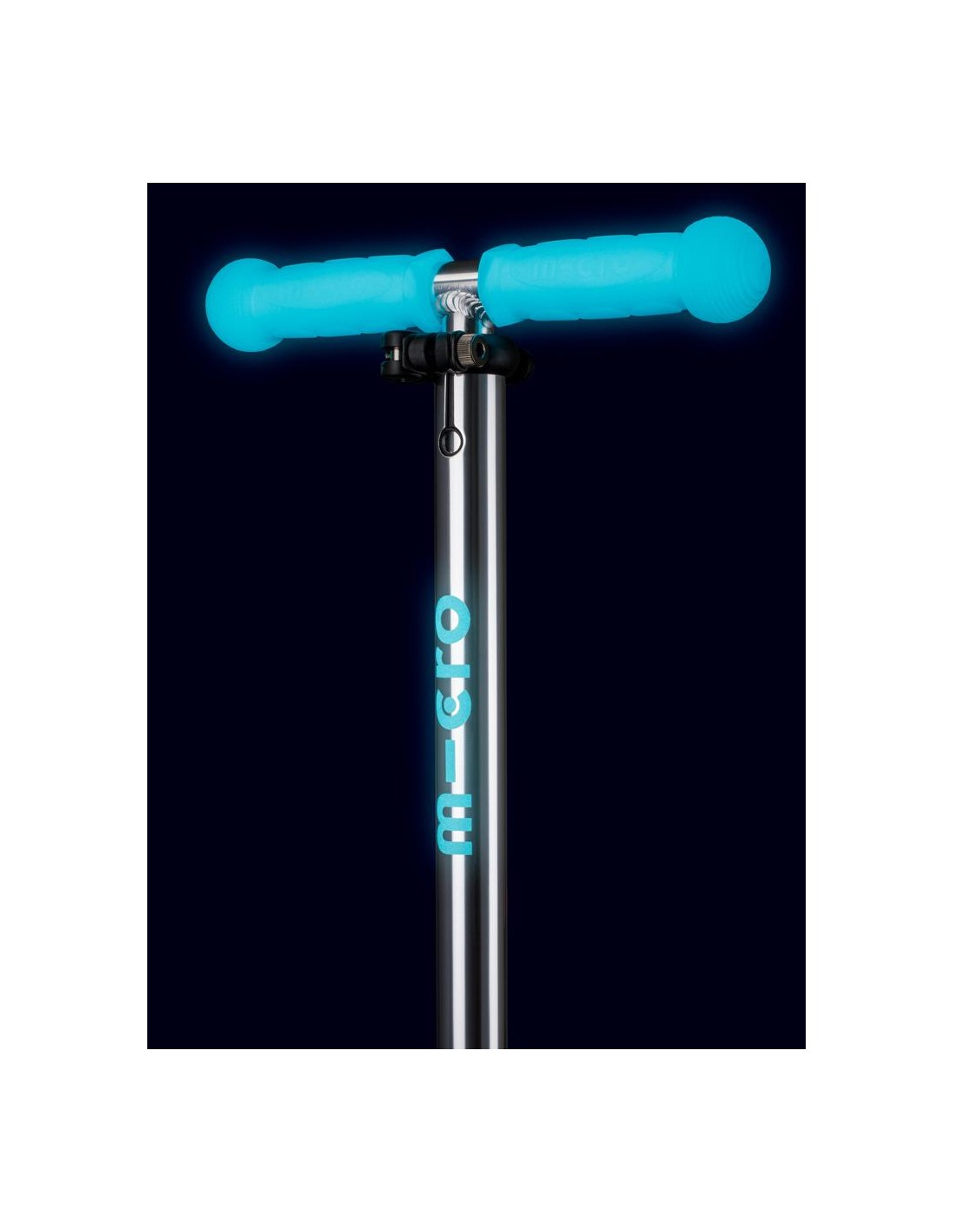El Mini Micro ha sido elegido numerosas veces juguete del año por padres y madres. Este juguete deportivo no solo fomenta el movimiento y el ejercicio, sino que también ayuda a los niños a mejorar el equilibrio, la coordinación y las habilidades motoras finas. El manillar diseñado en forma de T hace más segura su conducción y dispone de un cierre de seguridad que hace que solo los adultos puedan desmontarlo para guardarlo. Dispone de un sistema de giro por inclinación patentado. La plataforma está fabricada con fibra de vidrio lo cual le otorga resistencia y flexibilidad. Además incluye letras de goma en relieve que son antideslizantes facilitando el manejo del patinete y dando seguridad extra a nuestros pequeños. Incorporan unas ruedas LED que funcionan a través de una dinamo, por lo que no requieren de baterías, sino que funcionan solo cuando nos movemos. Emiten una brillante luz blanca que, además de ser divertida para nuestros pequeños, les da seguridad al ser vistos con mayor facilidad en momentos de oscuridad. Por ultimo y en absoluta primicia, tanto la plataforma como los puños y el logo del manillar brillan en la oscuridad. La luz ultravioleta del ambiente diurno carga esos componentes y al llevarlos a la oscuridad hacen que el patinete que de día tiene un tono pastel adquiera un tono neon brillante