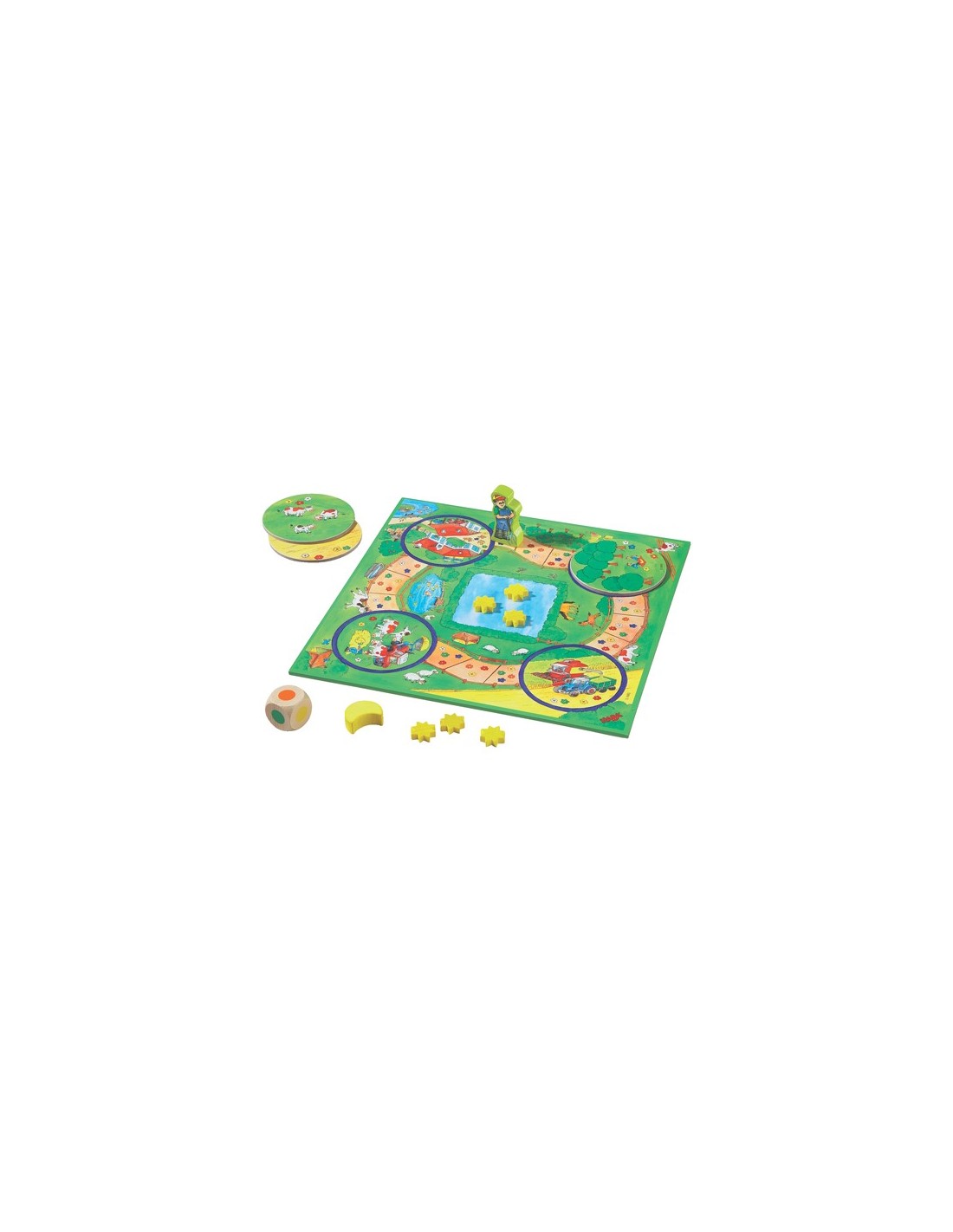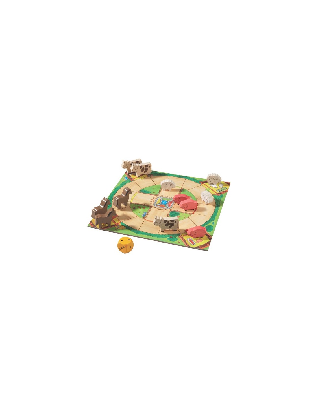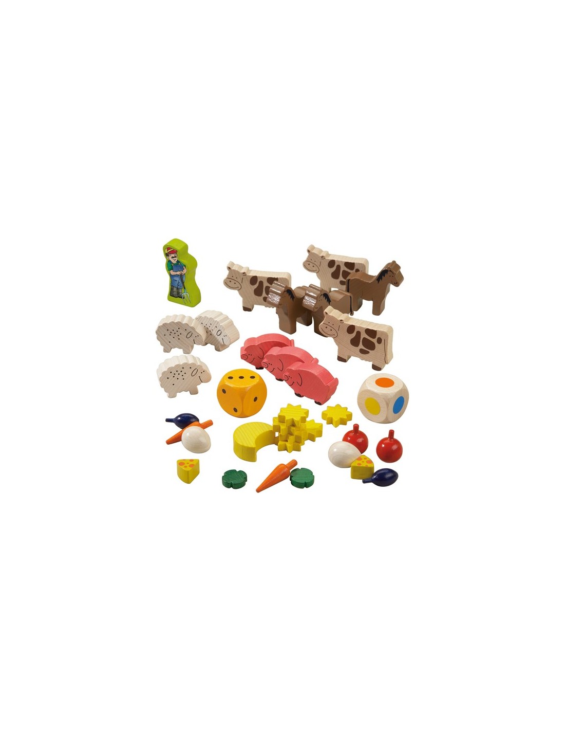 Contiene 3 caballos, 3 vacas, 3 cerdos, 3 ovejas, 2 manzanas rojas, 2 ciruelas, 2 huevos, 2 pedazos de queso, 2 hojas de lechuga, 2 zanahorias, 1 campesino, 1 dado de puntos, 1 dado de colores, 9 estrellas, 1 luna y las instrucciones de los juegos.