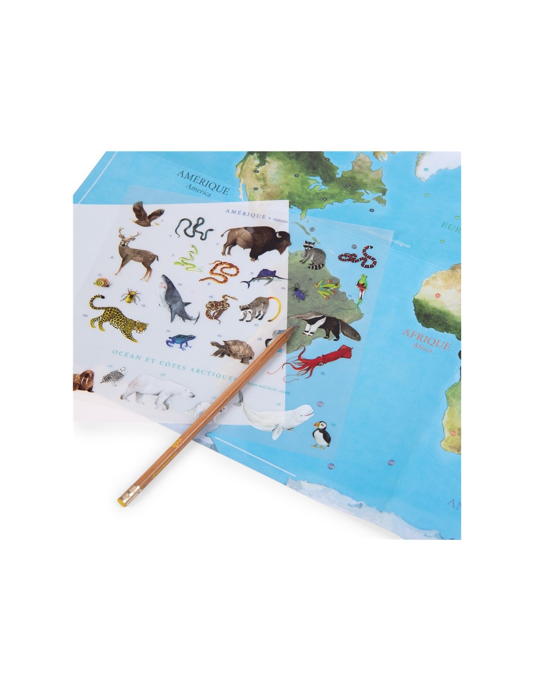 Coloca la calcomanía de cada animal encima de su hábitat y rasca por encima, quedará pegado en el mapamundi, ilustraciones muy realistas, genial para pasar un buen rato en familia, practicar la motricidad fina y aprender sobre fauna y geografía.