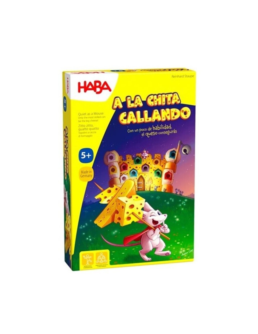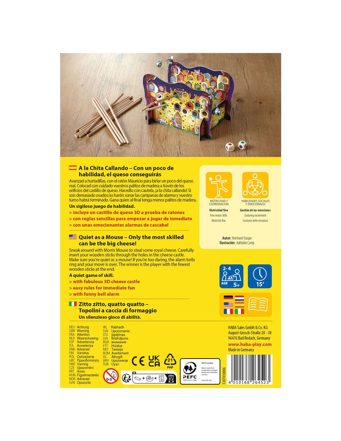 En silencio y con mucho cuidado los jugadores/as deben ir colocando los palos por los orificios del castillo sin que suene la campana y lograr así ser quién más haya colocado. Un divertido juego de habilidad en el que se necesita ser muy sigiloso/a. Precioso castillo 3D de madera.
