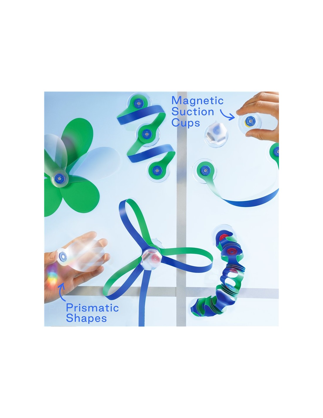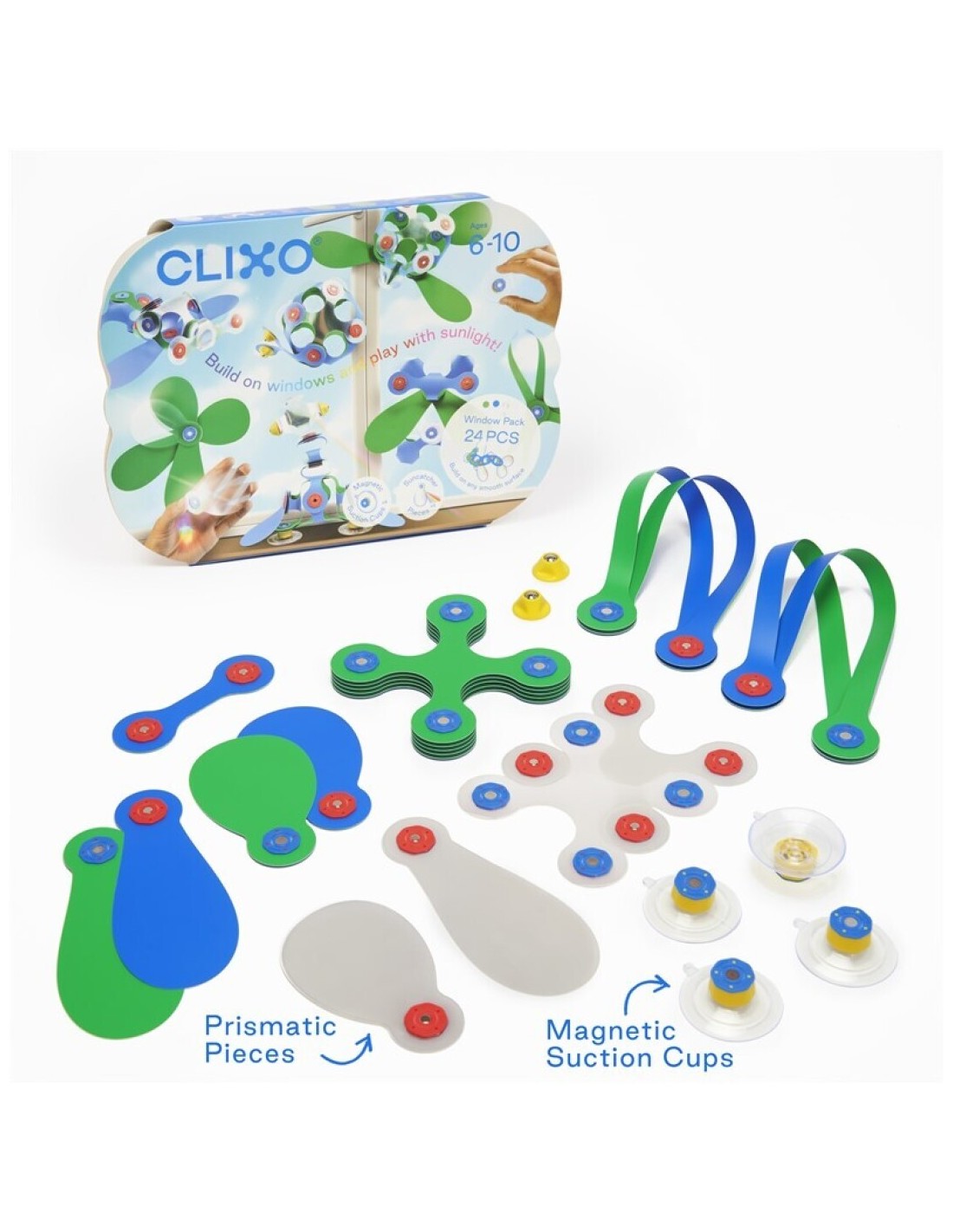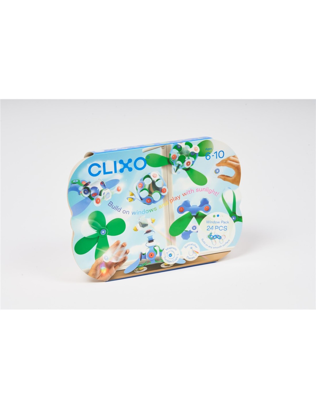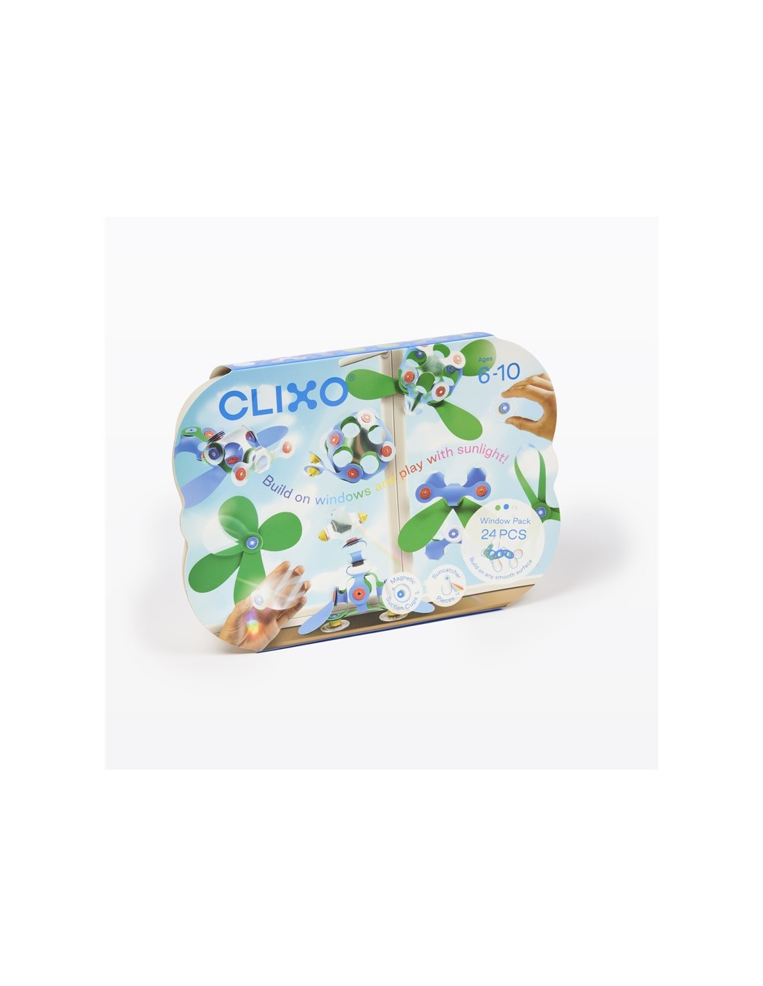 ¡Amplía los espacios de juego creativo de los niños con las piezas prismáticas holográficas que refractan la luz y crean arcoíris danzantes! El Window pack contiene 24 piezas en 10 formas únicas de CLIXO, incluidos los accesorios de ventosa (x4). ¡Los niños podrán construir caras divertidas, tubos colgantes o estructuras en ventanas y azulejos!