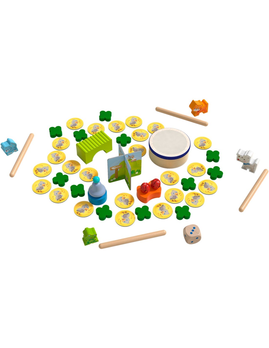 Contiene 1 tablero impreso por ambas caras (anverso «Camino Musical», reverso «Concierto de Animales»), 4 juguetes sonoros (tambor, sonajero, campana, abrazaderas), 5 varillas sonoras, 4 amigxs (la ratita Rita, el perro Pedro, la rana Rania y la gata Gala), 12 tréboles, 4 cartones impresos a doble cara (anverso «Partitura», reverso «4 Amigxs»), 24 fichas, 1 indicador (de 2 piezas, ensambladas), 1 dado y las instrucciones del juego.