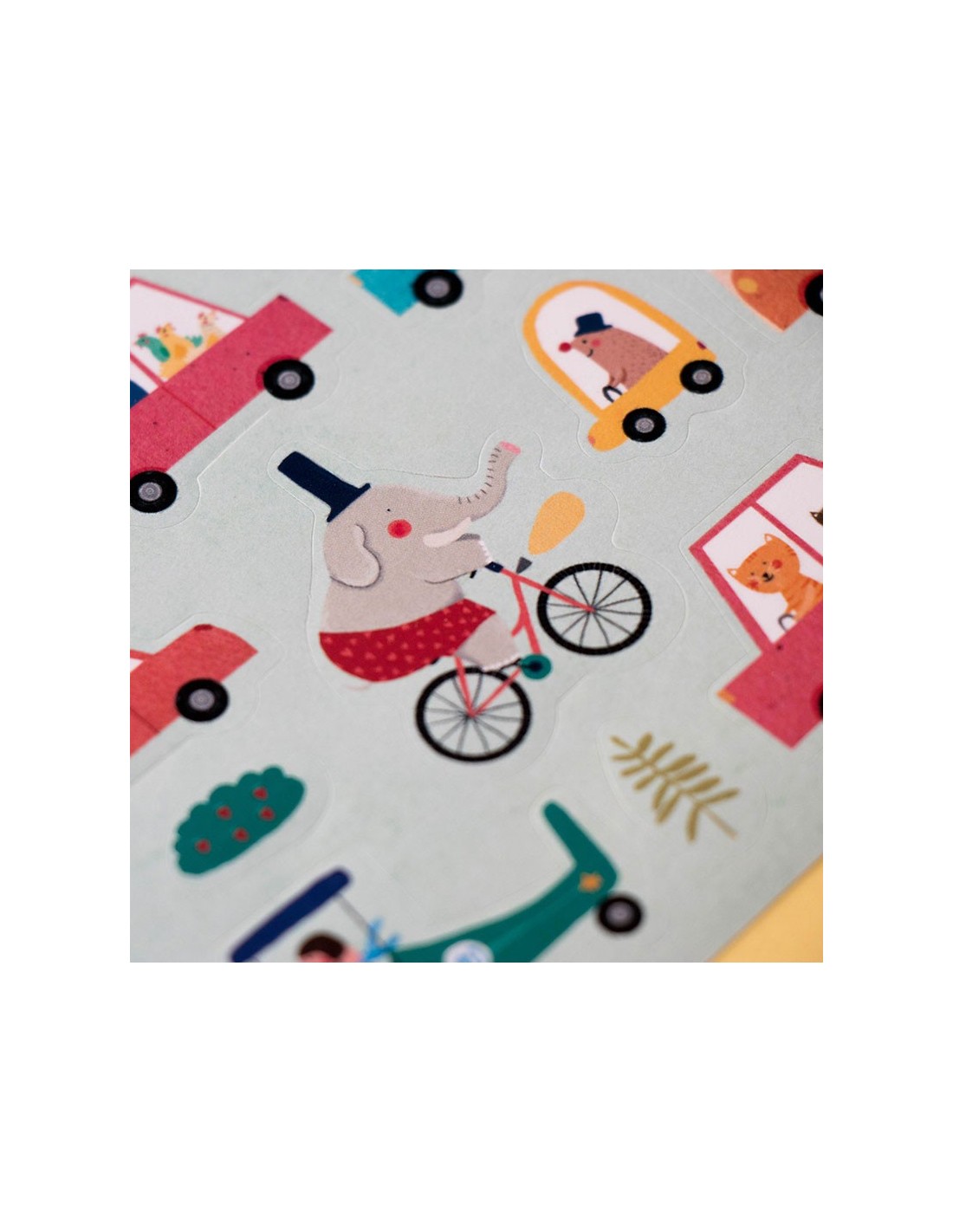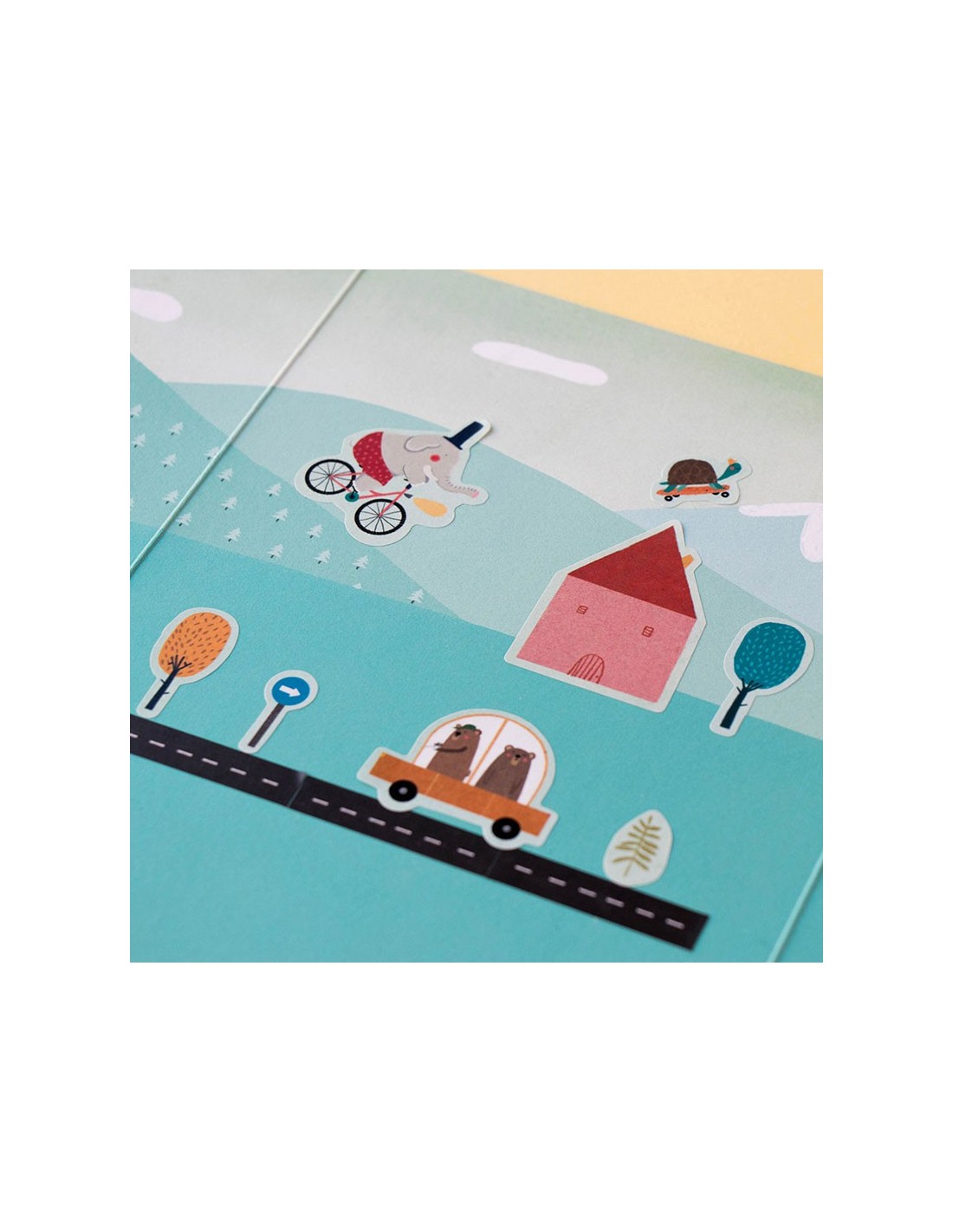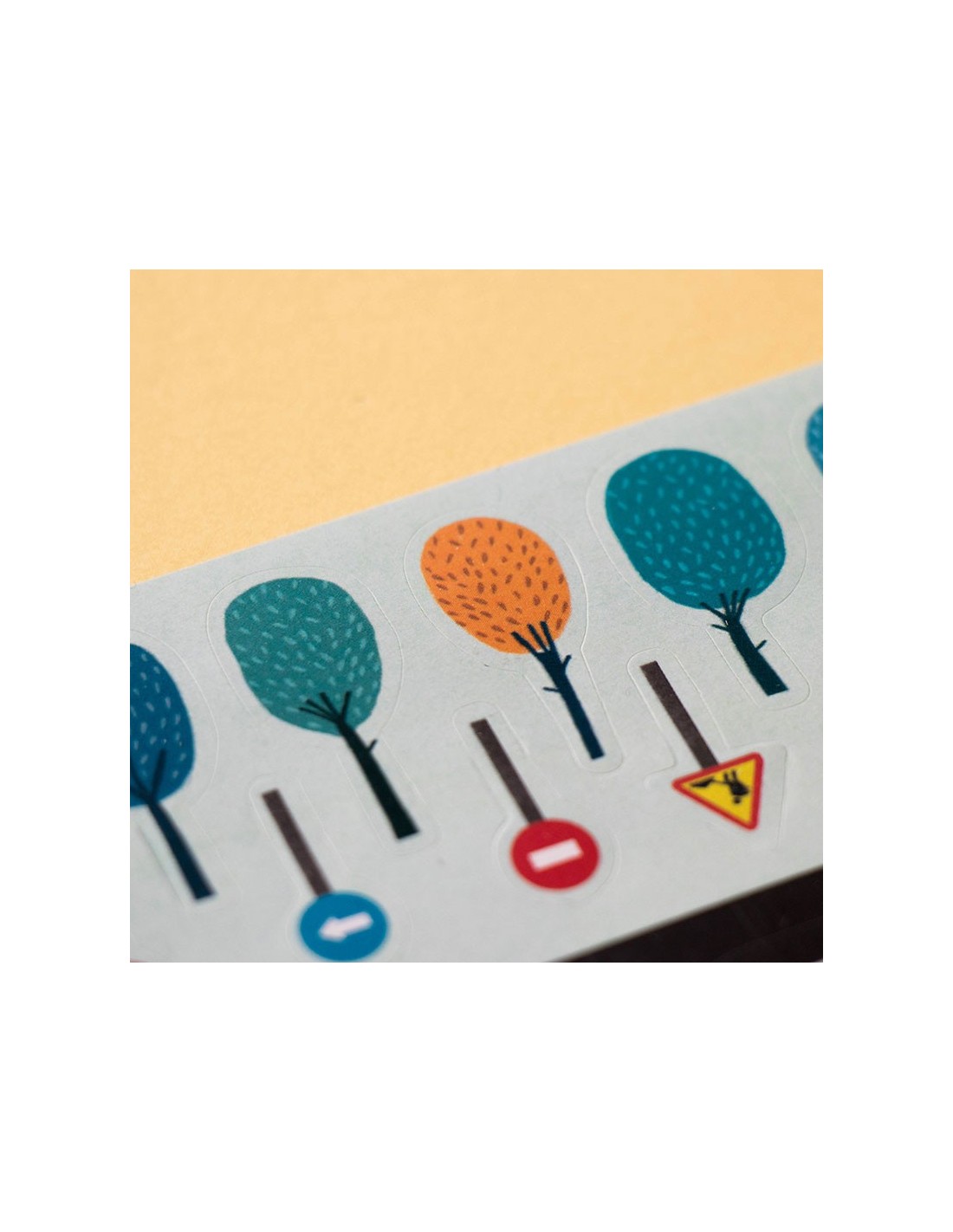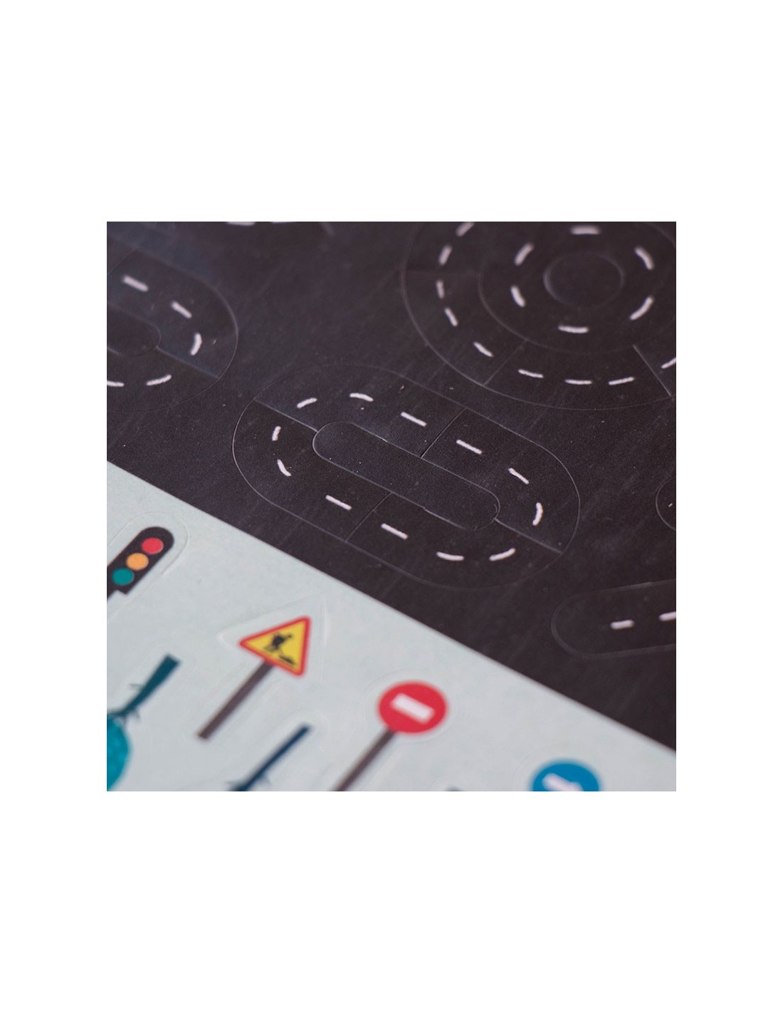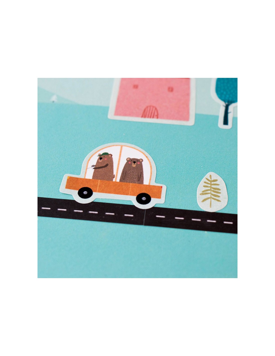 ¡Un juego con 150 pegatinas removibles de casas, coche, árboles, carreteras y señales de tráfico para que construyas la ciudad de tus sueños sobre tu escenario preferido!
