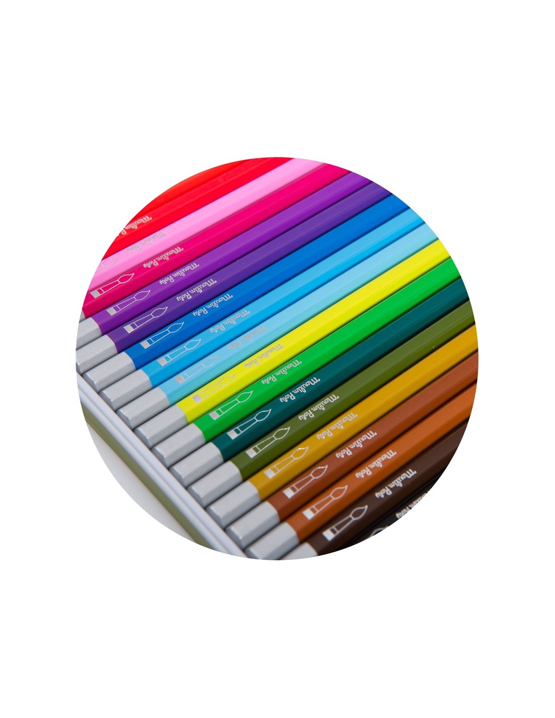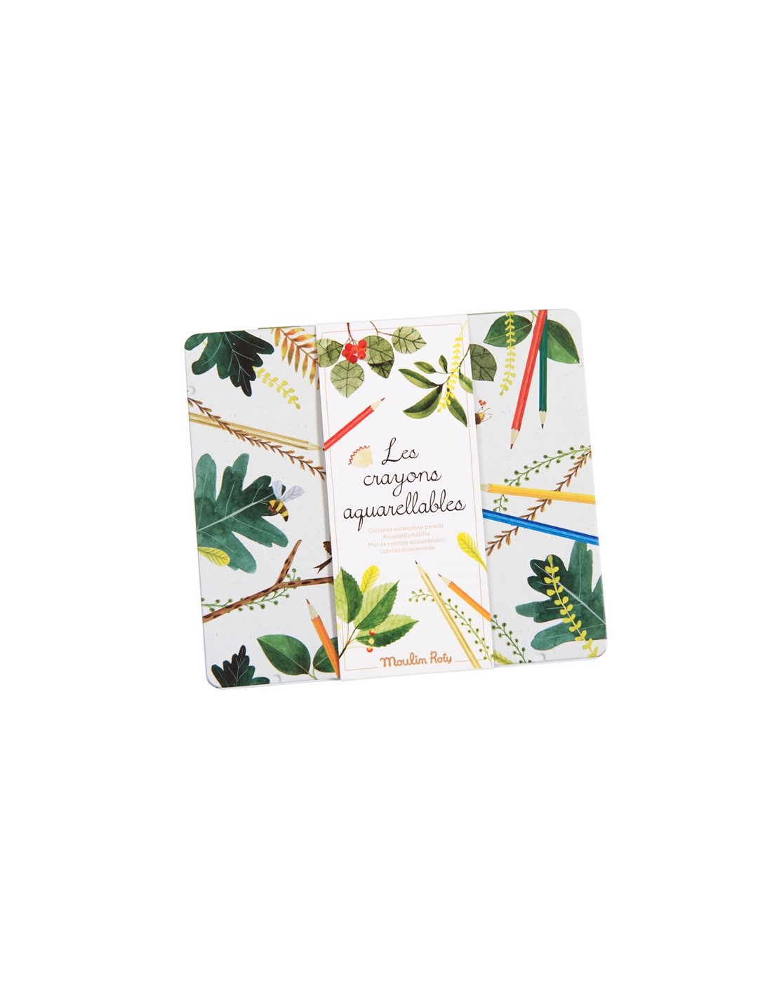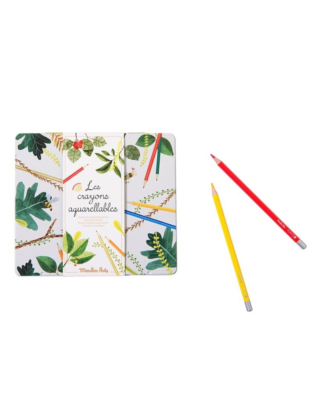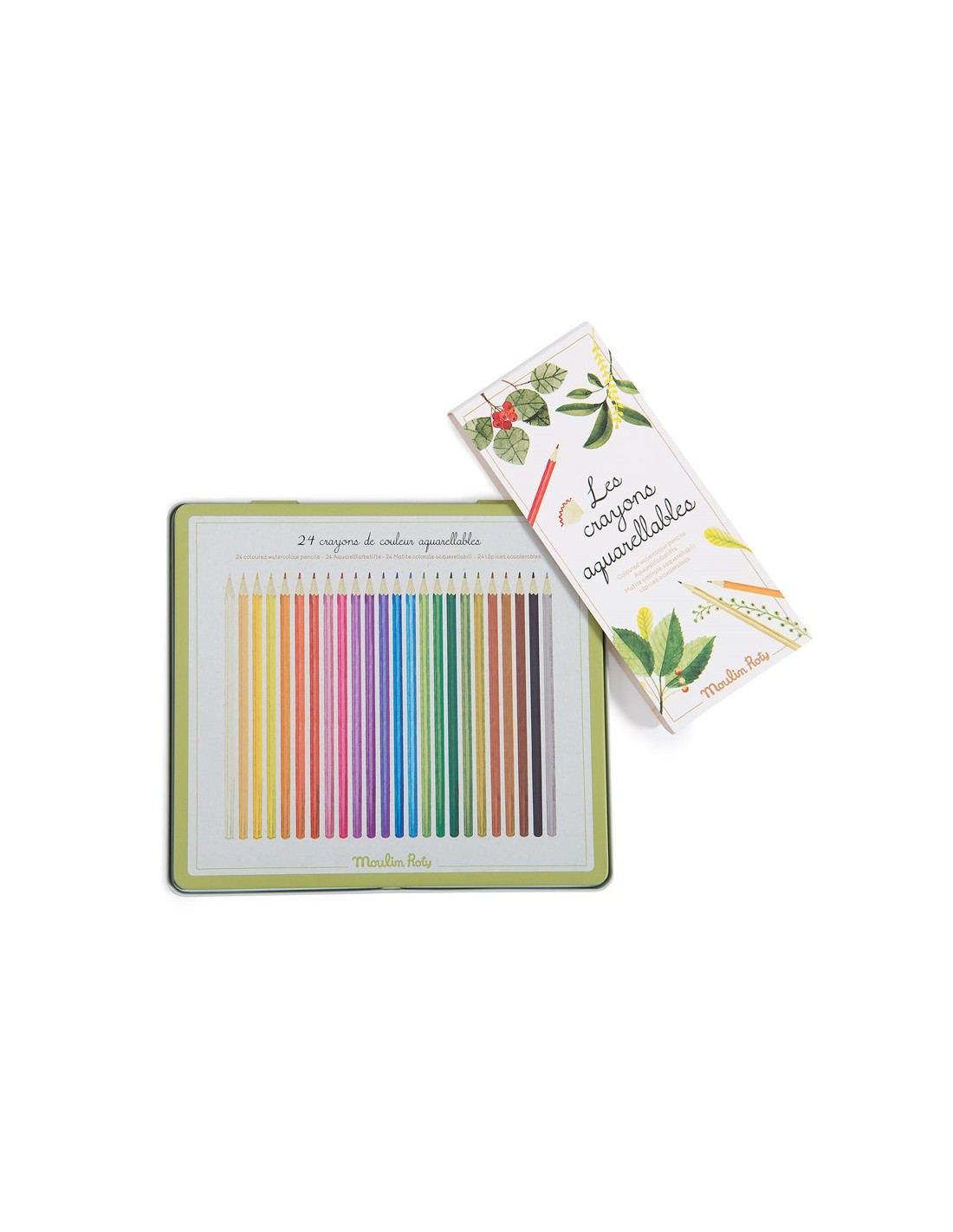 Caja de metal que contiene 24 lápices de colores para utilizar como clásico lápiz de colorear o para pintar con acuarela si se humedece.