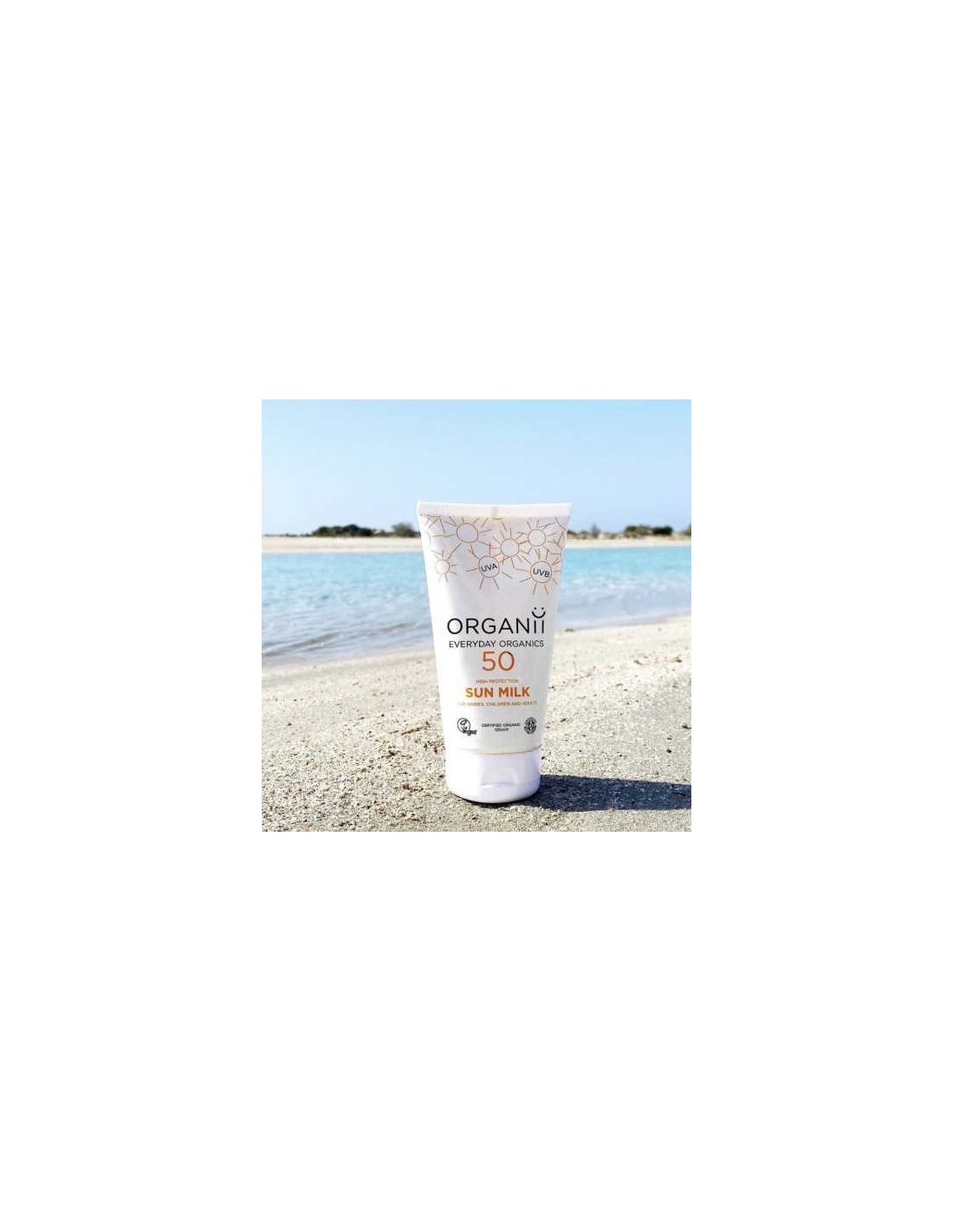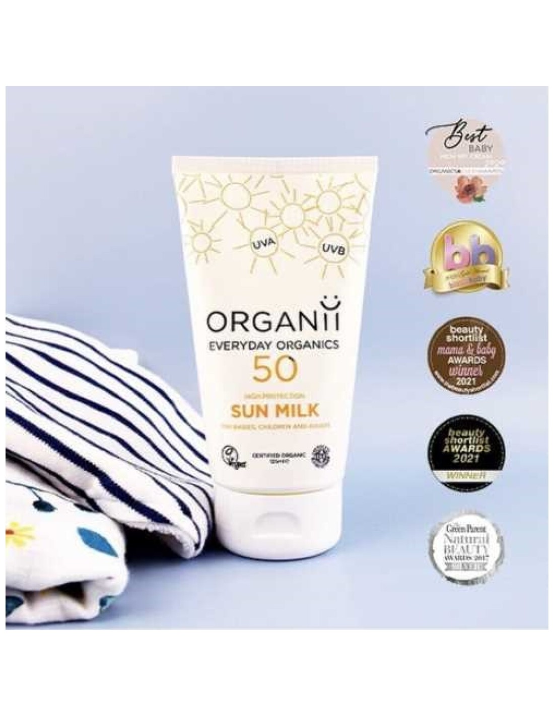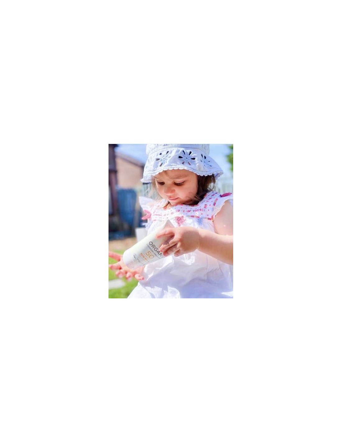 Adecuado para adultxs, niñxs y bebés, la leche solar ORGANii SPF50 contiene filtros solares