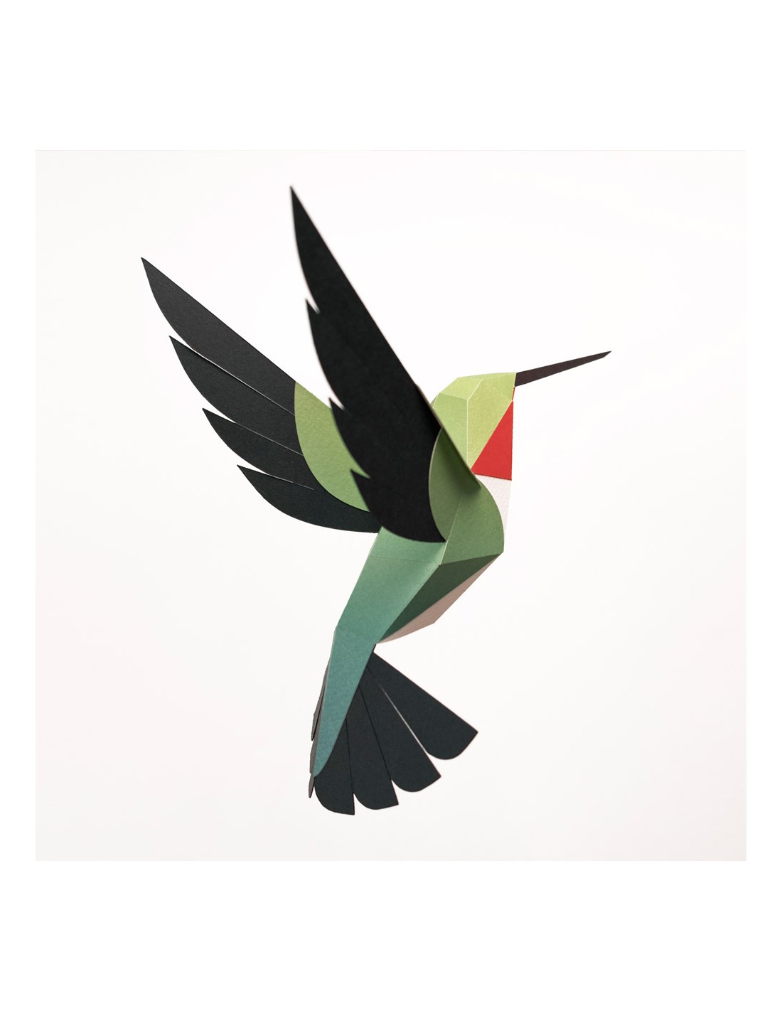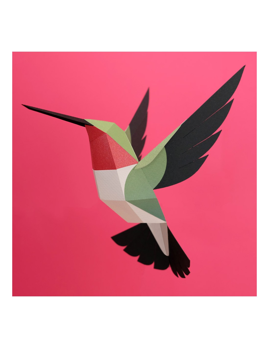 El kit contiene 4 papeles de arte de pulpa teñida, con un 50 % de algodón y resistentes a la luz, y 3 papeles con tintas metalizadas y tornasoladas, una ficha didáctica con las principales características del colibrí coliancho y unas instrucciones de montaje, todo en 8 idiomas diferentes. Las piezas vienen precortadas y marcadas para facilitar el plegado y montaje. Todos estos materiales se presentan en una carpeta atractiva y resistente. Es necesaria cola blanca de manualidades para pegar las piezas de la figura.
