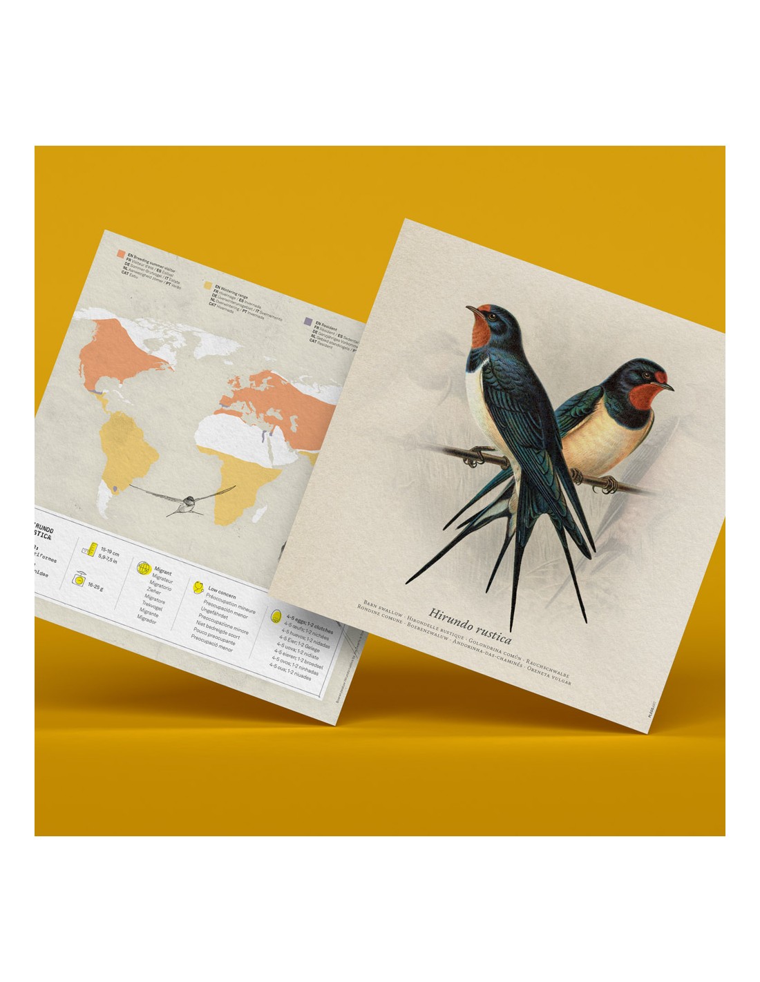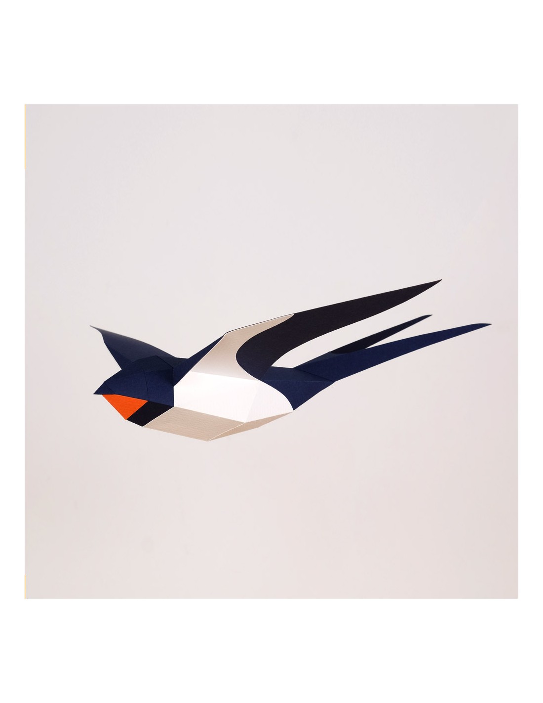 El kit contiene 4 papeles de arte de pulpa teñida, con un 50% de algodón y resistentes a la luz, una ficha didáctica con las principales características de la golondrina vulgar y unas instrucciones de montaje, todo en 8 idiomas diferentes. Las piezas vienen precortadas y marcadas para facilitar su plegado y montaje. Todos estos materiales se presentan en carpeta atractiva y resistente. Se necesita pegamento blanco de manualidades para pegar las piezas de la figura.