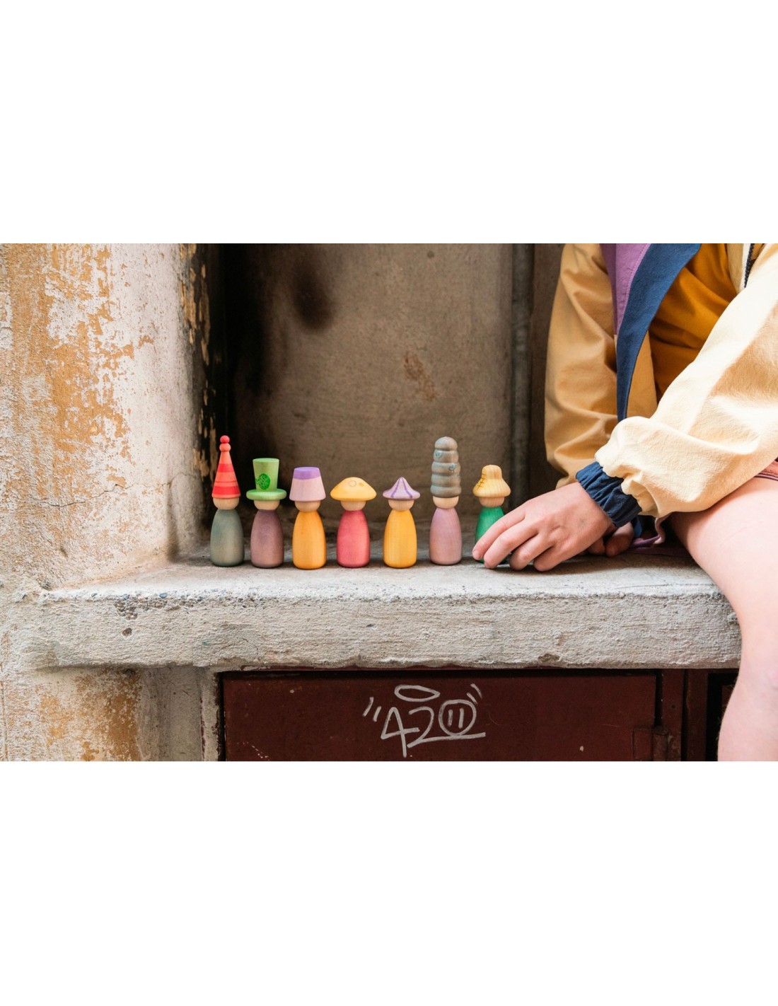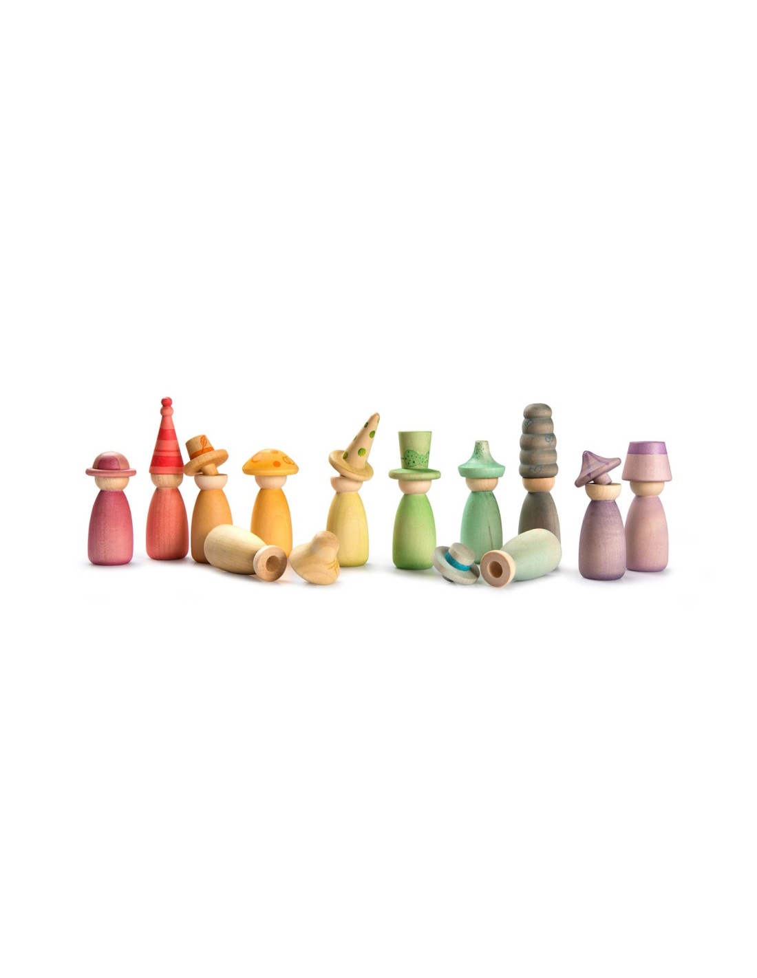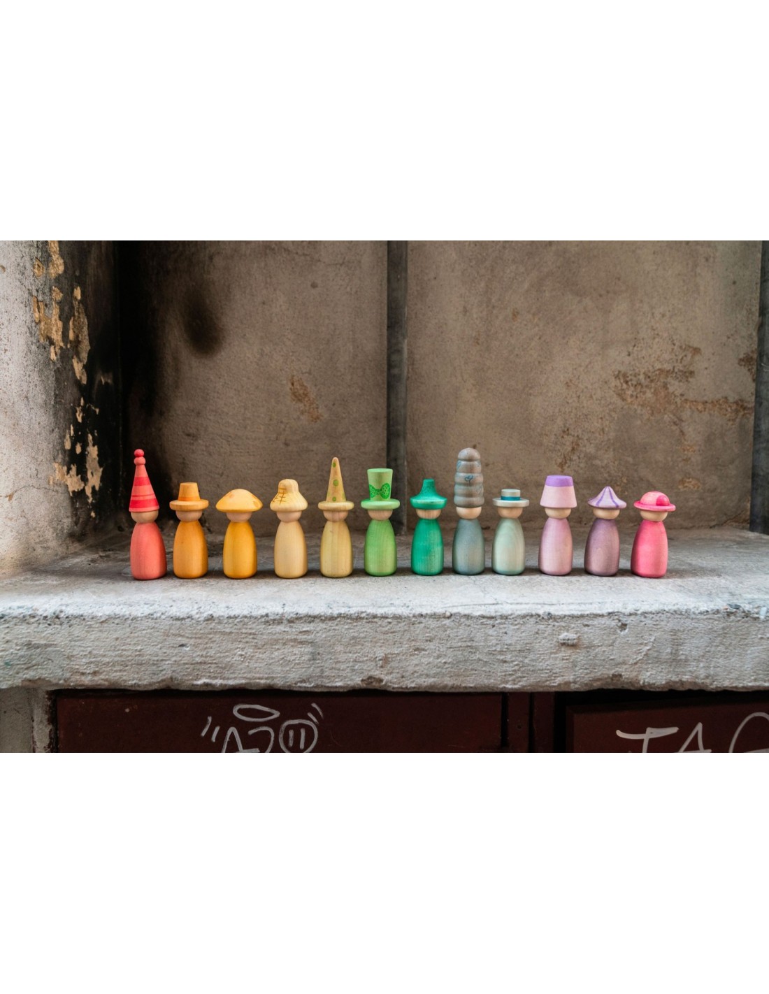 El set contiene 12 Nins teñidos a mano en nuestros 12 colores del arco iris con sombreros y cuerpos intercambiables para brindar aún más combinaciones de coloridas posibilidades a cada actividad de juego abierto.