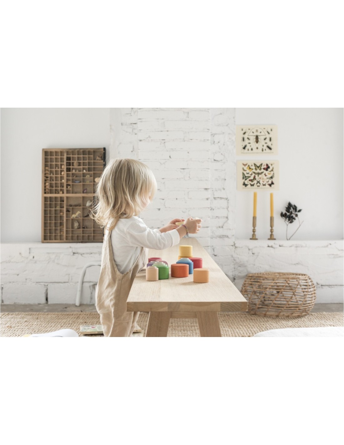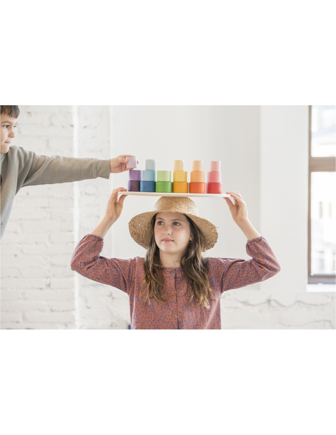 Cada uno de los 6 colores incluye 4 cuencos que degradan su tono de más brillante a un tono más claro. Puedes complementar el juego heurístico llenando y vaciando, transfiriendo y cargando, ocultando y descubriendo…. Estos cuencos de diferentes tamaños también permiten crear torres, y construcciones, así como esconder tesoros! o incluso hacer rodar unas dentro de otras. Estas 24 piezas permiten una gran variedad de juegos por la versatilidad del material