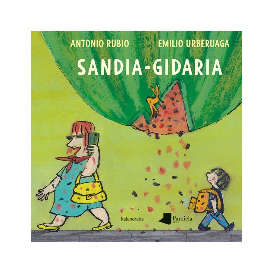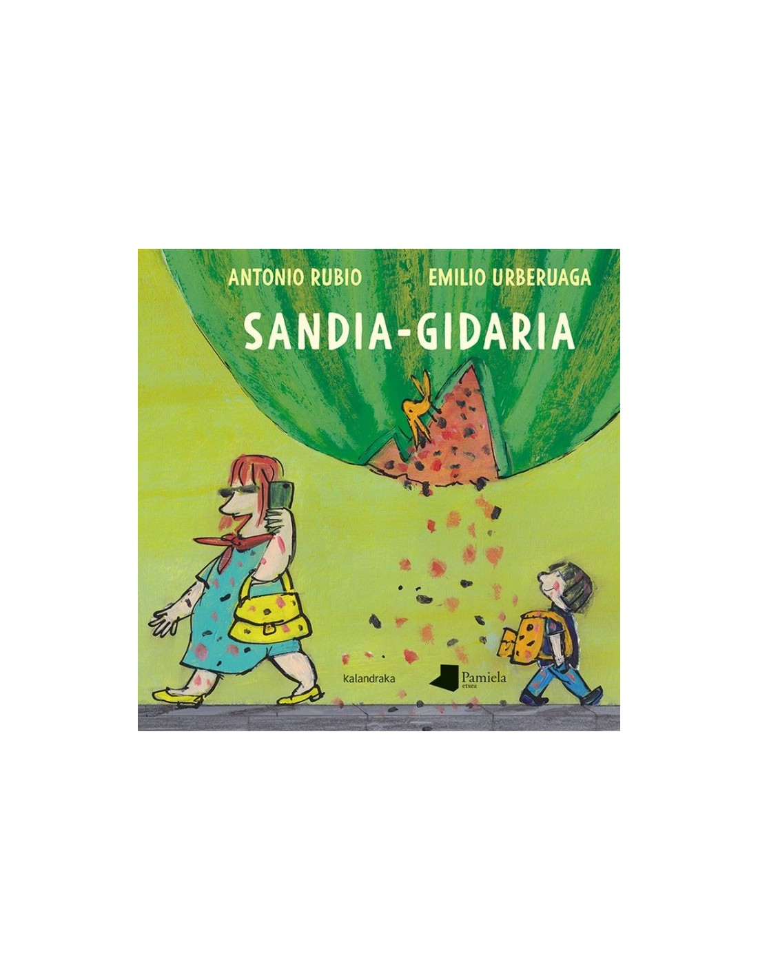 “Sandia-gidaria” hiri handi zoro eta alienatzaile batean girotua dagoen istorio polita da. Baina giro eskaseko halako lekuetan ere, gertatzen dira gauza harrigarriak, bereziak eta ezohikoak, bai horixe! Esaterako, gure kontakizun honetan, sandia-hazi bat ernetu, handitu, loratu eta kale-argi bati kiribildurik fruituak ematen ditu, parra argitsua bilakaturik. Testu errimatu hau Antonio Rubiok egina da, eta bere egitura erritmikoak eta osaerakoak tradiziozko literaturan dute jatorria, baina, hori bai, gaur egungo hiri giroko agertokian gure garaira ekarrita. Eraikuntzak eta merkataritza-guneak, zarataz gain-gain eginda joan-etorrian dabiltzan ehunka auto hartzen dituzten kaleak, estresak eta teknologia berriek biziki jota han-hemenka dabiltzan biztanleak, egun gu guztiontzat ezagun samarra den agertokira eramaten gaituzte. Nola haurtzaroko begirada gardenak eta lotsarik gabekoak, hala neska-mutikoen naturaltasunak eta sormenak ere errutina izugarri horrekikoak egin, eta, tak!, paisaia ilun eta kutsatua koloretsu eta baketsu bilakatzen dute. Emilio Urberuagaren ilustrazioek -kolore bizi eta anitzeko paleta, trazuen dinamismoa eta ekarpen grafiko burutsuak tarteko direla- istorioan bertan kontatzen deneko halako zerbait gure ingurumarian ere amestera eta irudikatzera gonbidatzen gaituzte; lehen begiratuan gehiengoaren begietara oharkabean pasatu eta munta gutxikoa denak oraina eta geroa markatuko ditu egunerokotasunean.