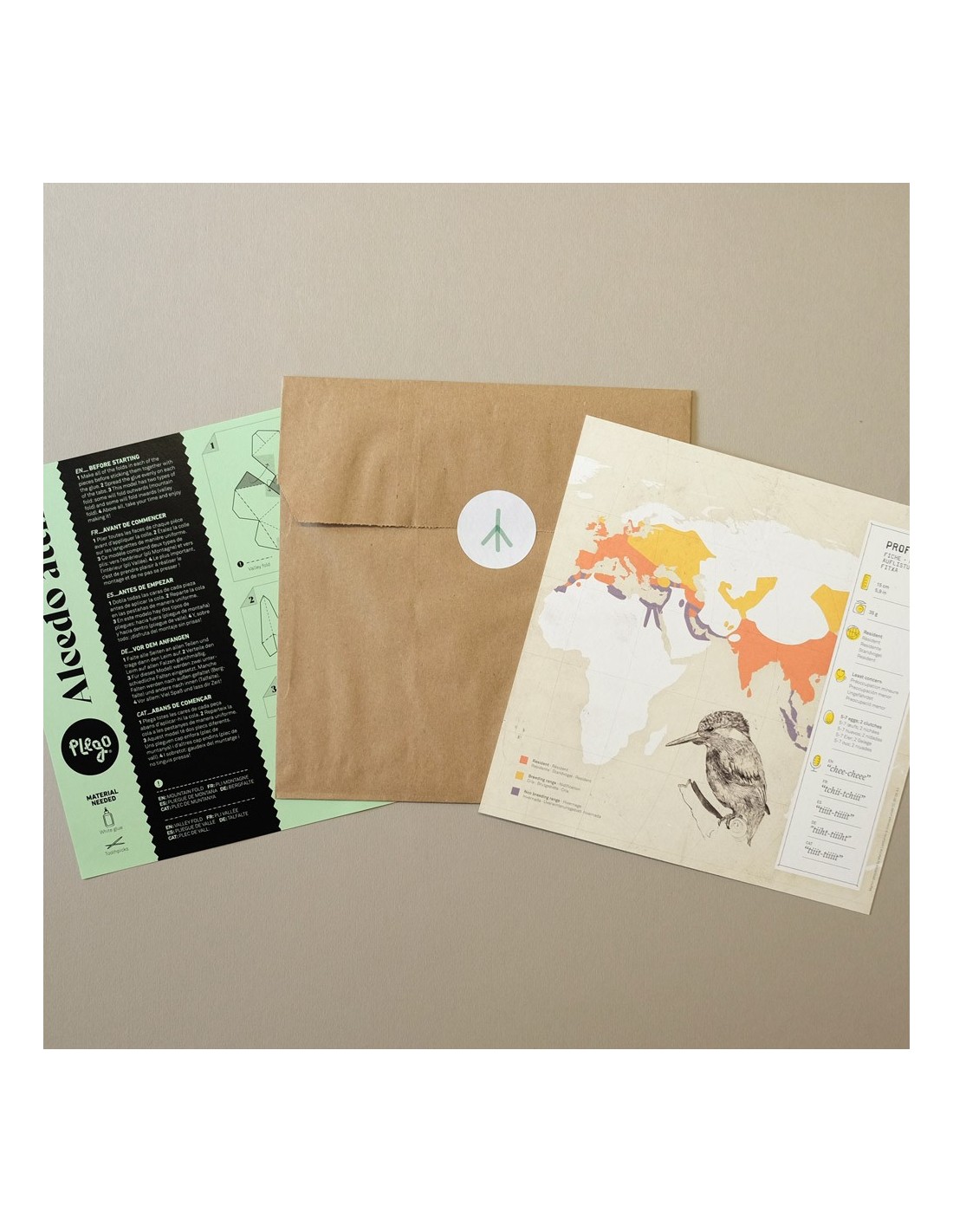 El kit contiene 4 papeles de arte de pulpa teñida, con un 50 % de algodón y resistentes a la luz, y 3 papeles con tintas metalizadas y tornasoladas, una ficha didáctica con las principales características del colibrí coliancho y unas instrucciones de montaje, todo en 8 idiomas diferentes. Las piezas vienen precortadas y marcadas para facilitar el plegado y montaje. Todos estos materiales se presentan en una carpeta atractiva y resistente. Es necesaria cola blanca de manualidades para pegar las piezas de la figura.