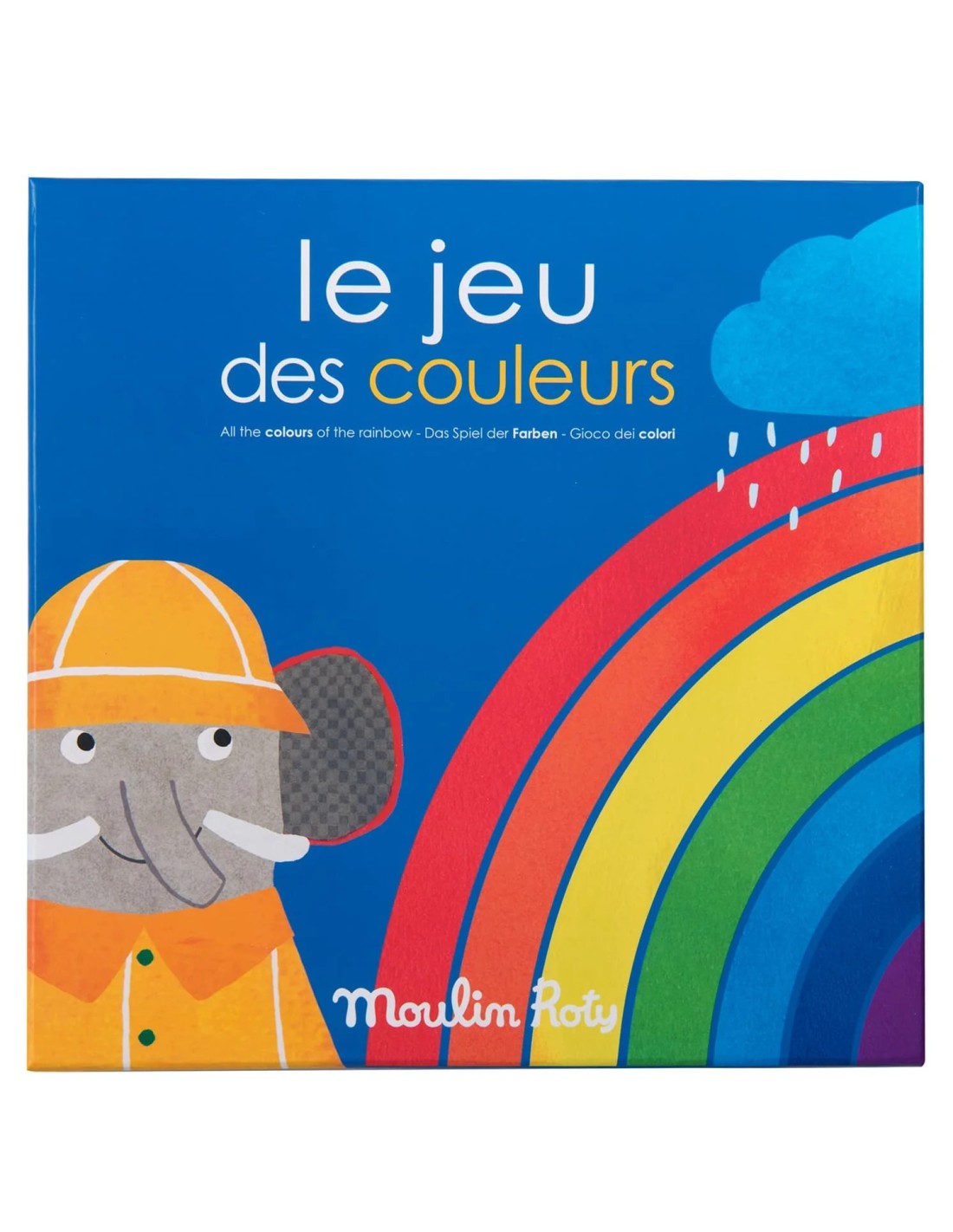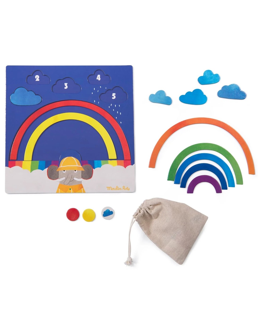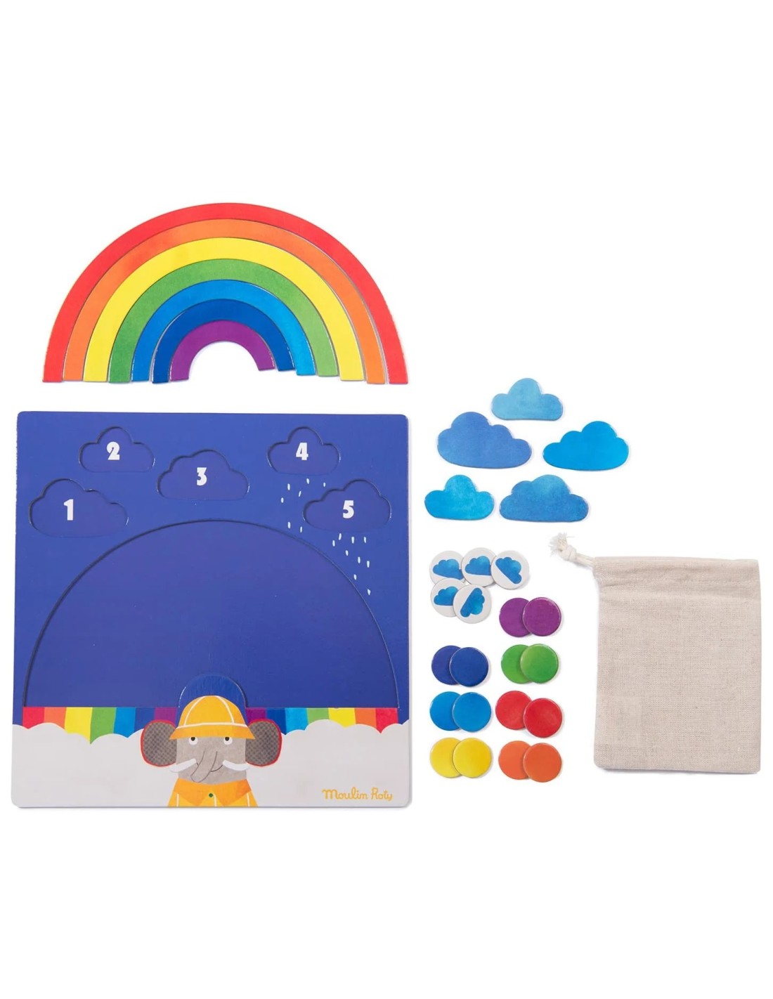 Juego para aprender colores que contiene 7 rayos de arcoíris, 5 nubes y 19 fichas.