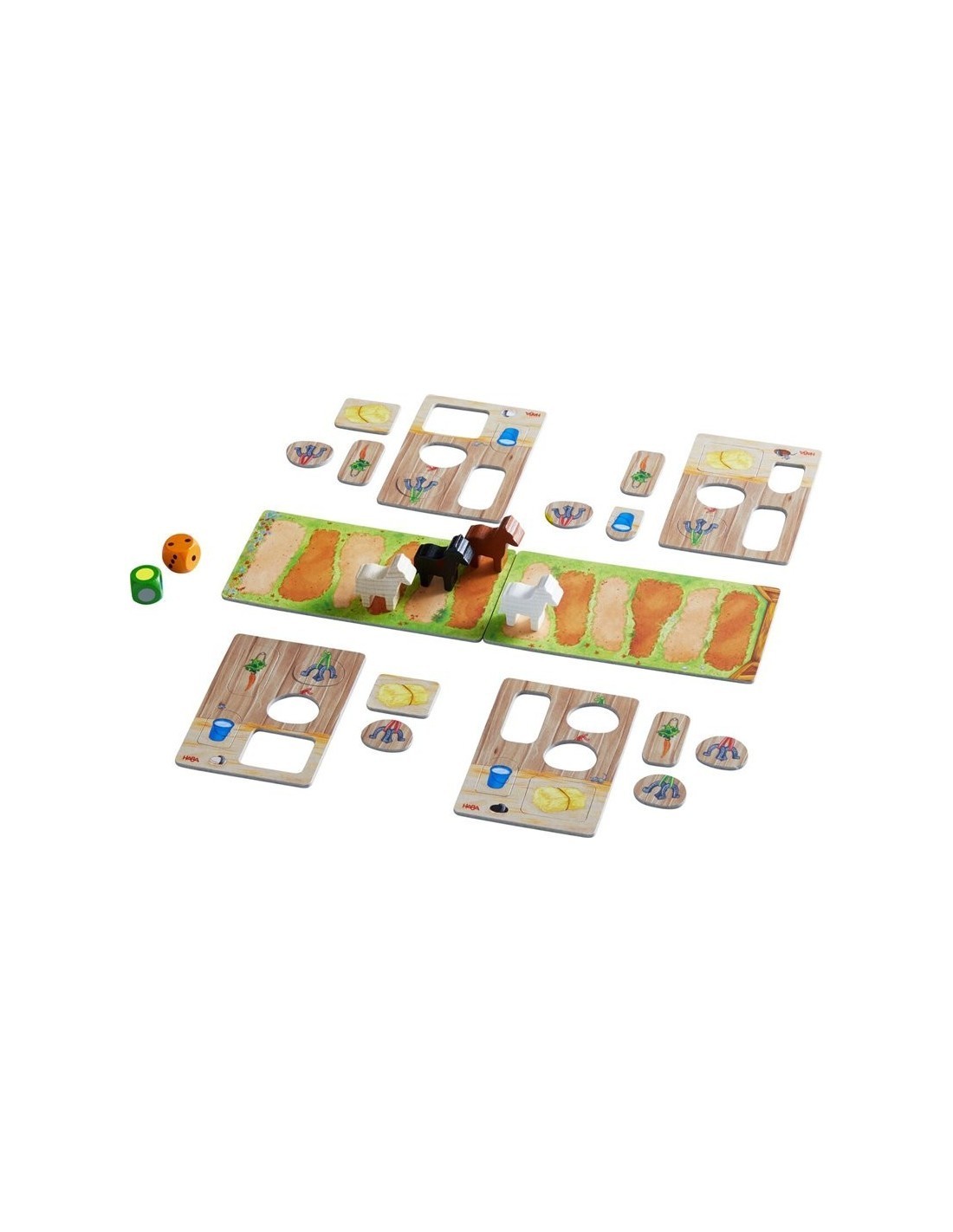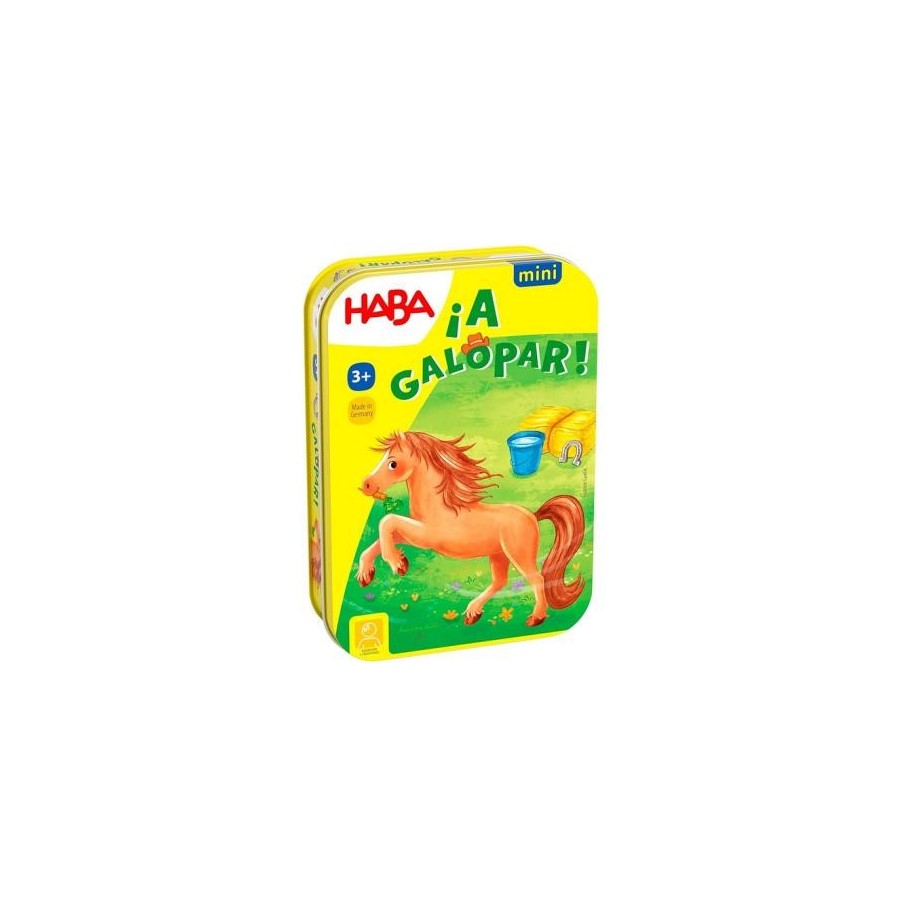 Versión mini en caja de lata del juego de recorrido y recolección. Se trata de ser los primeros/as en llevar a su caballo desde la dehesa a su caja correspondiente, recogiendo en el camino todos los objetos indicados en la tarjeta. Para ello, por turnos, se lanzan los 2 dados y se decide si avanzar o si coger un objeto. Un juego de recolección al galope. Contiene 2 tableros, 4 caballos de madera, 4 marcos de depósito con 5 piezas de rompecabezas cada uno, 1 dado naranja, 1 dado verde