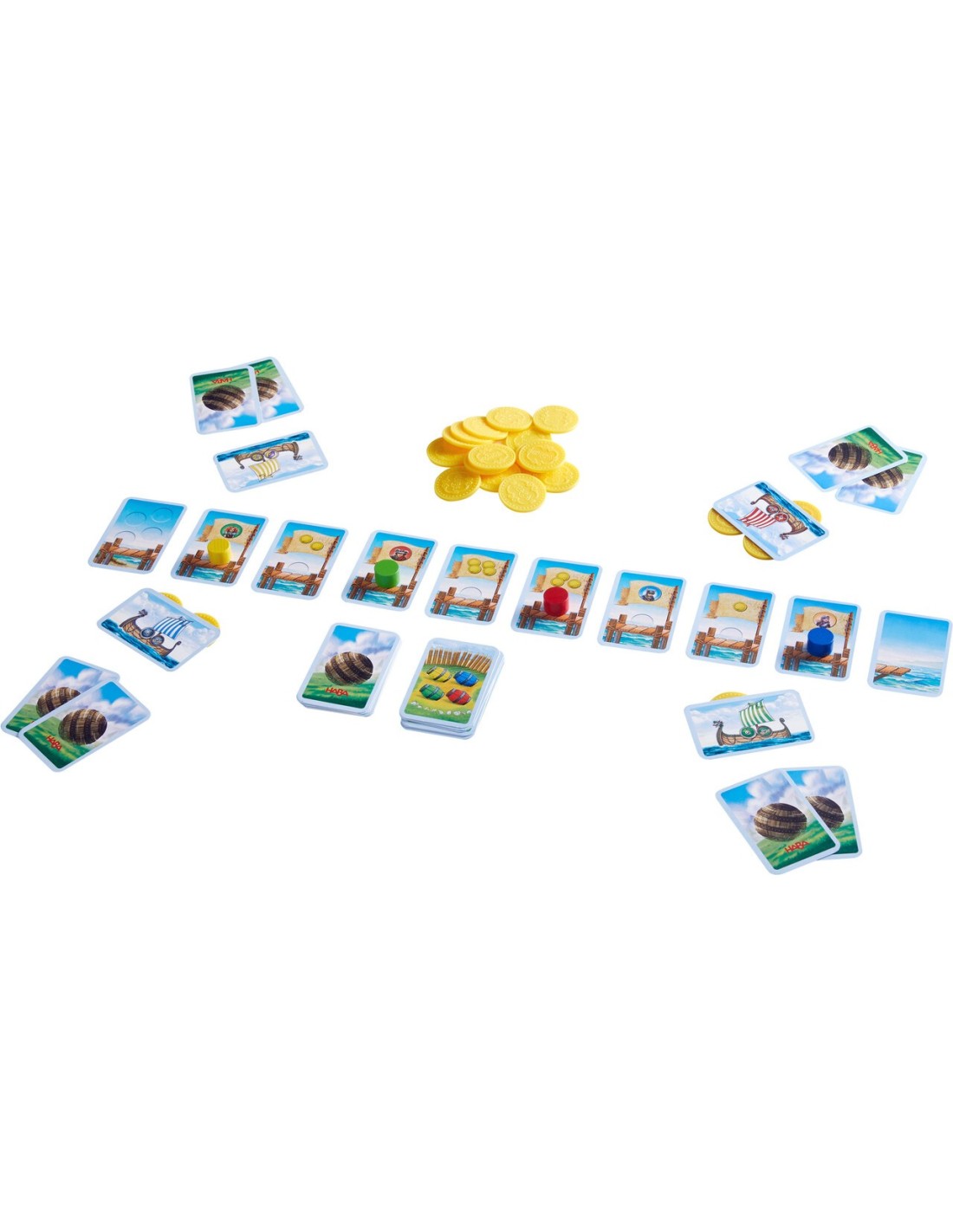 Versión mini en caja de lata del "Juego Infantil del Año 2019". Por turnos, los jugadores/as deciden jugar una de sus cartas de la mano o de la pila. En función de la carta mueven las fichas de colores por el embarcadero. En cuanto una de las fichas cae al agua, se reparten monedas en función de la posición que ocupan en el embarcadero. Gana quien consiga más monedas de oro.