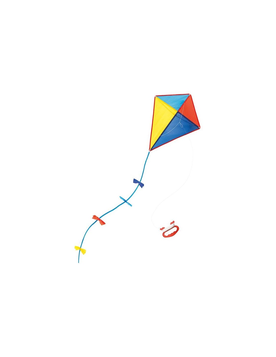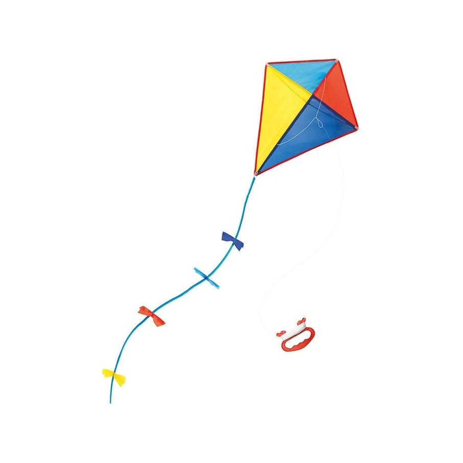 Cometa de colores rojo, azul y amarillo, con cordón y lazos decorativos.