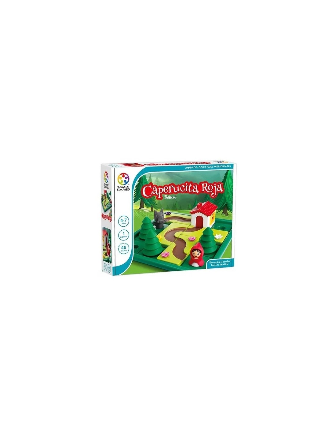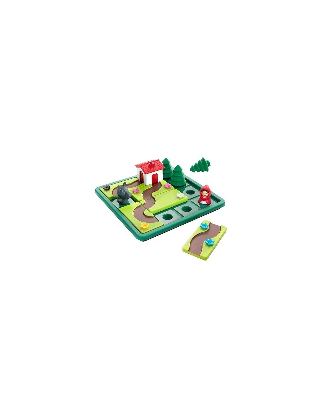 Contenido: 3 Piezas con flores y caminos 1 Caperucita Roja 1 Lobo 3 Árboles 1 Casa 1 Cuento con imágenes 1 Cuaderno de retos