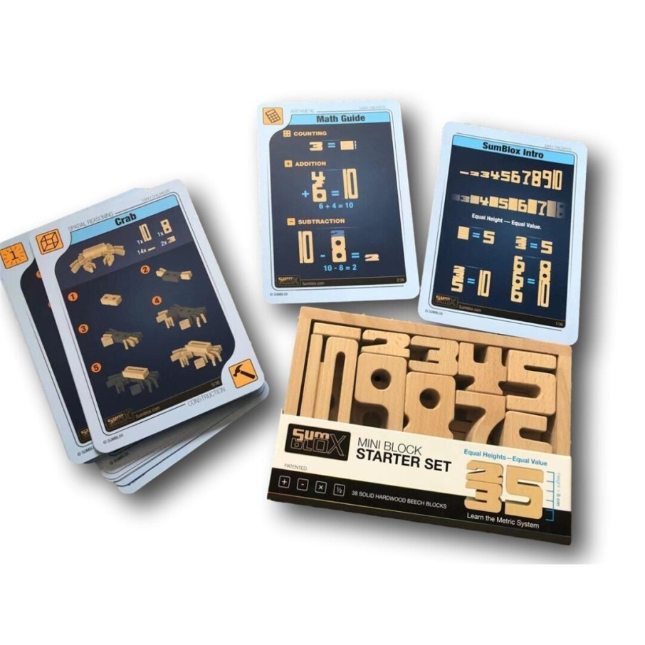 Contiene 38 bloques de números Sumblox Mini y 36 fichas con ideas y actividades.