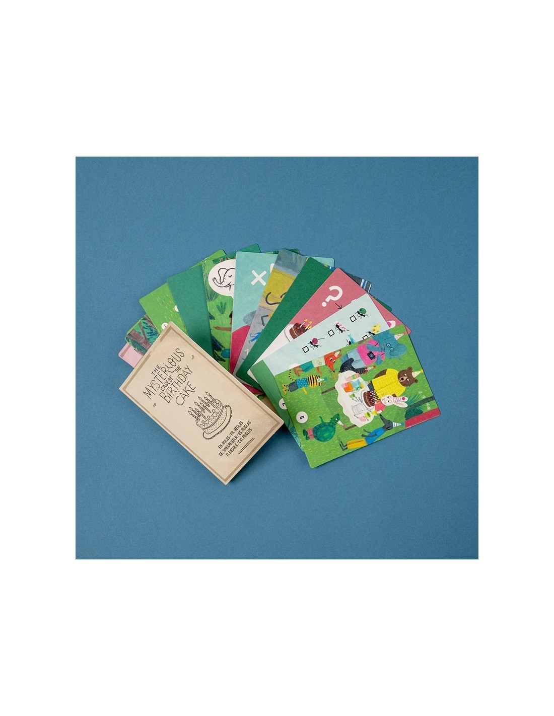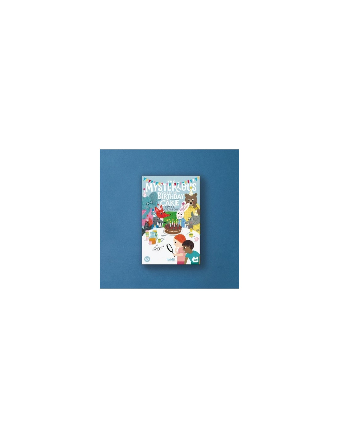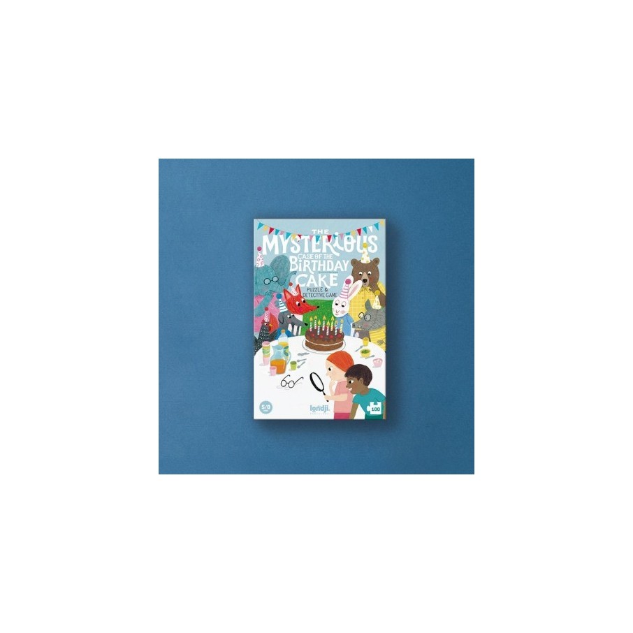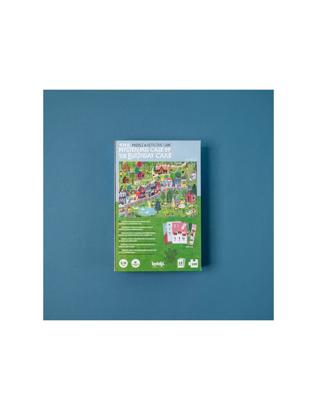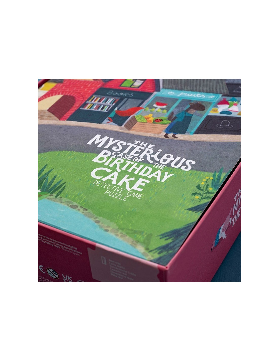 Un puzzle de 100 piezas con un juego de detectives. Incluye 15 cartas de deducción para resolver el misterio del pastel de cumpleaños. Un puzzle original con juego de pistas.