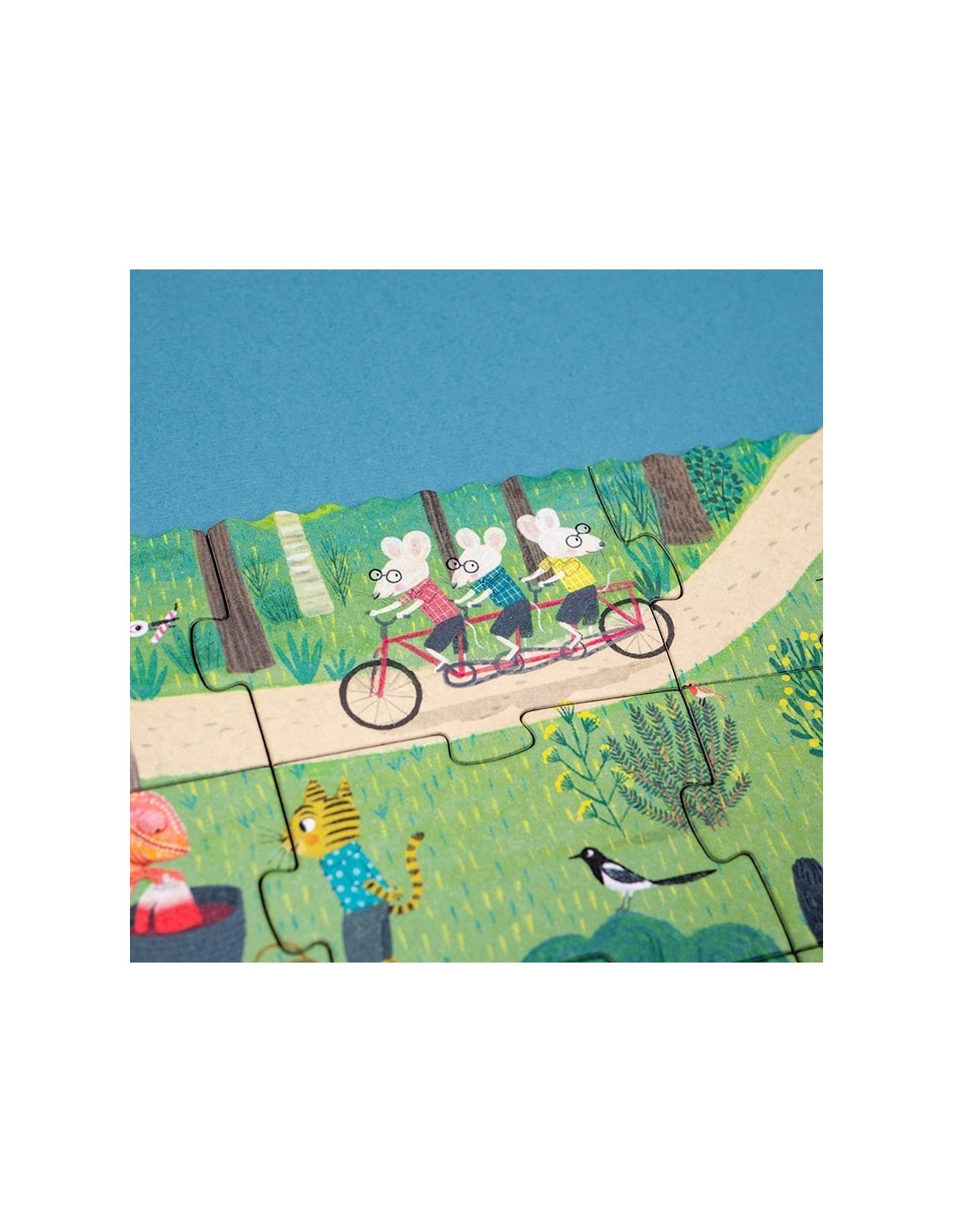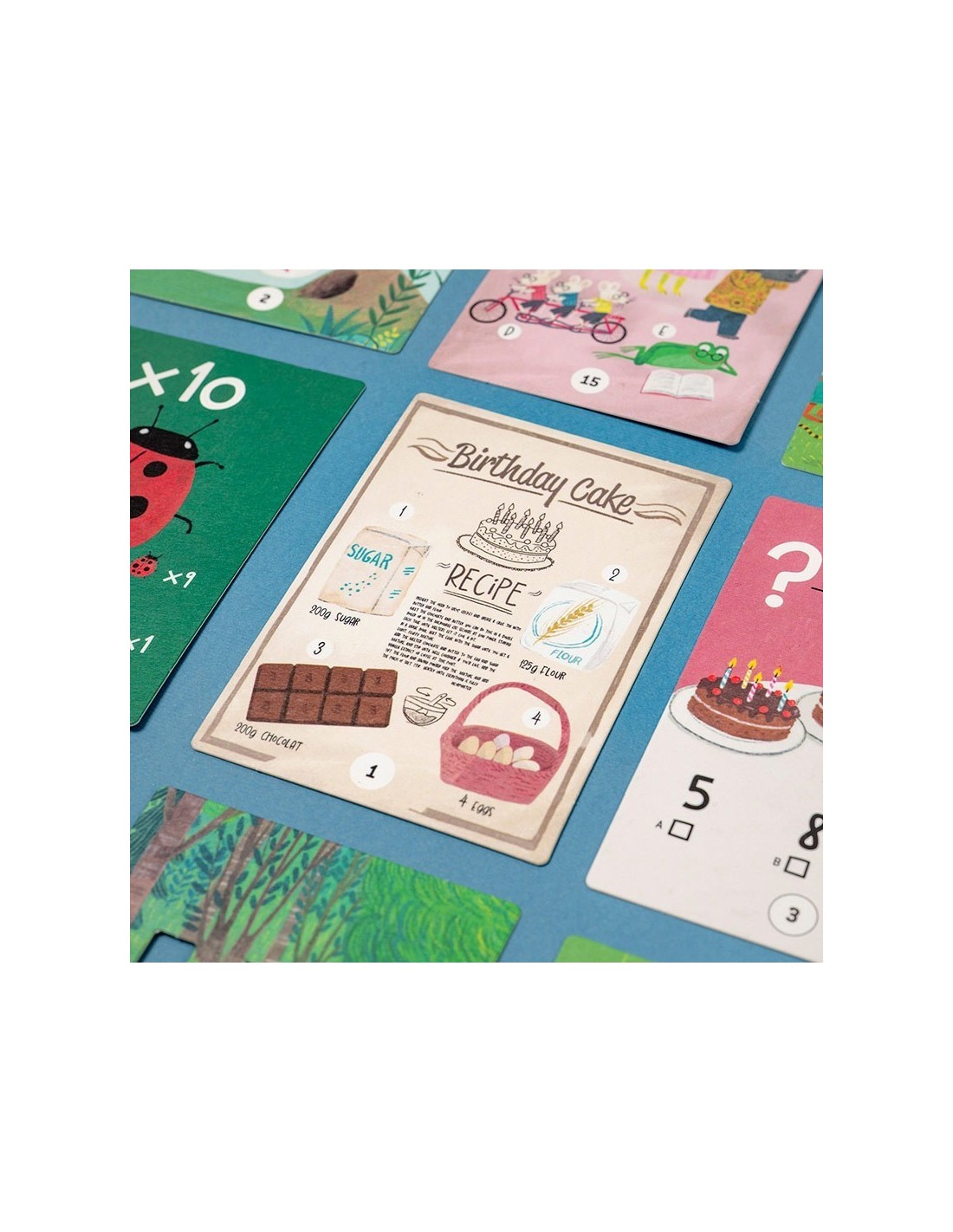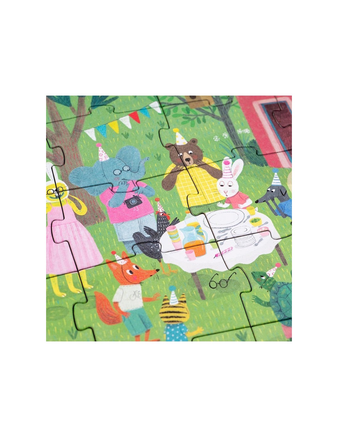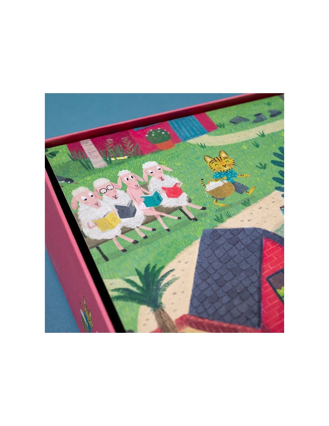 Un puzzle de 100 piezas con un juego de detectives. Incluye 15 cartas de deducción para resolver el misterio del pastel de cumpleaños. Un puzzle original con juego de pistas.