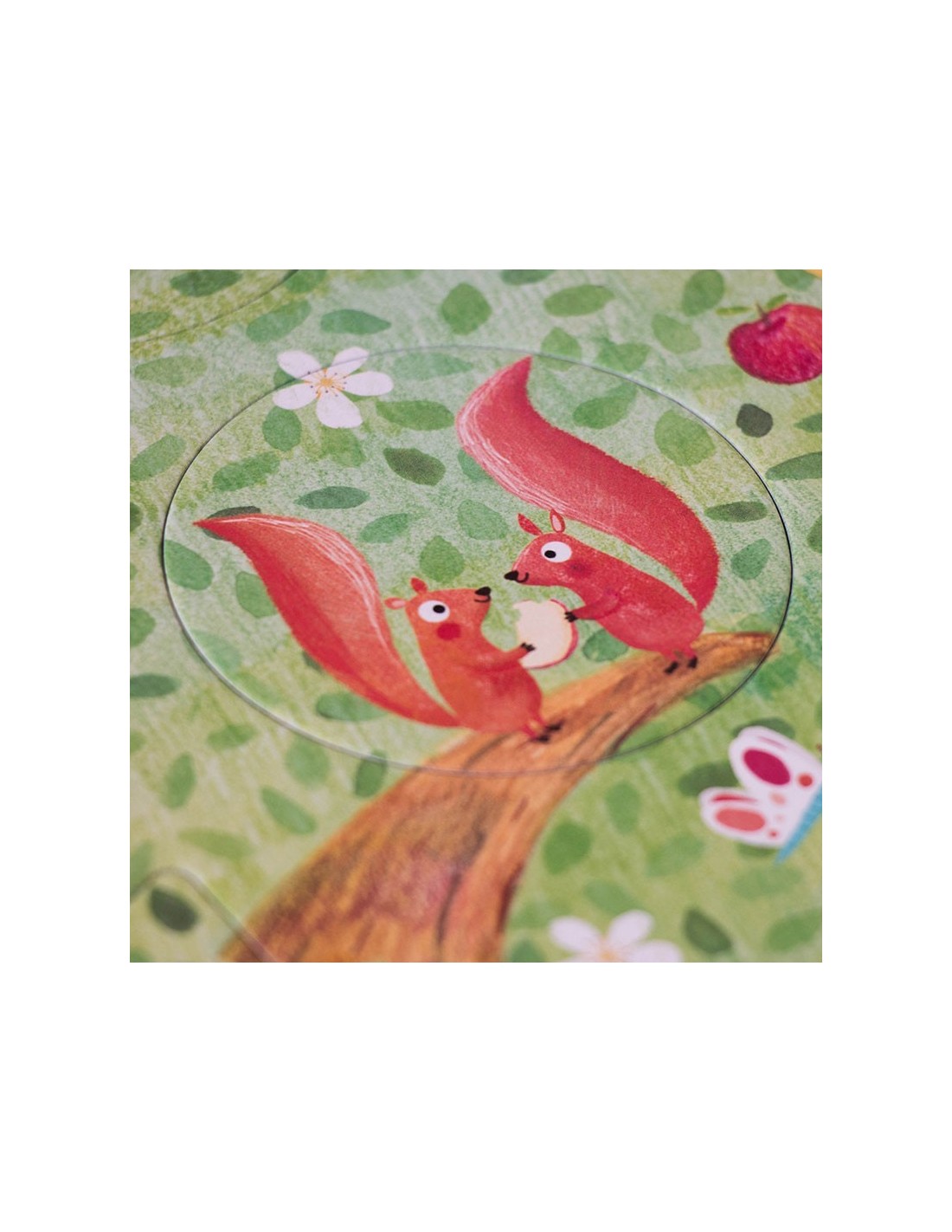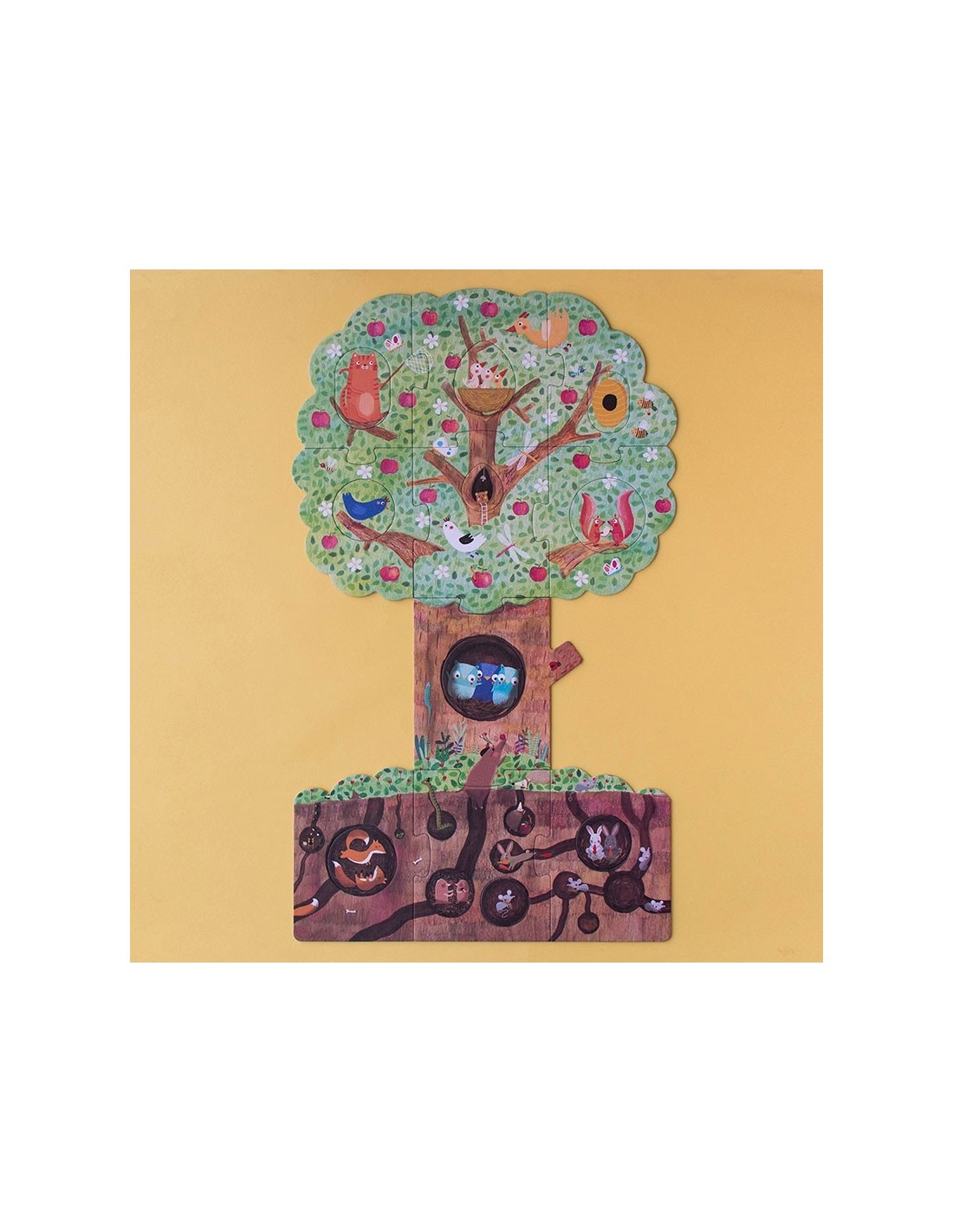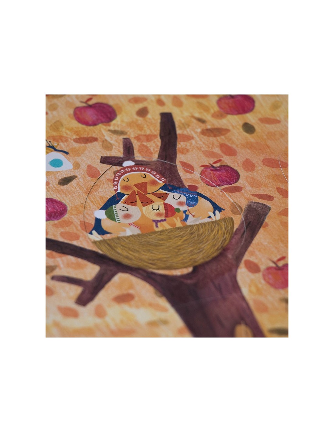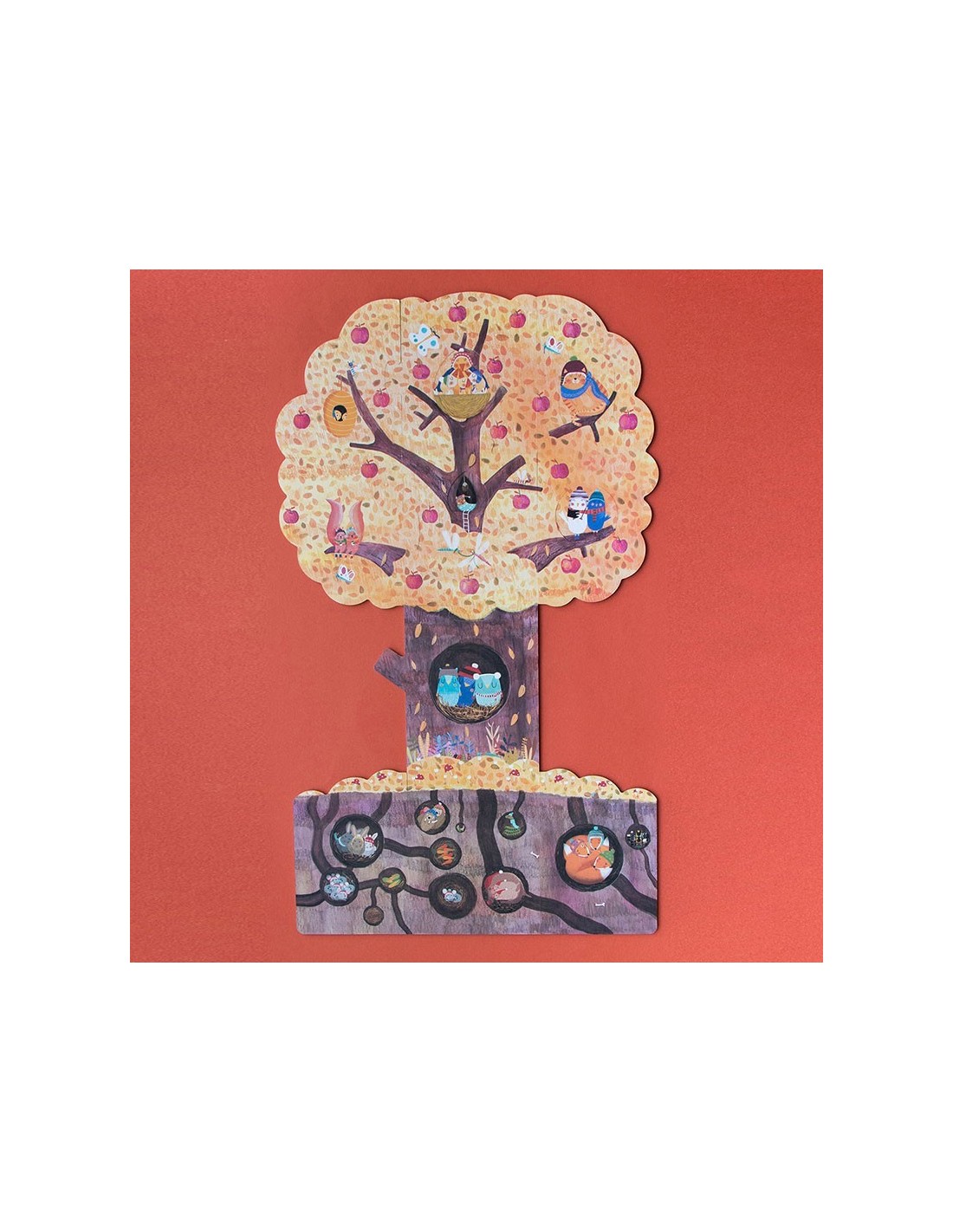 Nuestro manzano en primavera acoge a una familia de ardillas, un nido con pequeños pájaros, un gato travieso y unos búhos juguetones. Bajo tierra ratones, conejos y topos se esconden dentro de sus madrigueras. En otoño ya hemos cosechado las dulces manzanas, descubre lo que hacen nuestros amigos hasta que vuelva el buen tiempo.