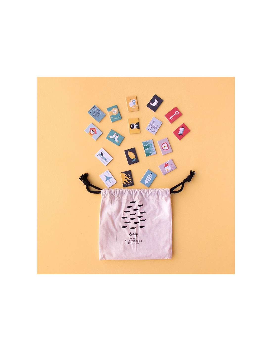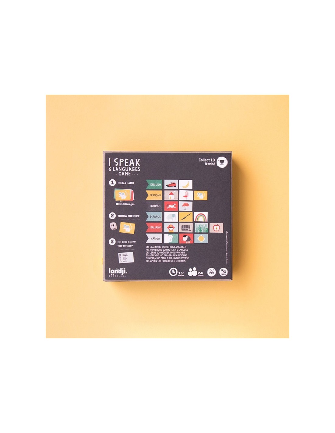 Primero mezclaremos las fichas en la bolsa de algodón y colocaremos en el centro de la mesa las piezas en forma de banderita de los seis idiomas del juego. La dinámica de juego es muy sencilla: El jugador que tiene el turno tira el dado y el jugador de su izquierda saca una ficha de la bolsa. El jugador del turno deberá decir el nombre de la imagen en el idioma que indica el dado, si la sabe gana la ficha. Si no lo sabe, la ficha se colocará sobre la mesa, justo al lado del banderín con el idioma correspondiente. Antes de dejar la pieza, todos los jugadores podrán mirar la solución en el dorso de la ficha y memorizarla. En cada turno el jugador podrá, aparte de jugar la ficha que le toque, repescar las fichas del mismo idioma que queden sobre la mesa, si las recuerda. ¡Ganará el primer jugador en conseguir diez fichas!