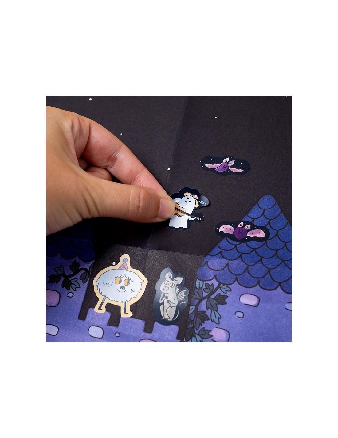 Diviértete creando tu propio póster: coloca las pegatinas removibles y da vida al castillo con todos los personajes que quieras. Cada pegatina es una nueva sorpresa para inventar historias y transformar la escena en una fiesta terroríficamente divertida.