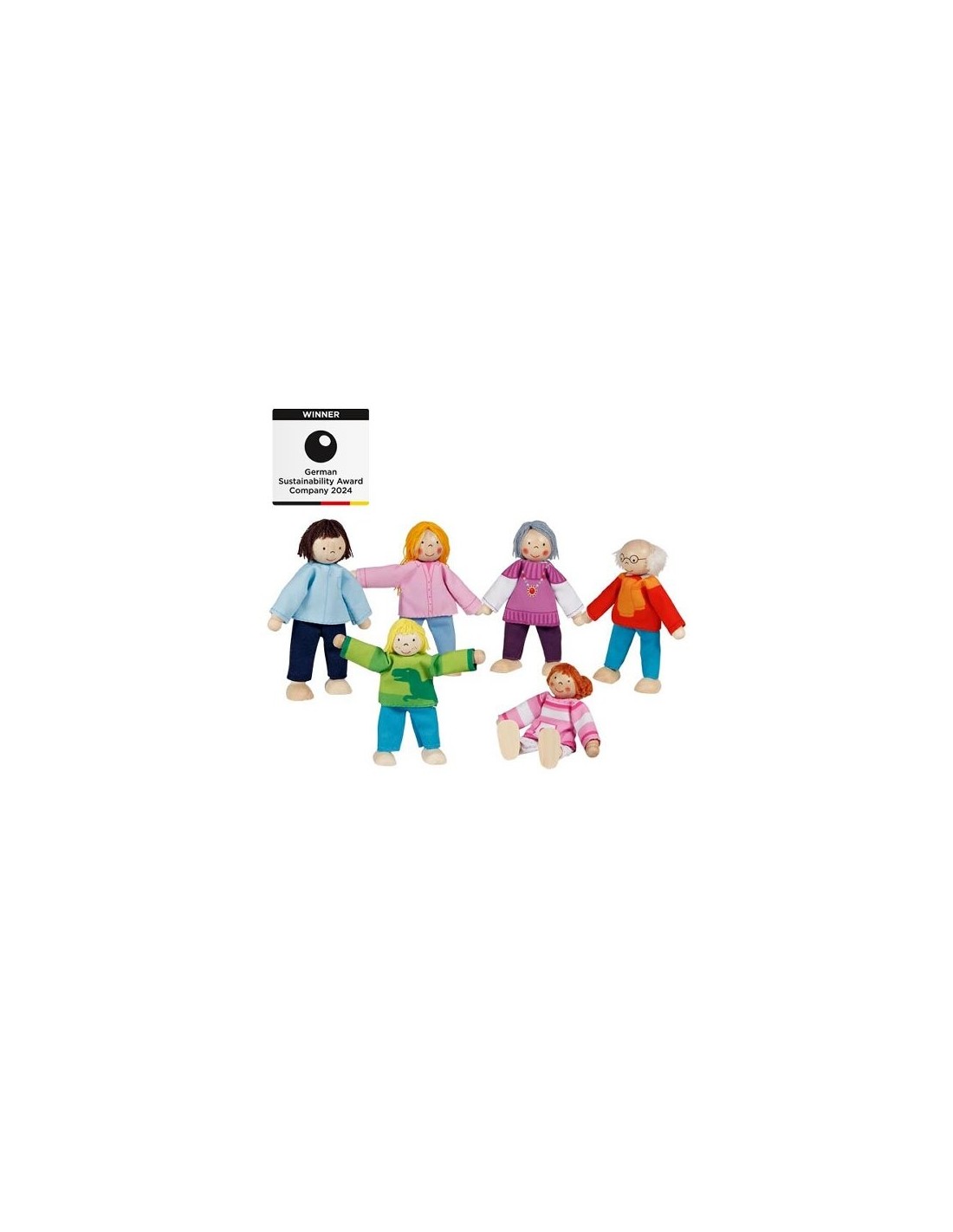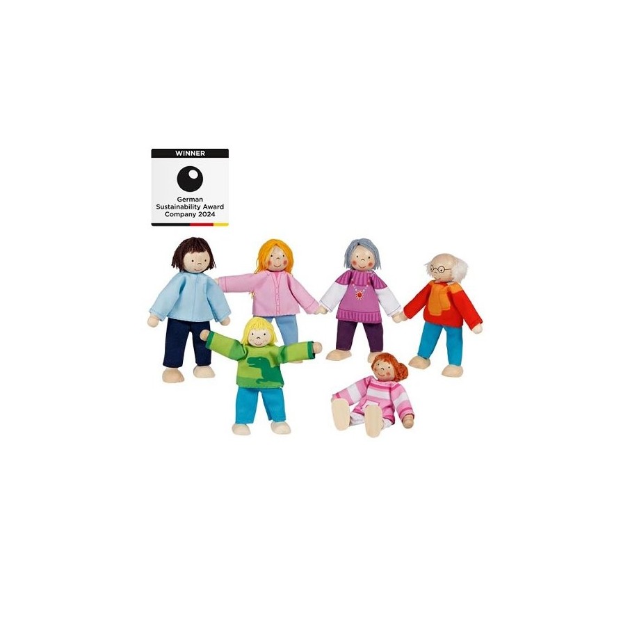 Familia de muñecas flexibles de tres generaciones: las figuras de madera, diseñadas con mucho cariño, son fácilmente movibles y pueden estar tanto de pie como sentadas. FomentaN la creatividad y el juego libre y estimulan la imaginación para los juegos de rol. Se imitan y practican las interacciones sociales junto a hermanxs y amigxs mediante la representación de escenas domésticas cotidianas.