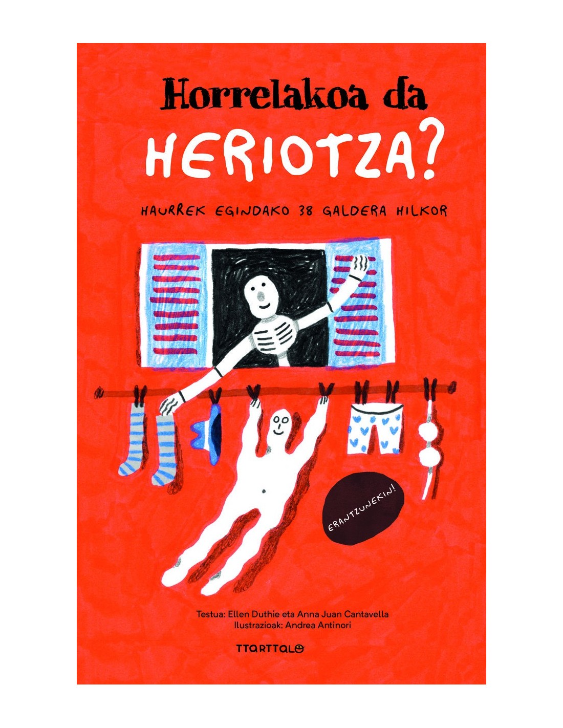 Bi idazle eta ilustratzaile bat liburu batean sartu dira eta 5 eta 15 urte arteko haurrek eta gazteek egindako heriotzari buruzko 38 galdera aurkitu dituzte. Zer erantzungo dute? Liburu samurra, aurreiritziz gabetua, zorrotza eta harrigarriro alaia, solas egitera, hausnartzera eta heriotzari buruzko galderak egitera bultzatzen duena.