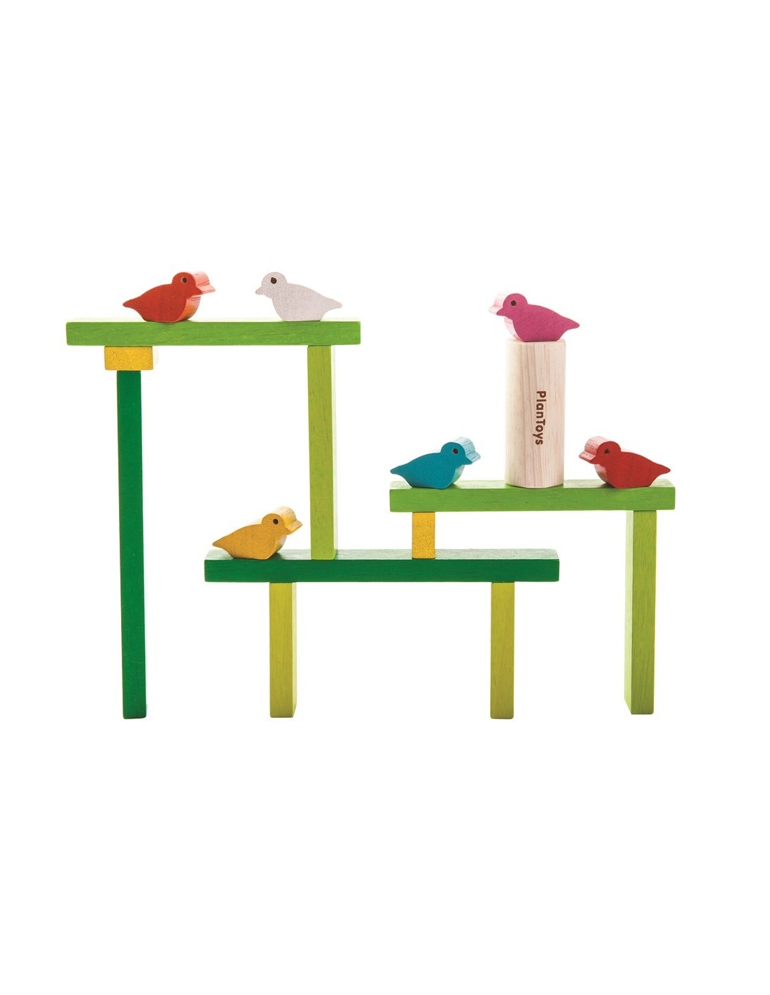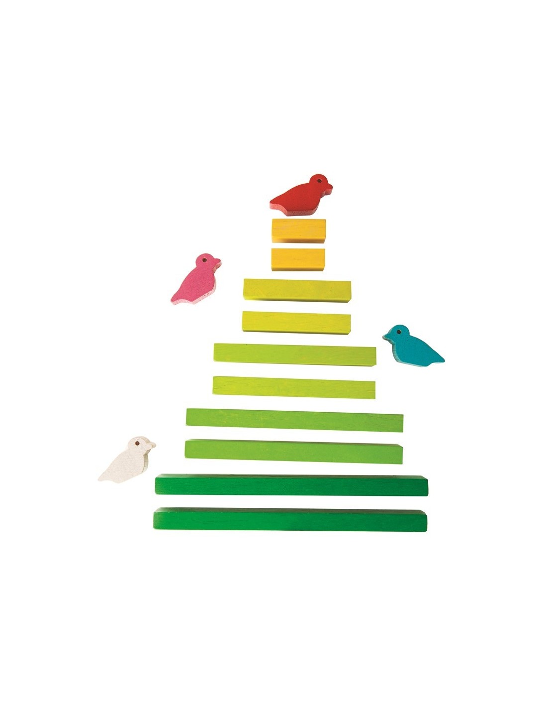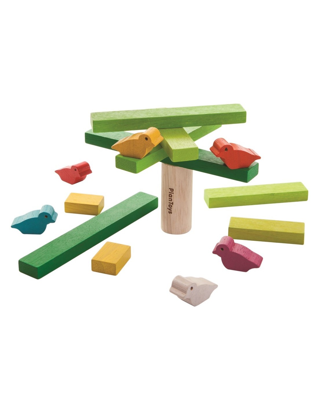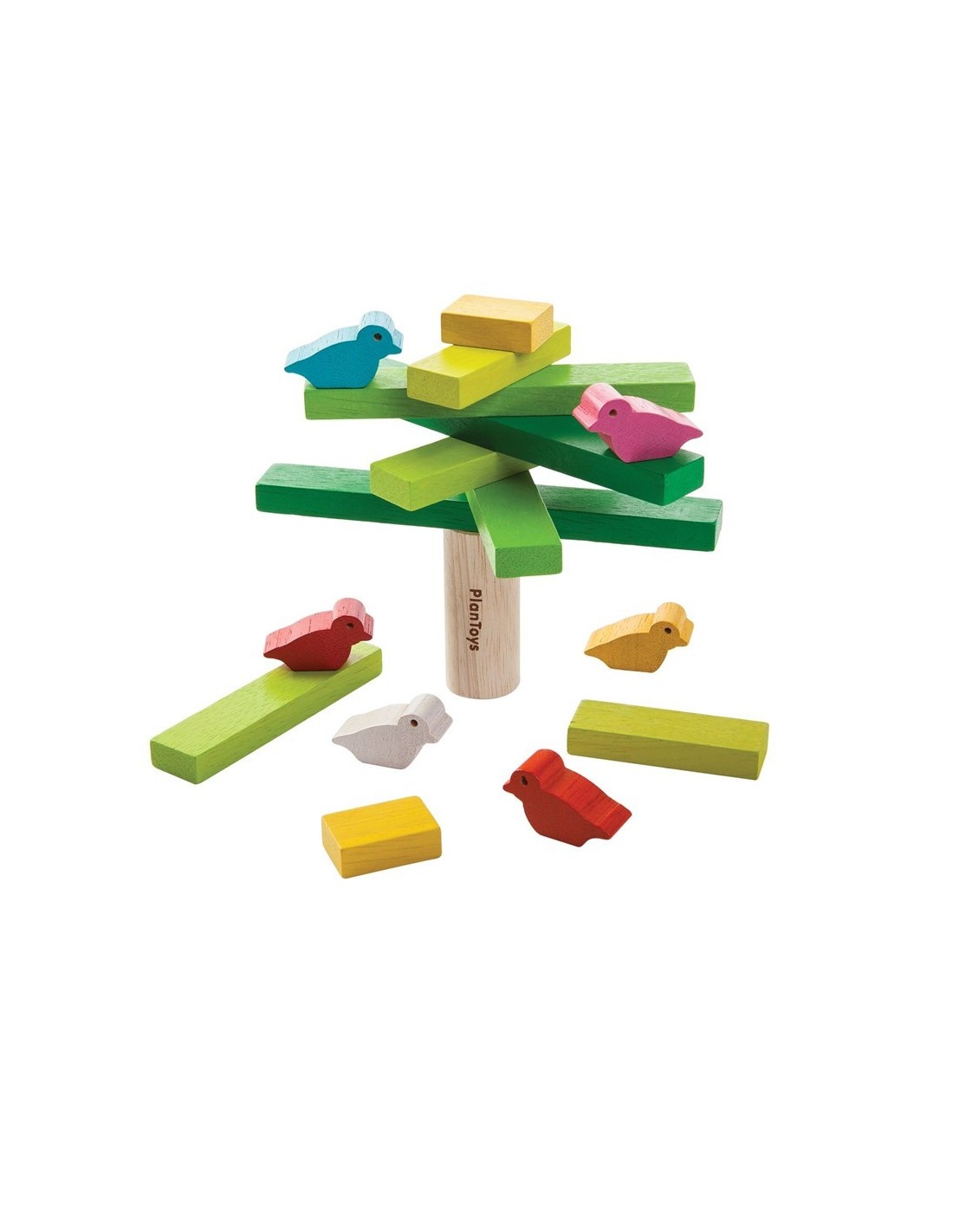 La persona que puede apilar y equilibrar el árbol y el pájaro sin hacerlos caer, gana! El conjunto consta de 11 piezas del árbol y 6 pájaros. Ayuda a desarrollar habilidades motoras finas.