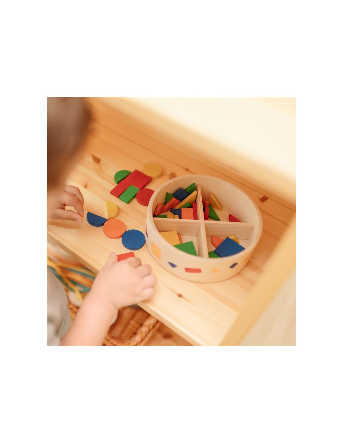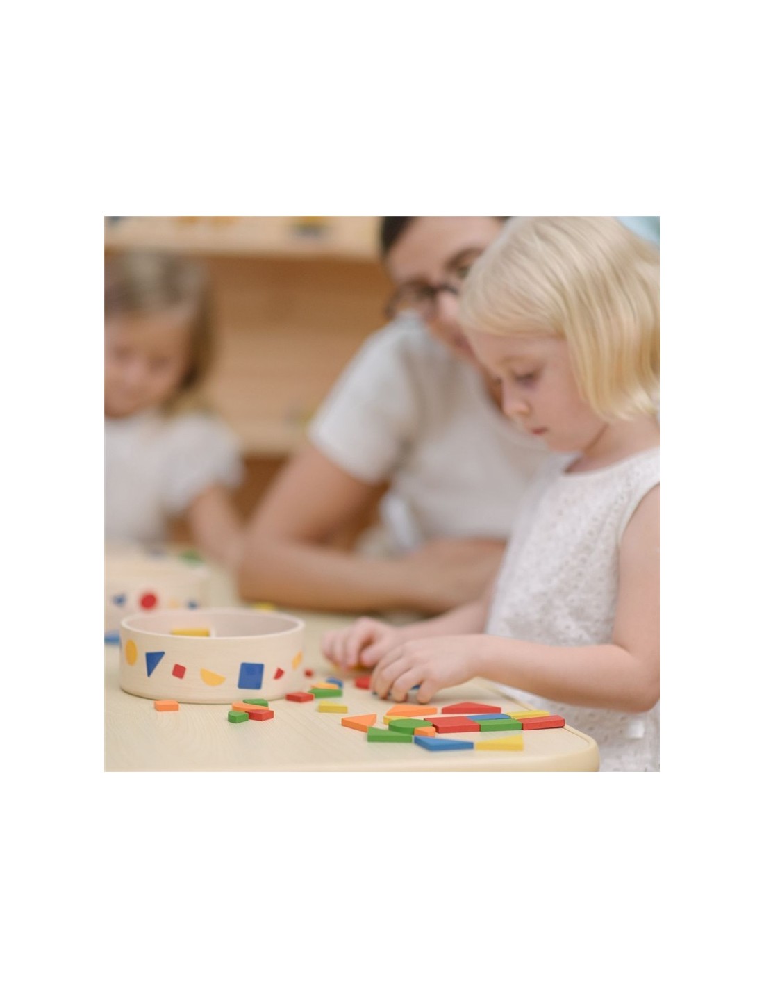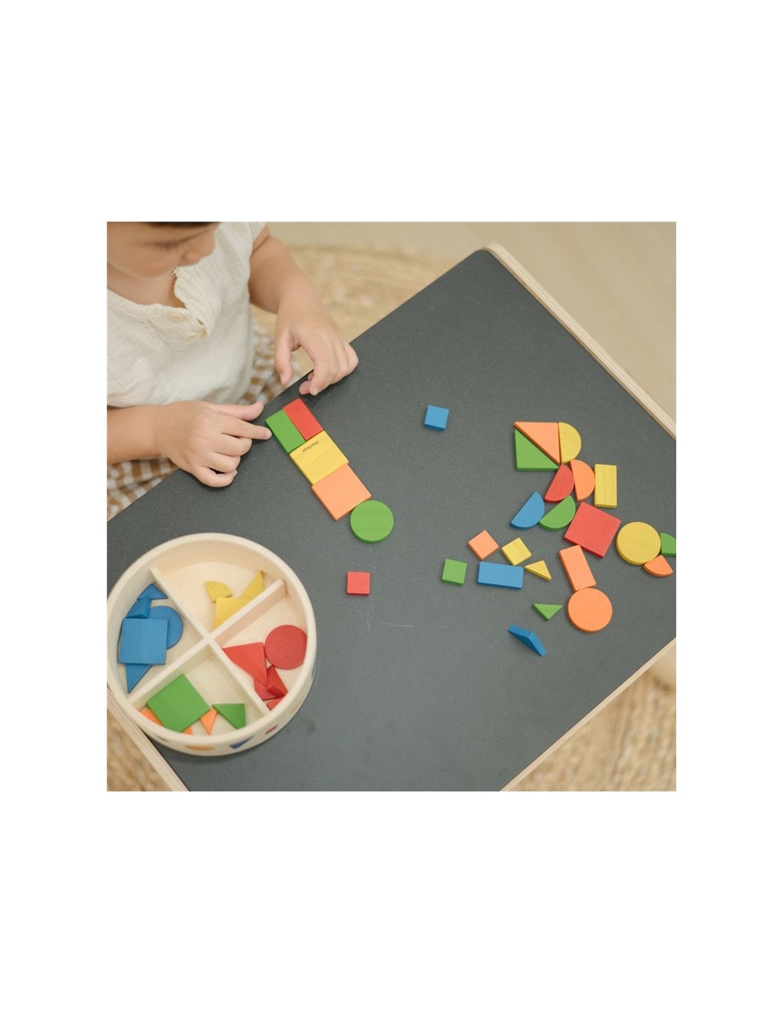 Fabricado de forma sostenible con materiales ecológicos, como madera de caucho sin químicos y tintes a base de agua. El juego incluye: 45 piezas geométricas (9 de cada color: rojo, azul, verde, amarillo y naranja).