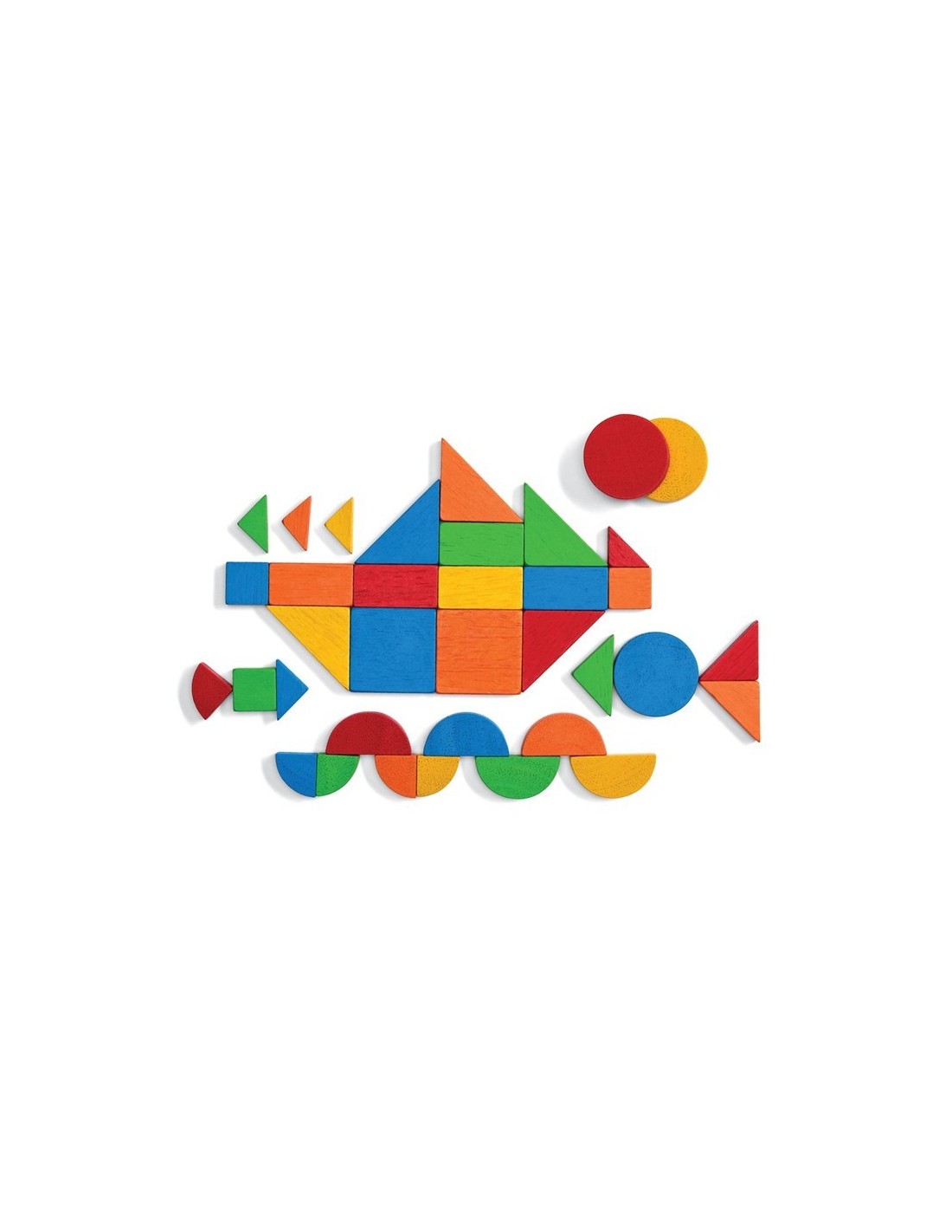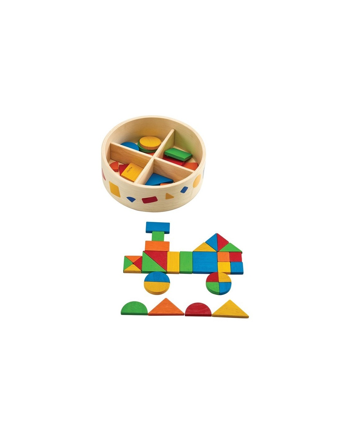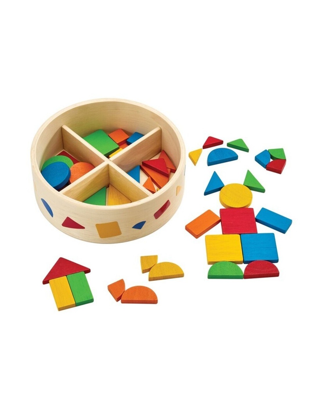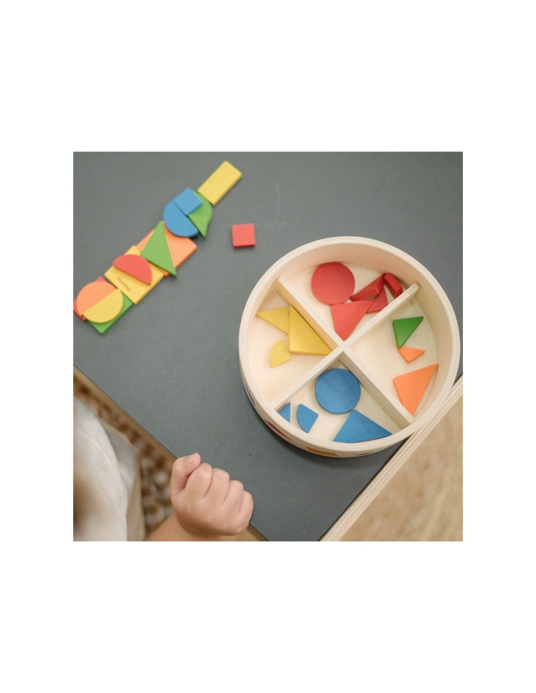 Fabricado de forma sostenible con materiales ecológicos, como madera de caucho sin químicos y tintes a base de agua. El juego incluye: 45 piezas geométricas (9 de cada color: rojo, azul, verde, amarillo y naranja).