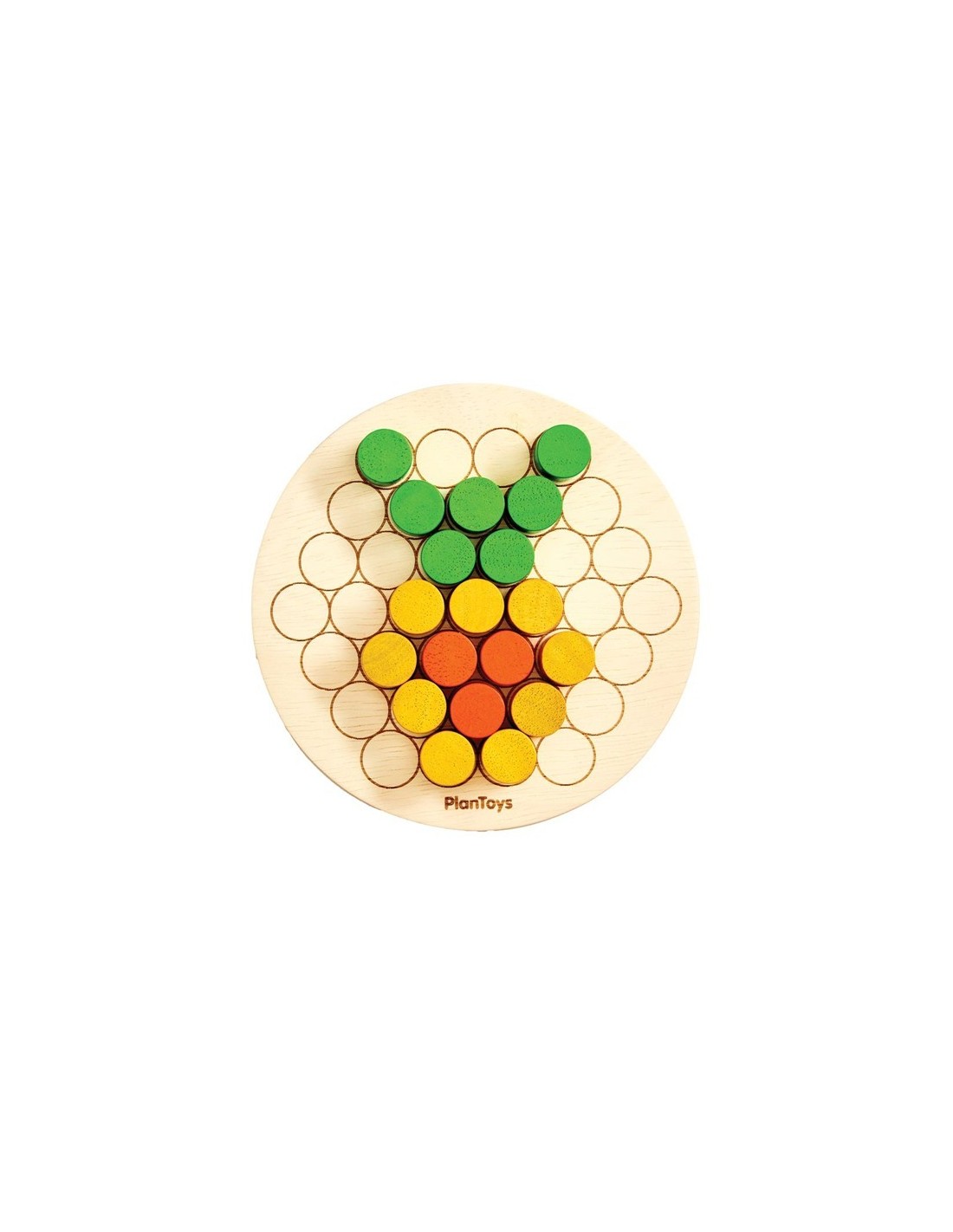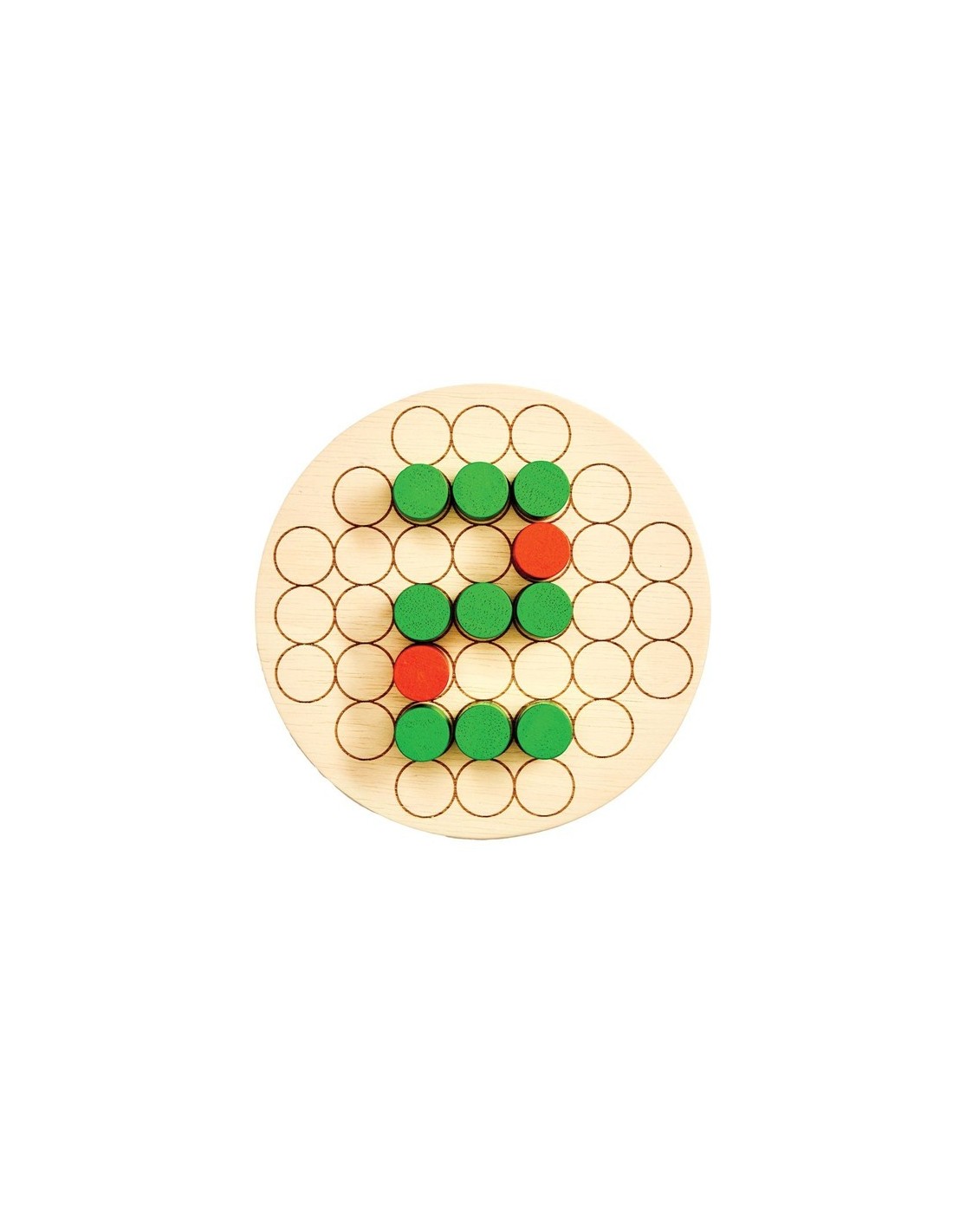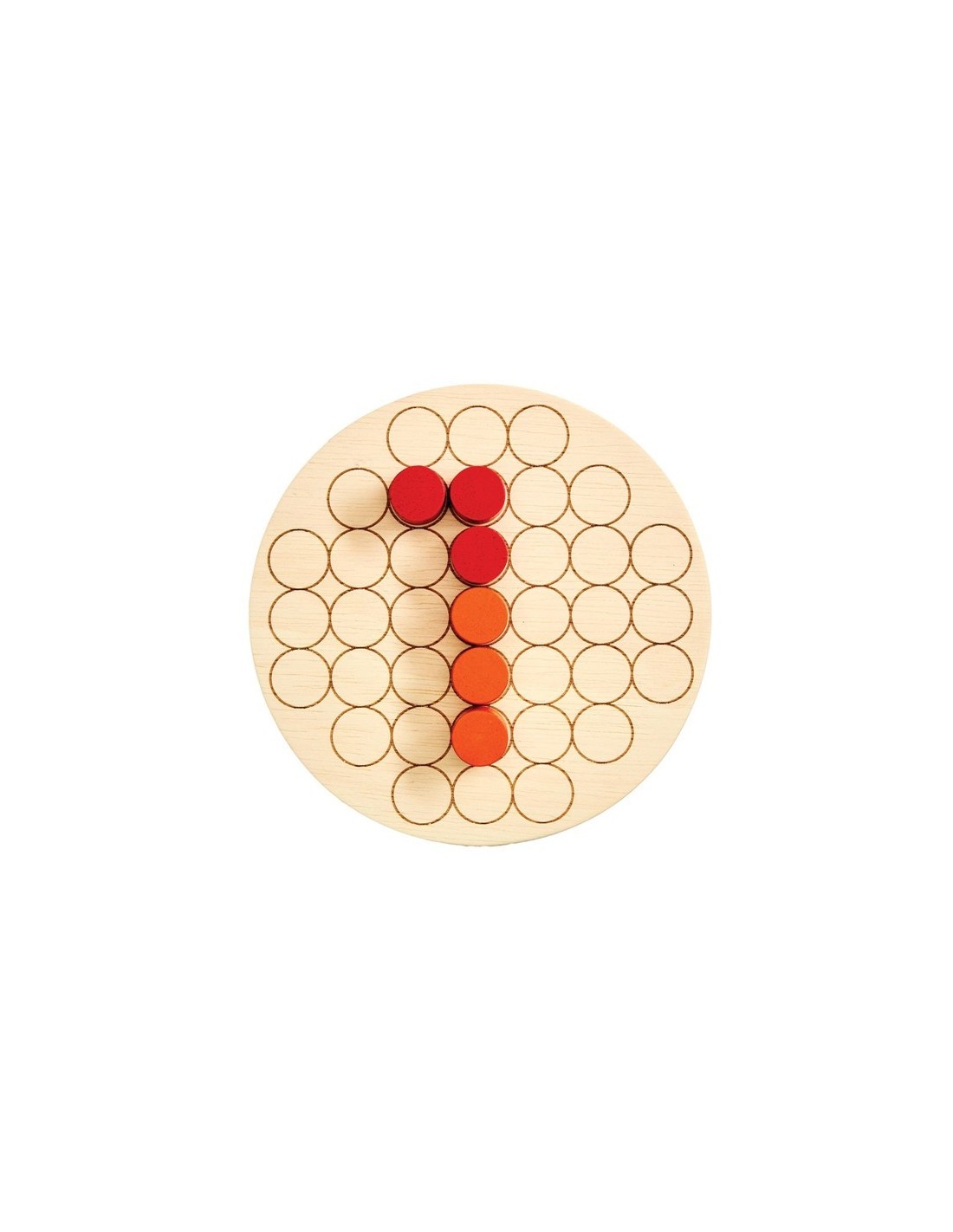 El juego incluye: un tablero redondo de madera con 37 ranuras grabadas con láser (en ambos lados) y 45 clavijas de colores (9 de cada uno en rojo, azul, verde, amarillo y naranja).