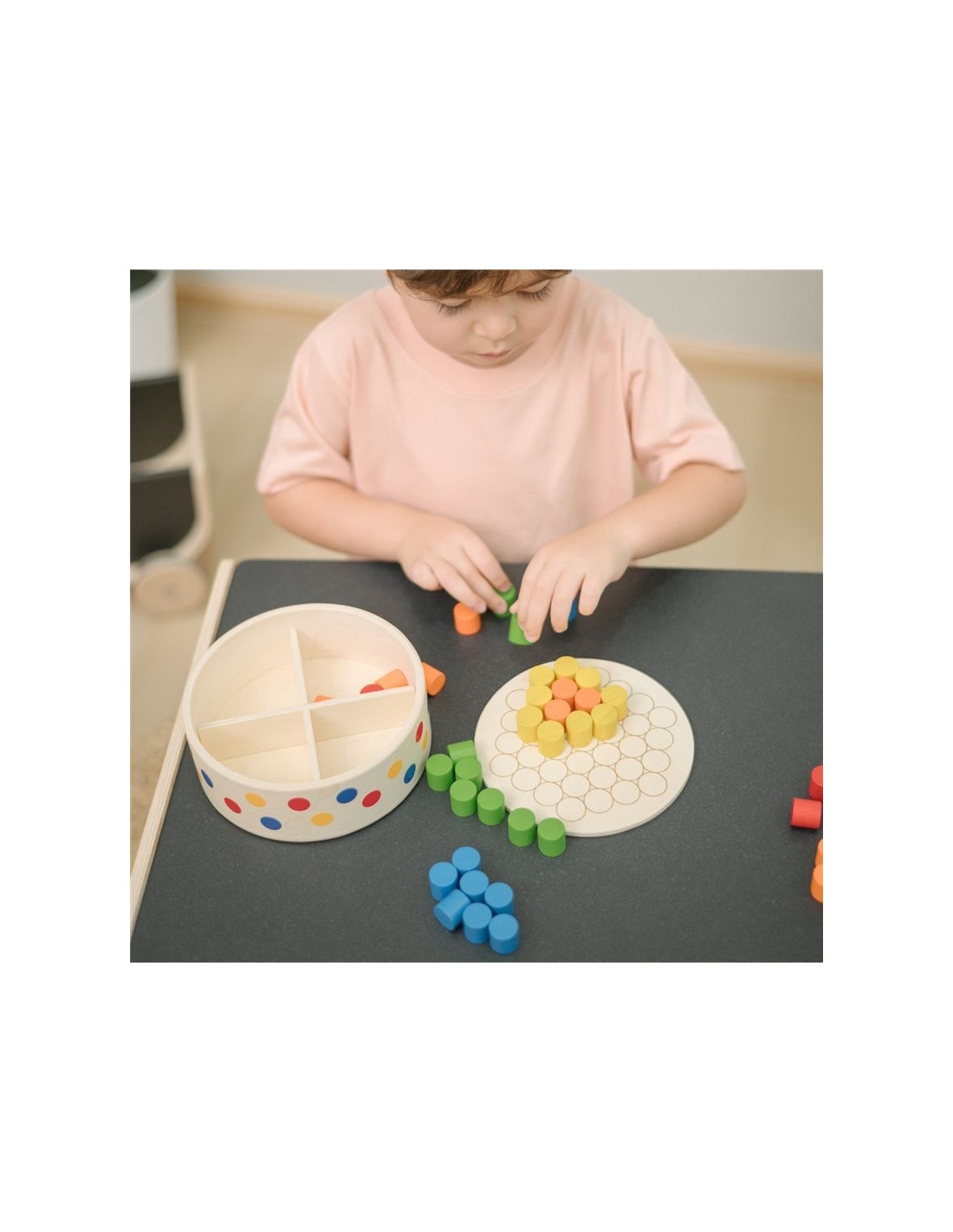 Esta actividad fortalece la coordinación ojo-mano, la destreza con los dedos y las habilidades matemáticas tempranas mediante la agrupación de colores, la simetría y la secuenciación. Las guías circulares del tablero facilitan la colocación precisa de las clavijas, lo que permite diseñar libremente, seguir patrones, clasificar por color y practicar el conteo y conceptos matemáticos básicos. También funciona como caja de almacenamiento para facilitar la organización.