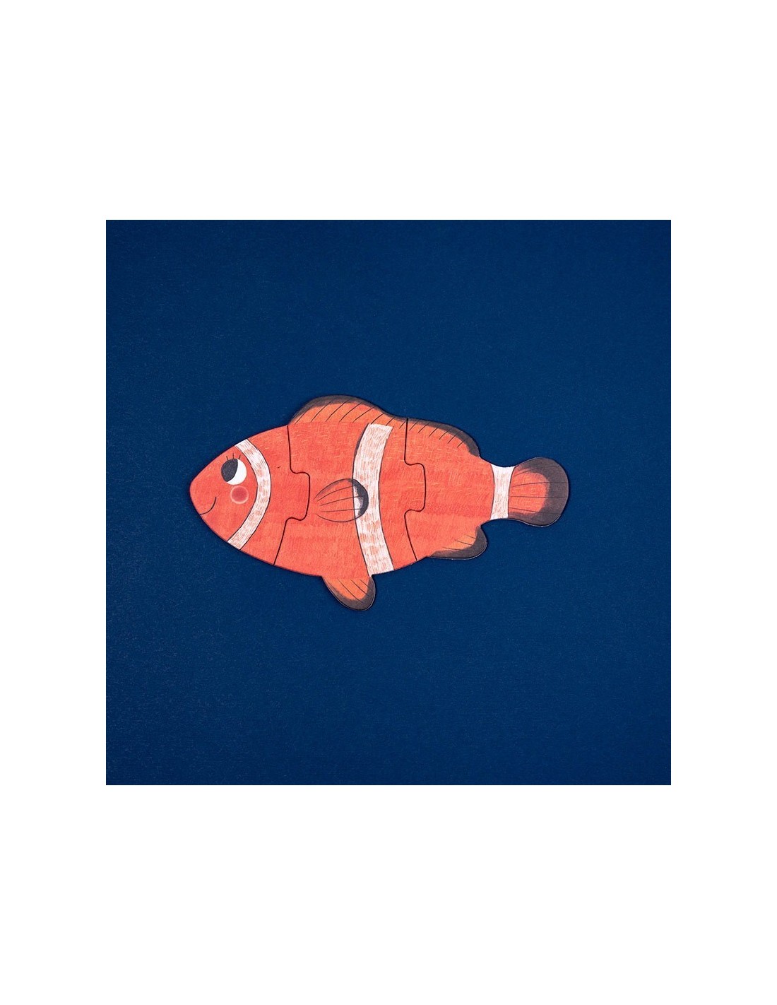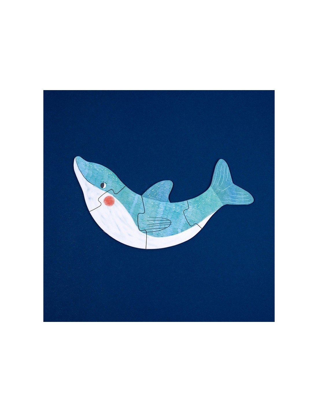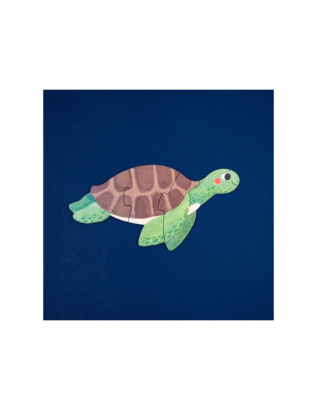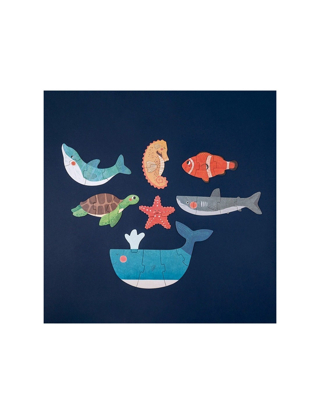 7 puzzles reversibles y progresivos con figuras de 2, 3, 4 y 5 piezas para que los más pequeños descubran los animales marinos. Sostenible. Ideal como primer puzzle.