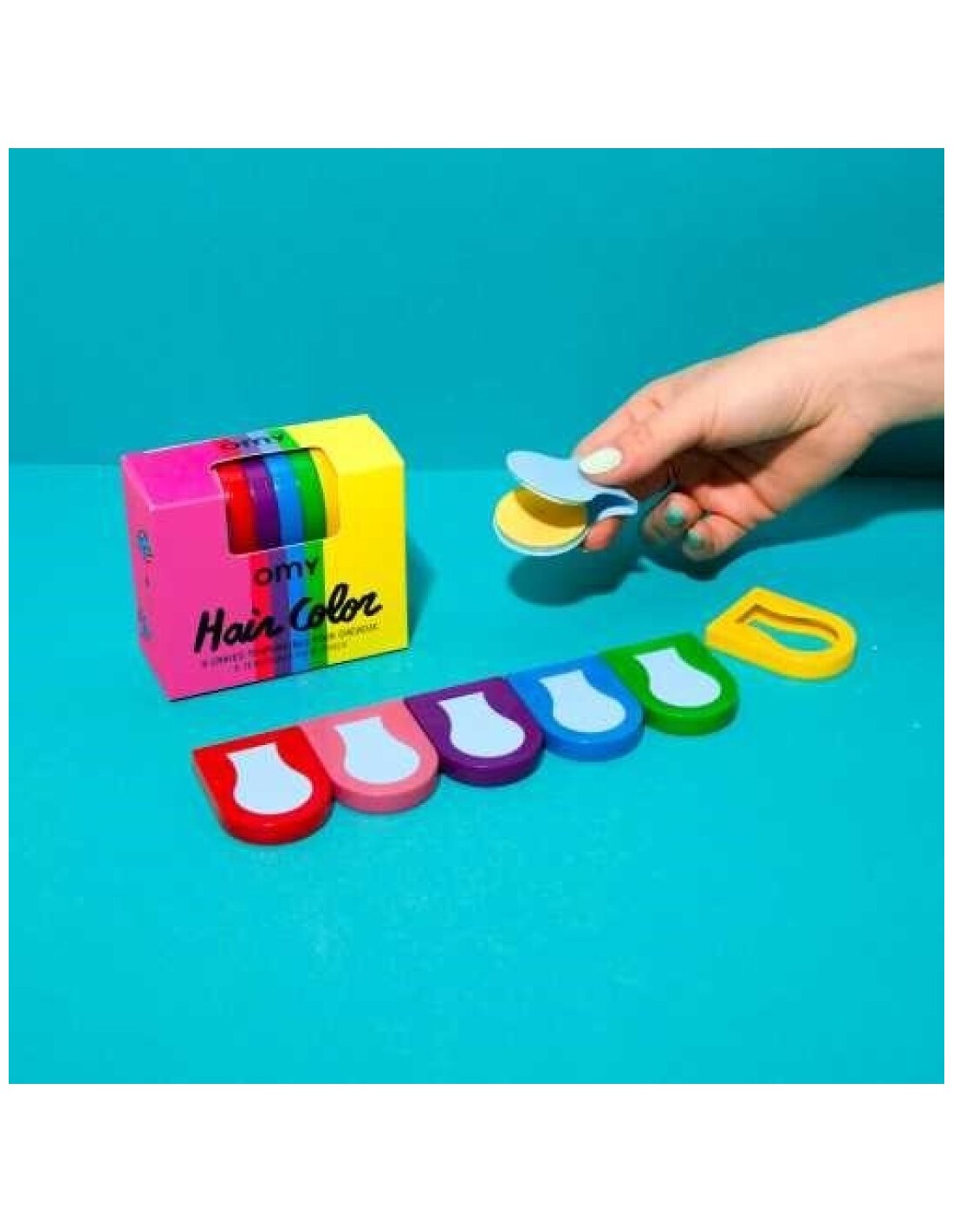Los 6 colores (rosa, rojo, morado, azul, verde y amarillo) se aplican fácilmente sobre cabello seco o húmedo, claro u oscuro.