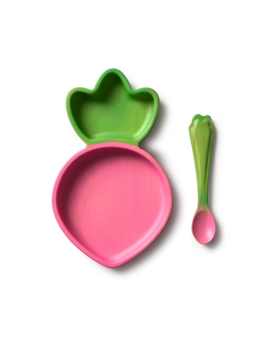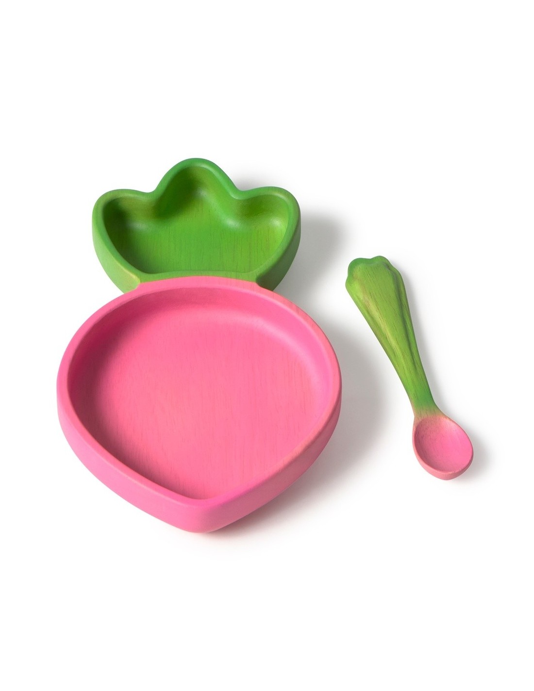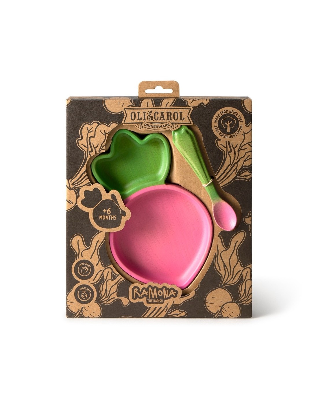 La vajilla Ramona the Radish es el juego de mesa más moderno para bebés. El juego consta de un plato y una cuchara hechos a mano con madera de Hevea, dando una segunda vida a los árboles que nos proporcionaron nuestros juguetes de goma. La alternativa más segura para los niñxs, ya que no contiene ftalatos.