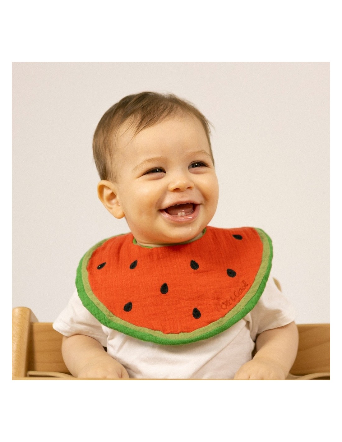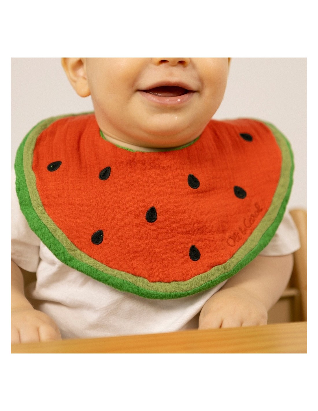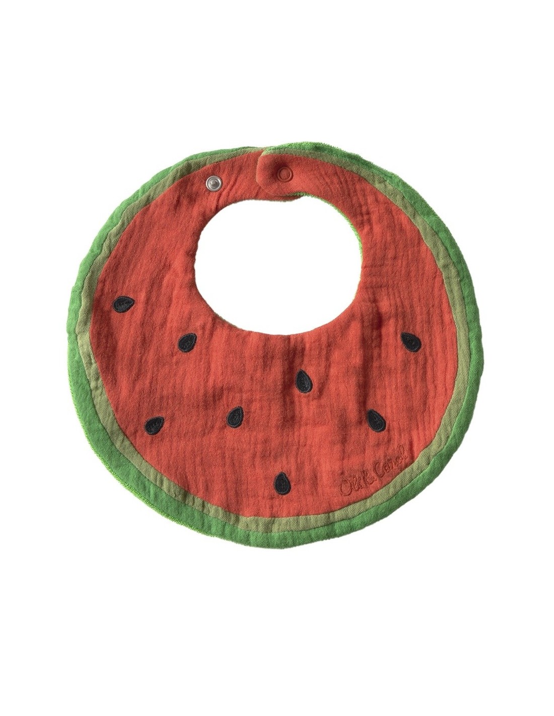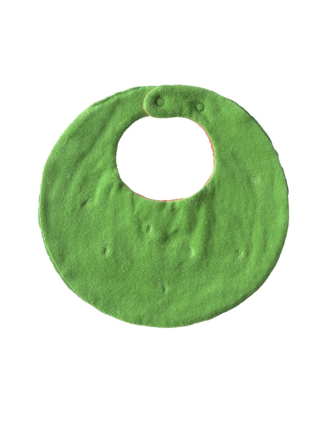 3 capas: muselina de algodón orgánico en la parte frontal, capa intermedia para mantener seco al bebé y rizo de algodón en la parte trasera para absorber.