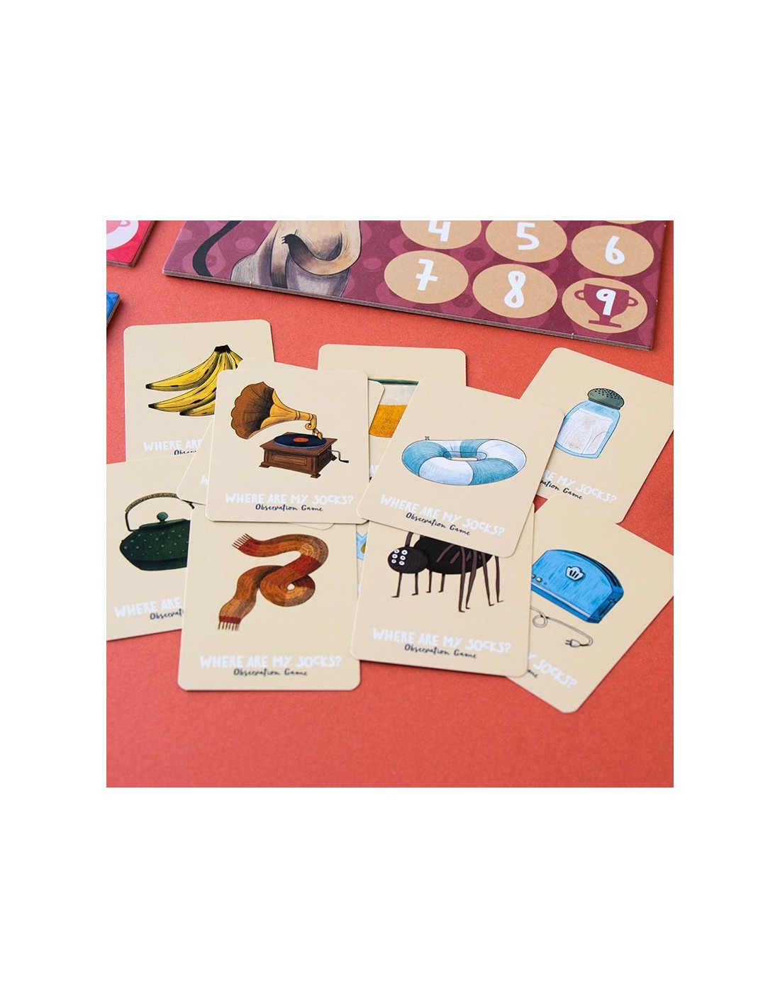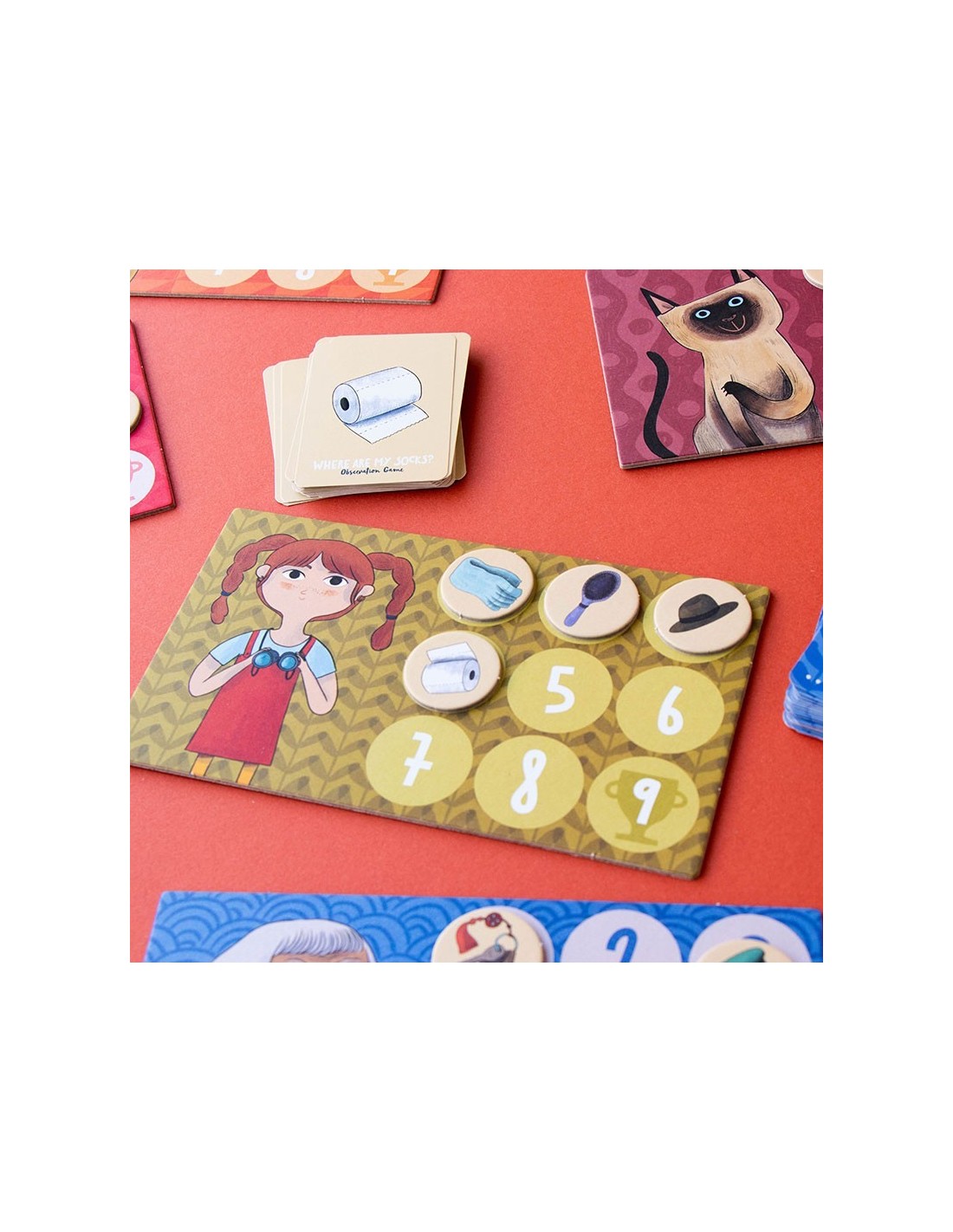 Todos los jugadores a la vez buscan el objeto entre las fichas y el más rápido en encontrarlo lo coloca sobre su tablero de personaje. ¡El primero que recoge 9 objetos gana!