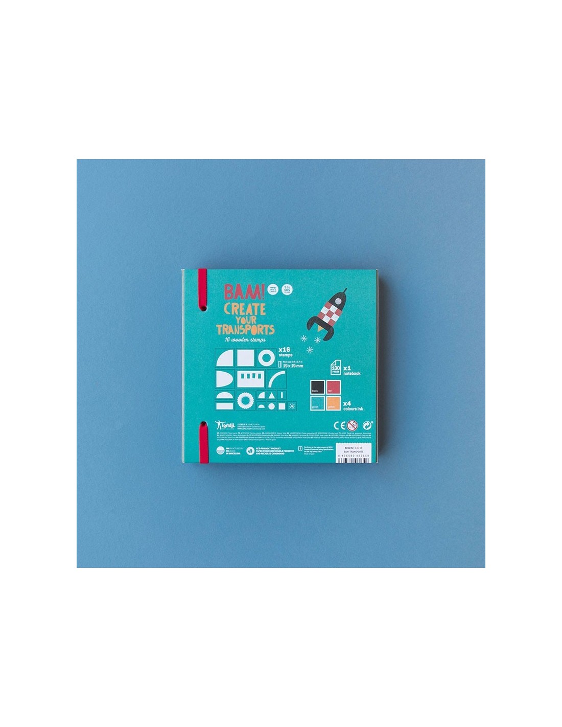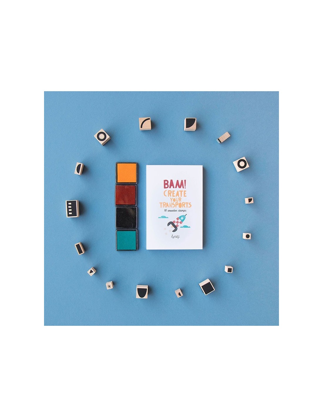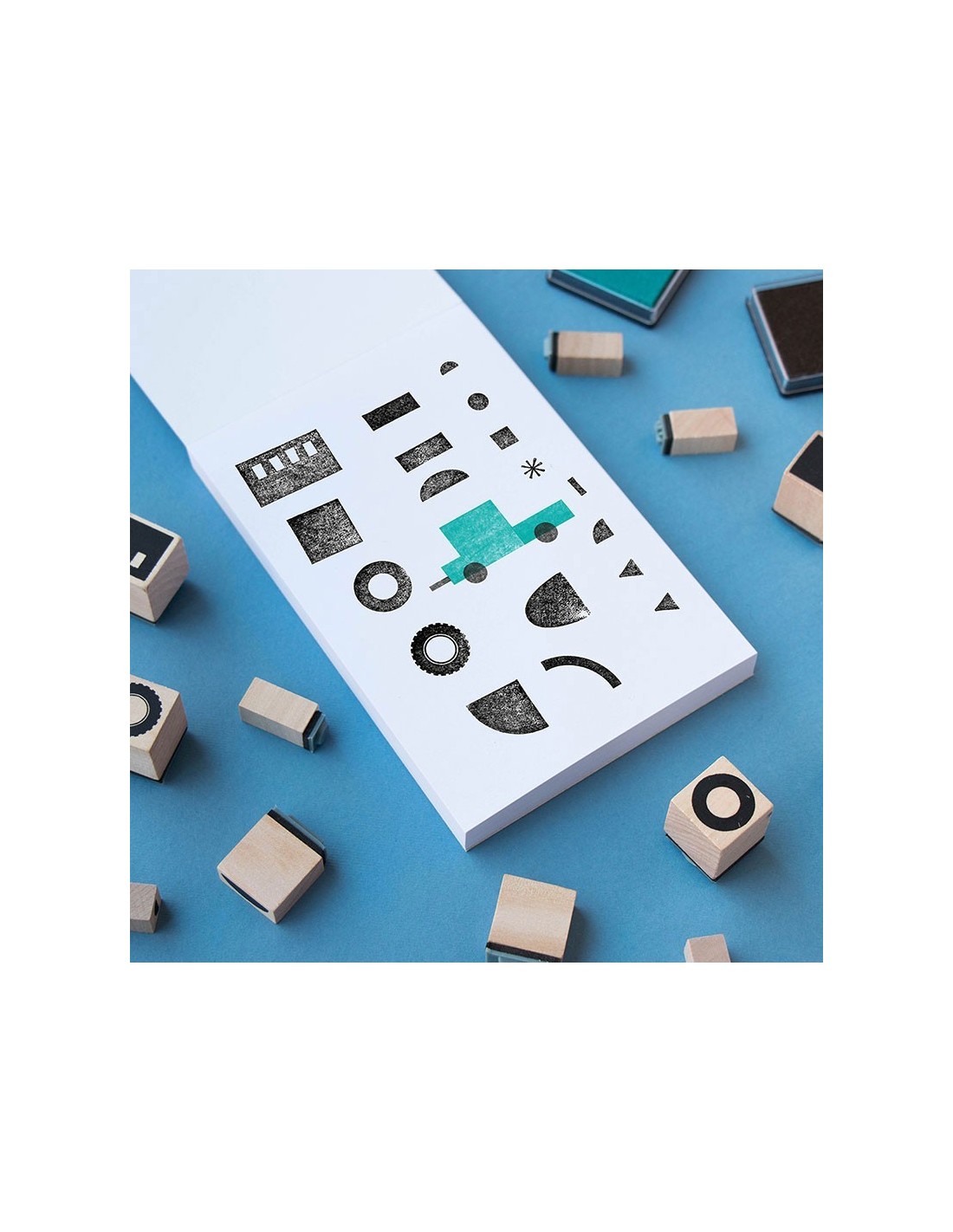 ¡Combinando nuestros tampones crearás coches, motos, cohetes, aviones y mucho más! ¡16 tampones de madera y 4 colores de tinta con libreta incluida para tus creaciones!