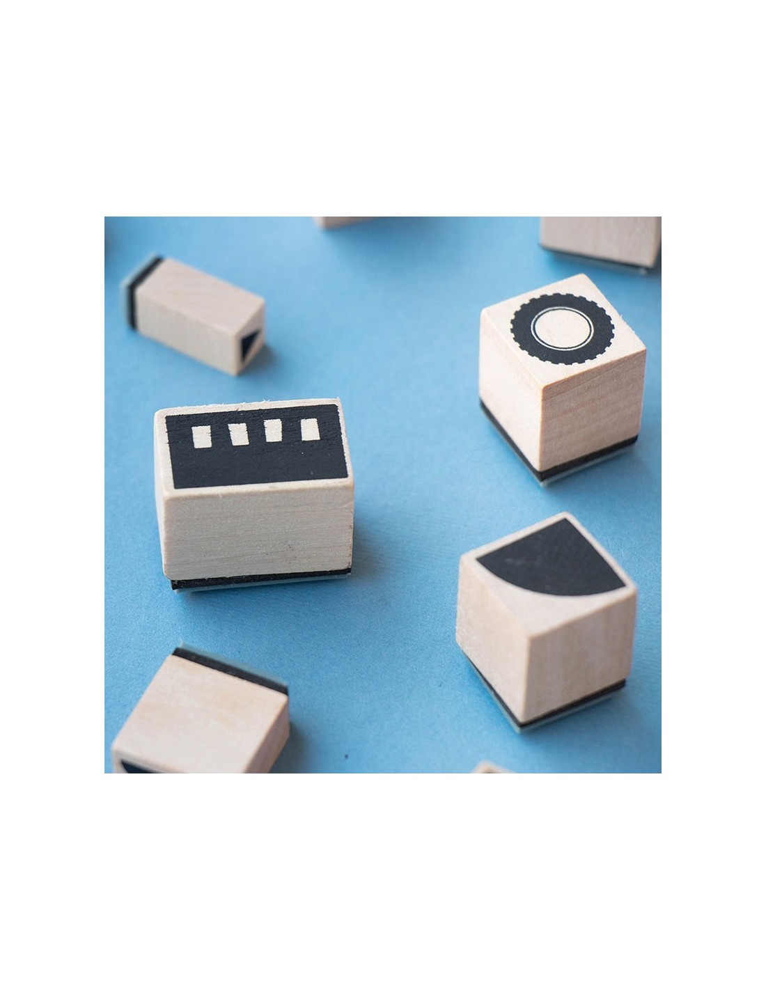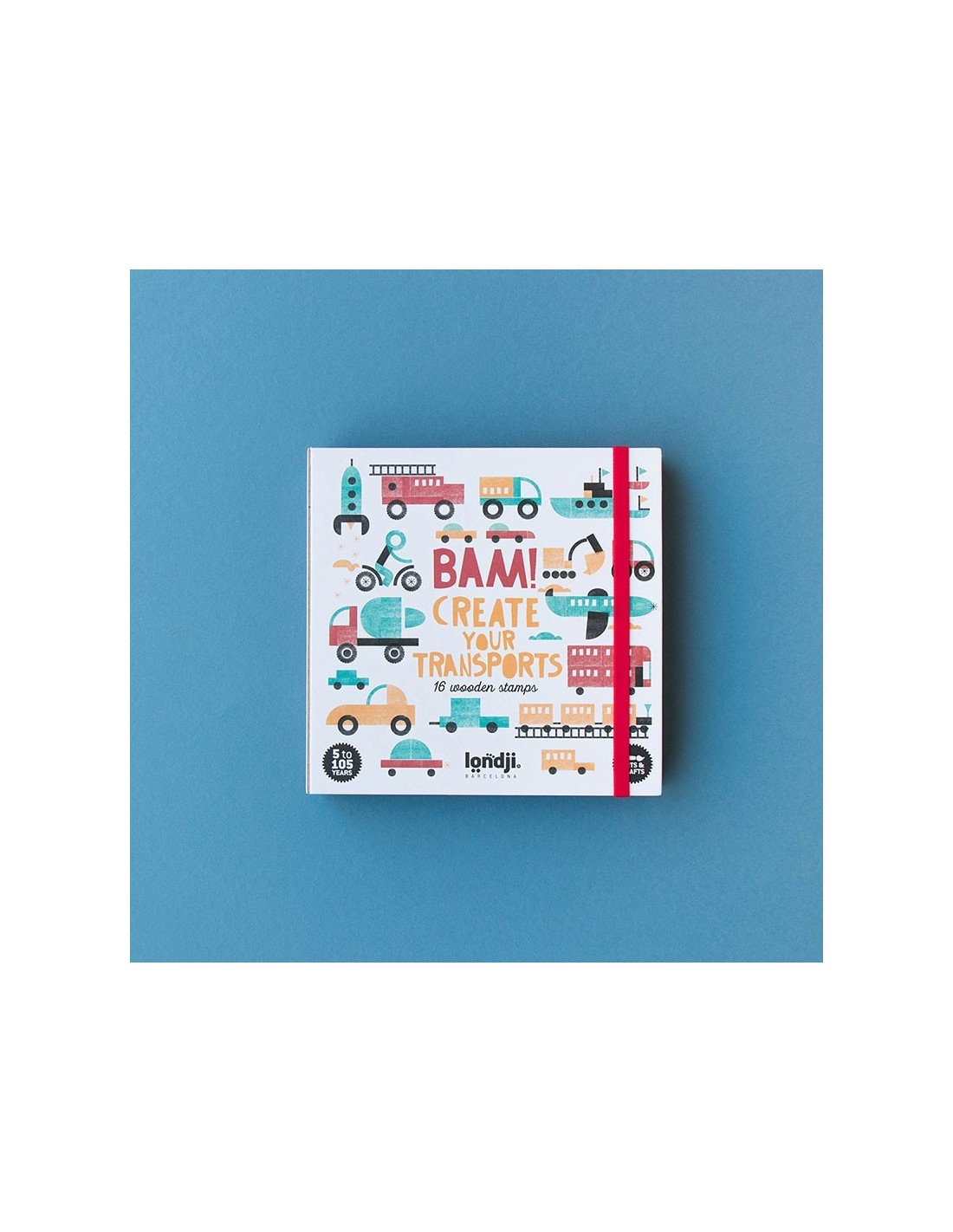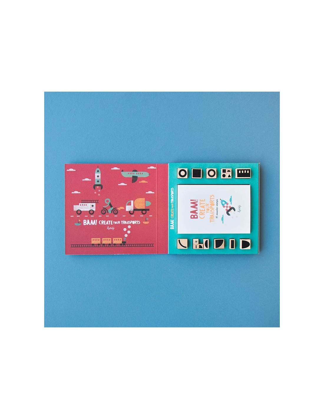 ¡Combinando nuestros tampones crearás coches, motos, cohetes, aviones y mucho más! ¡16 tampones de madera y 4 colores de tinta con libreta incluida para tus creaciones!
