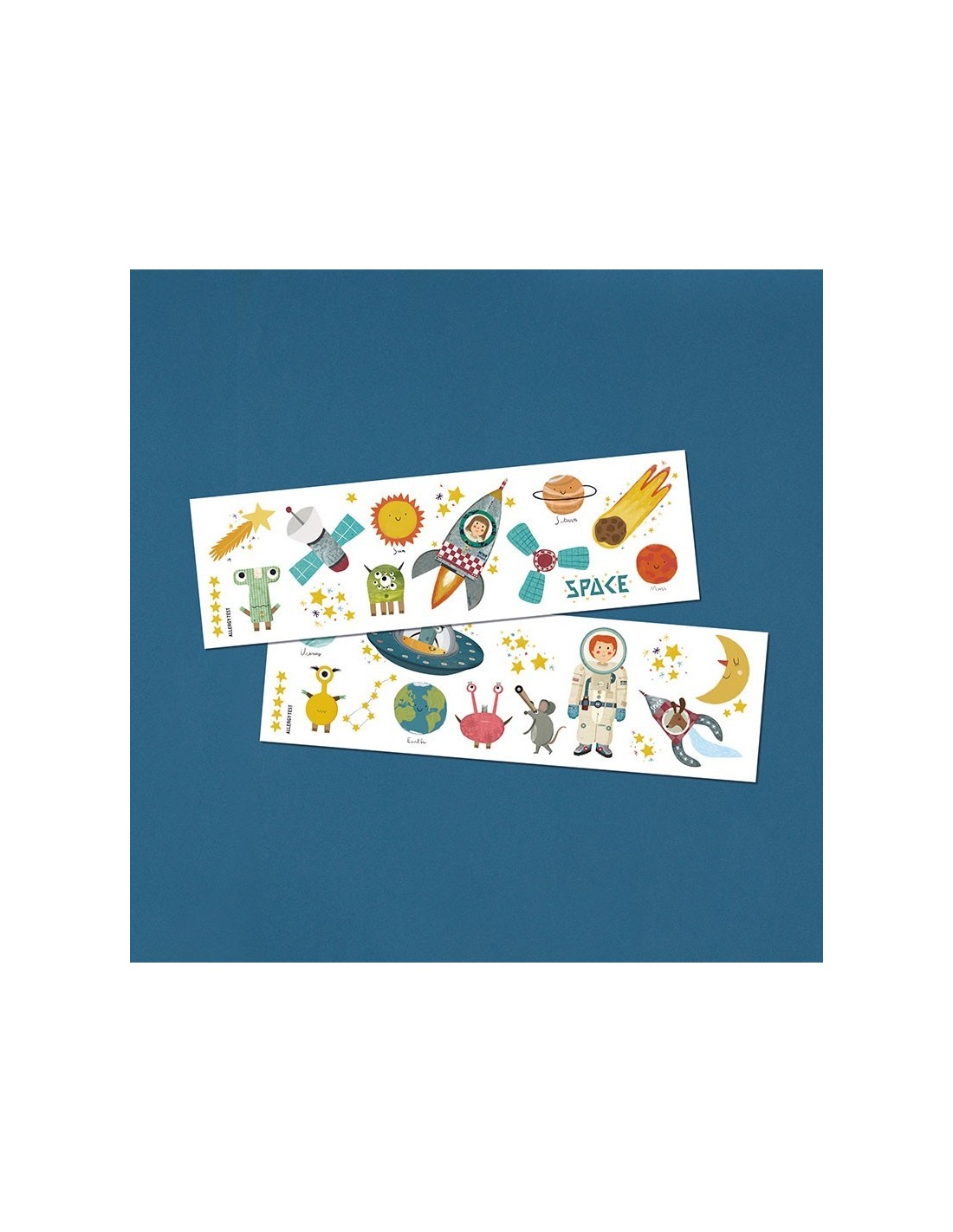 Astronautas, cohetes, planetas, extraterrestres… ¡Tenemos el placer de presentaros las fantásticas calcomanías del espacio! Son seguras, no tóxicas, muy divertidas y hechas en Europa.